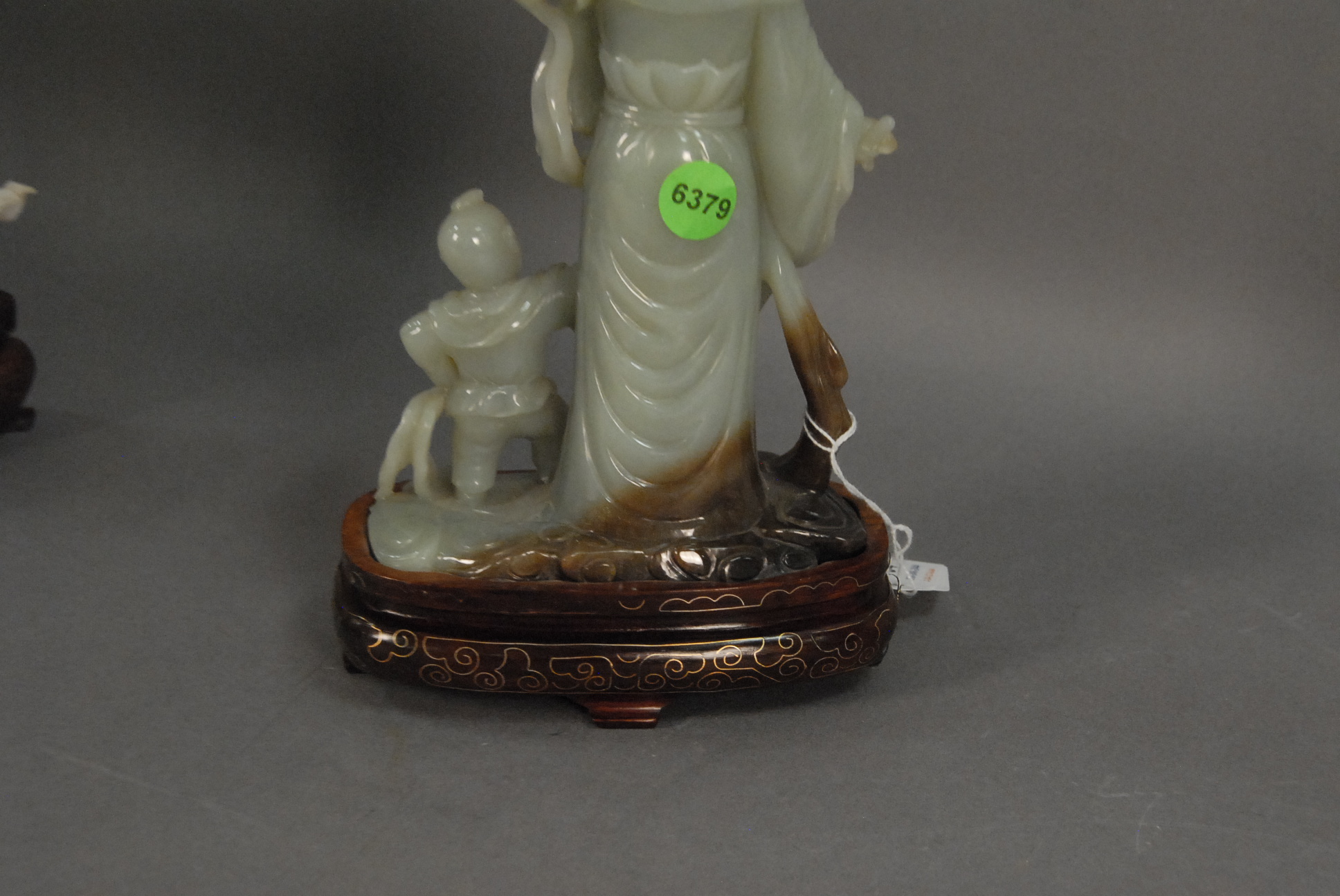 Lot 94: Large grey jade carved guanyin with young boy having ringed bracelet and russet colored hair with carved wood base, ht. 10 1/4, wd….
