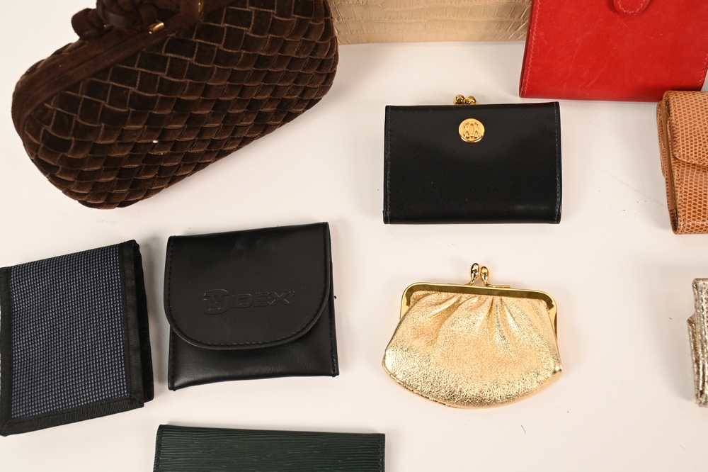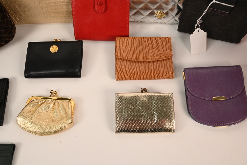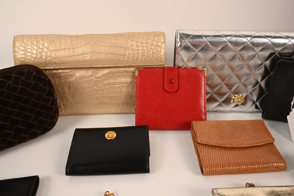 Lot of Leather, Fabric, and Skin Wallets, Clutches, and Small Purses, to include gold Nancy Gonzalez clutch, silver quilted by Jay Hebert, brown velvet by Bottega Veneta, Gucci logo wallet and others, all having normal wear.