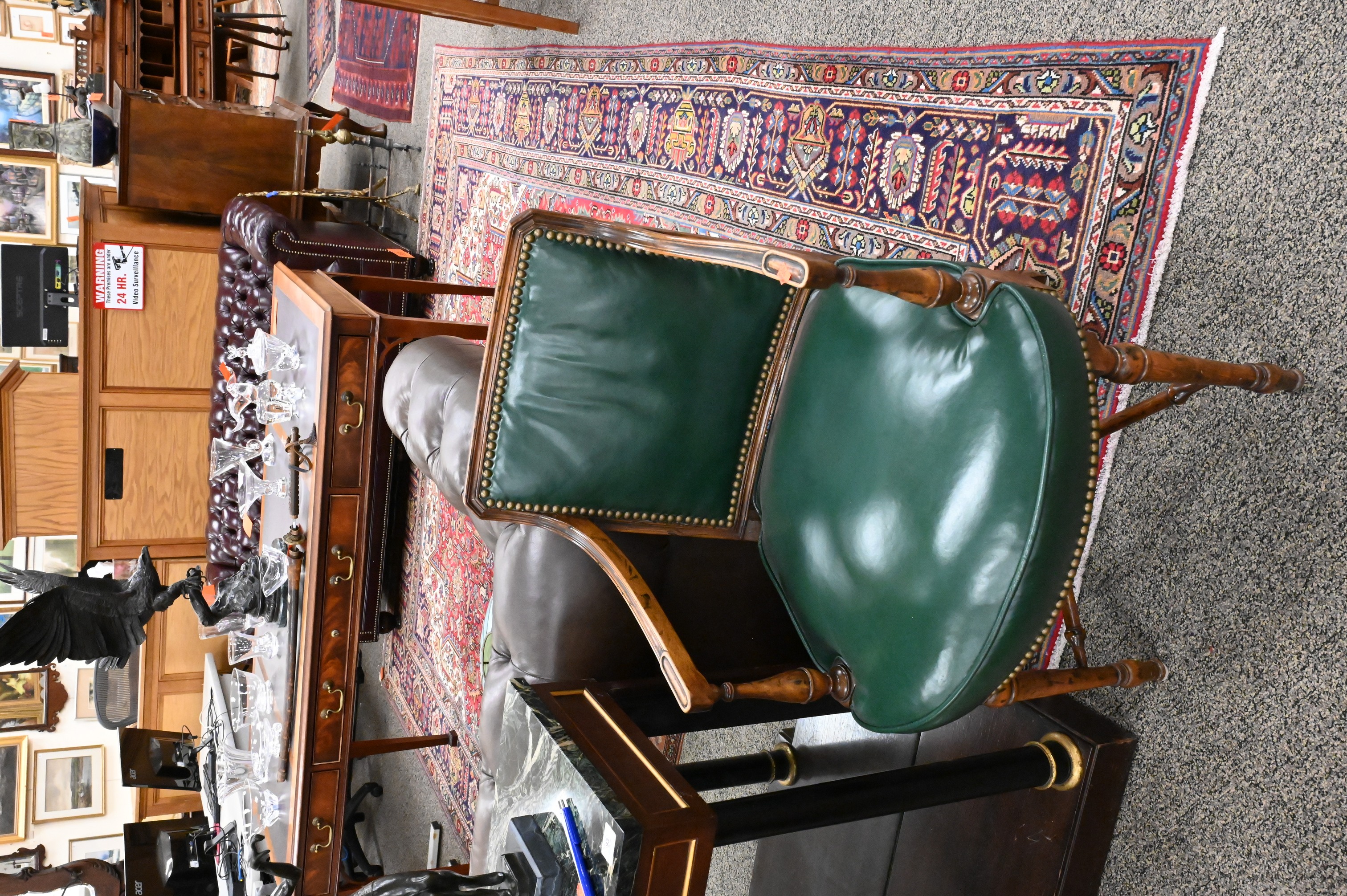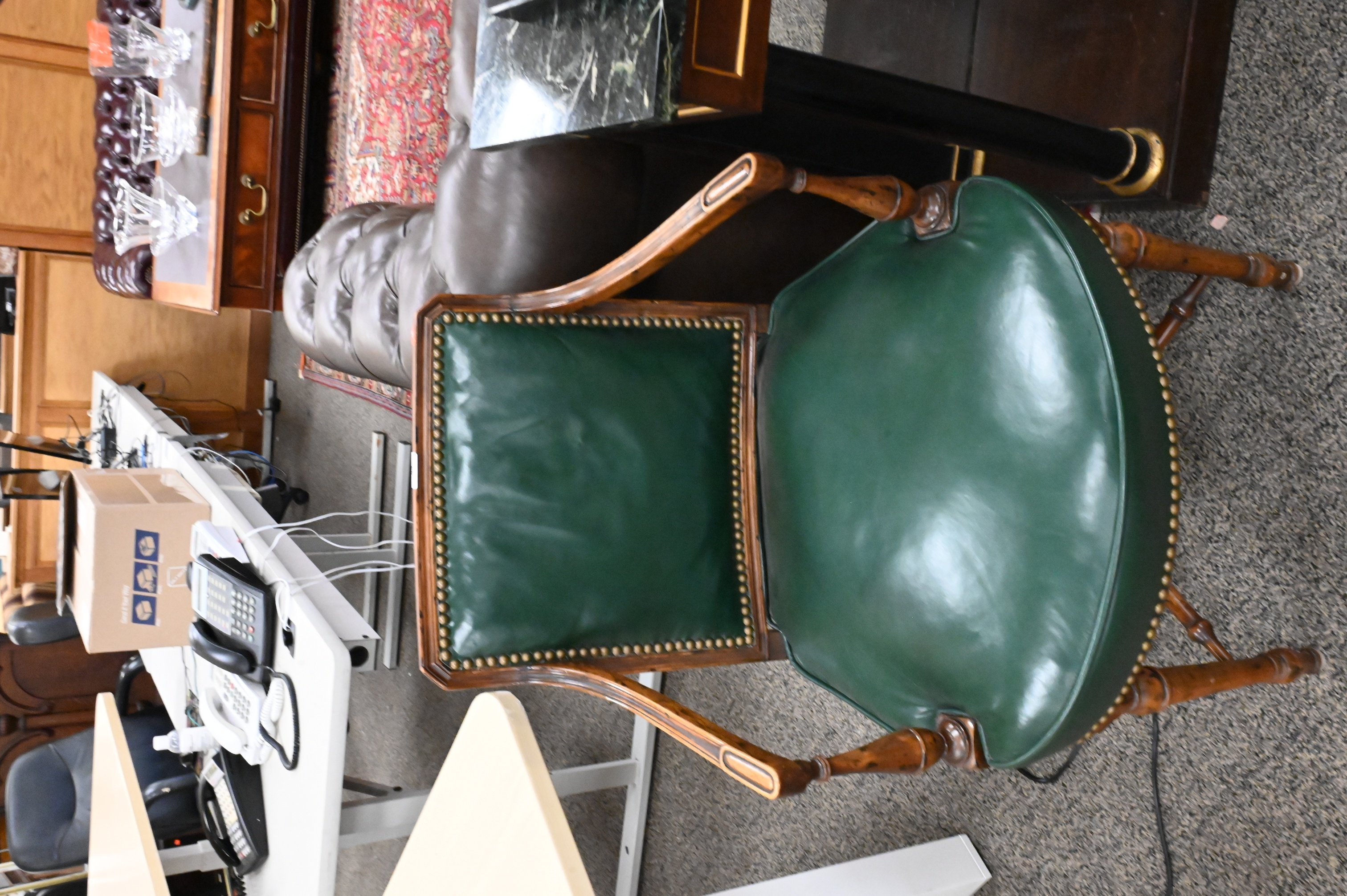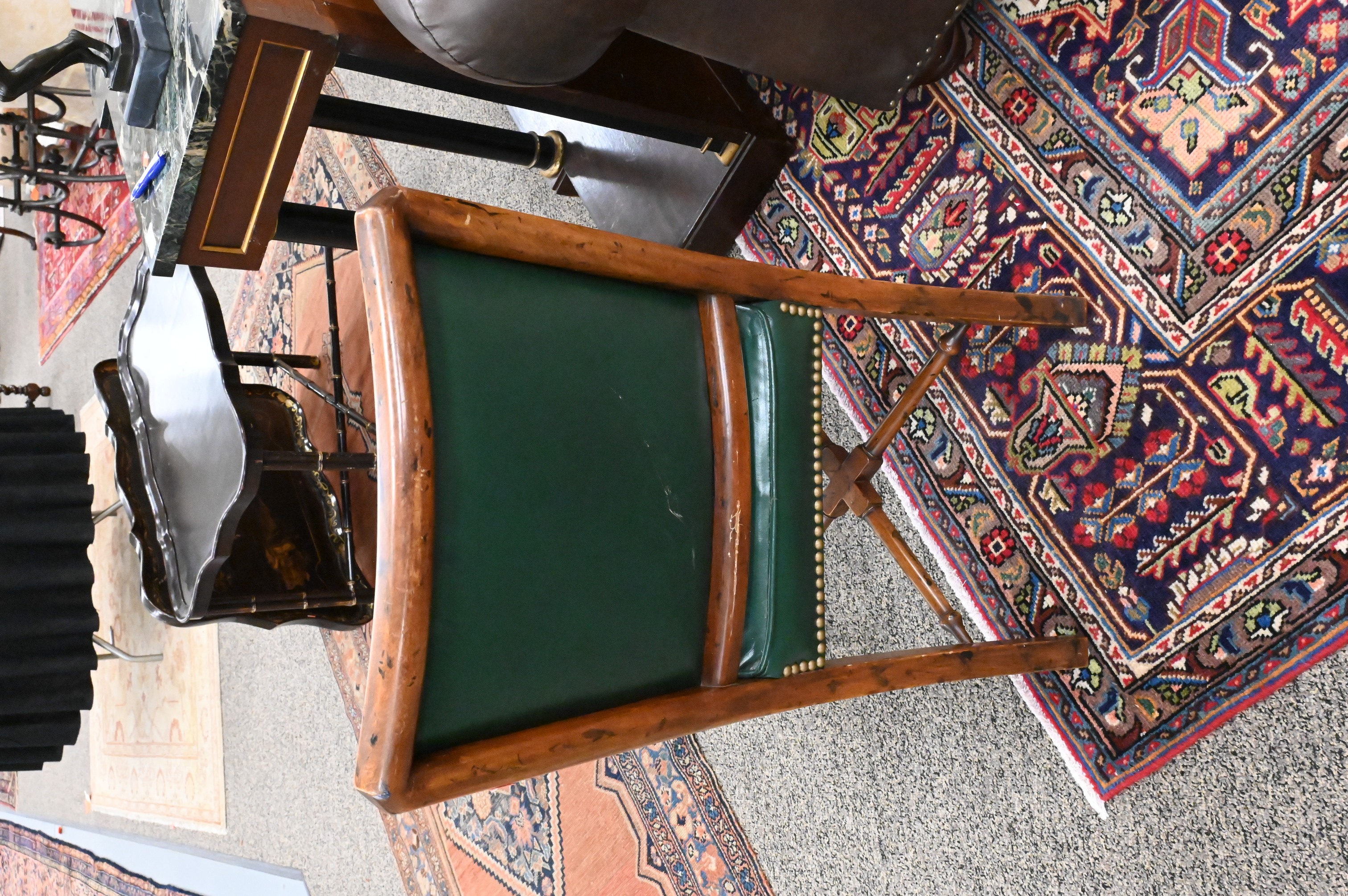 having leather backs and seats with brass tacks, raised on turned legs with X stretcher