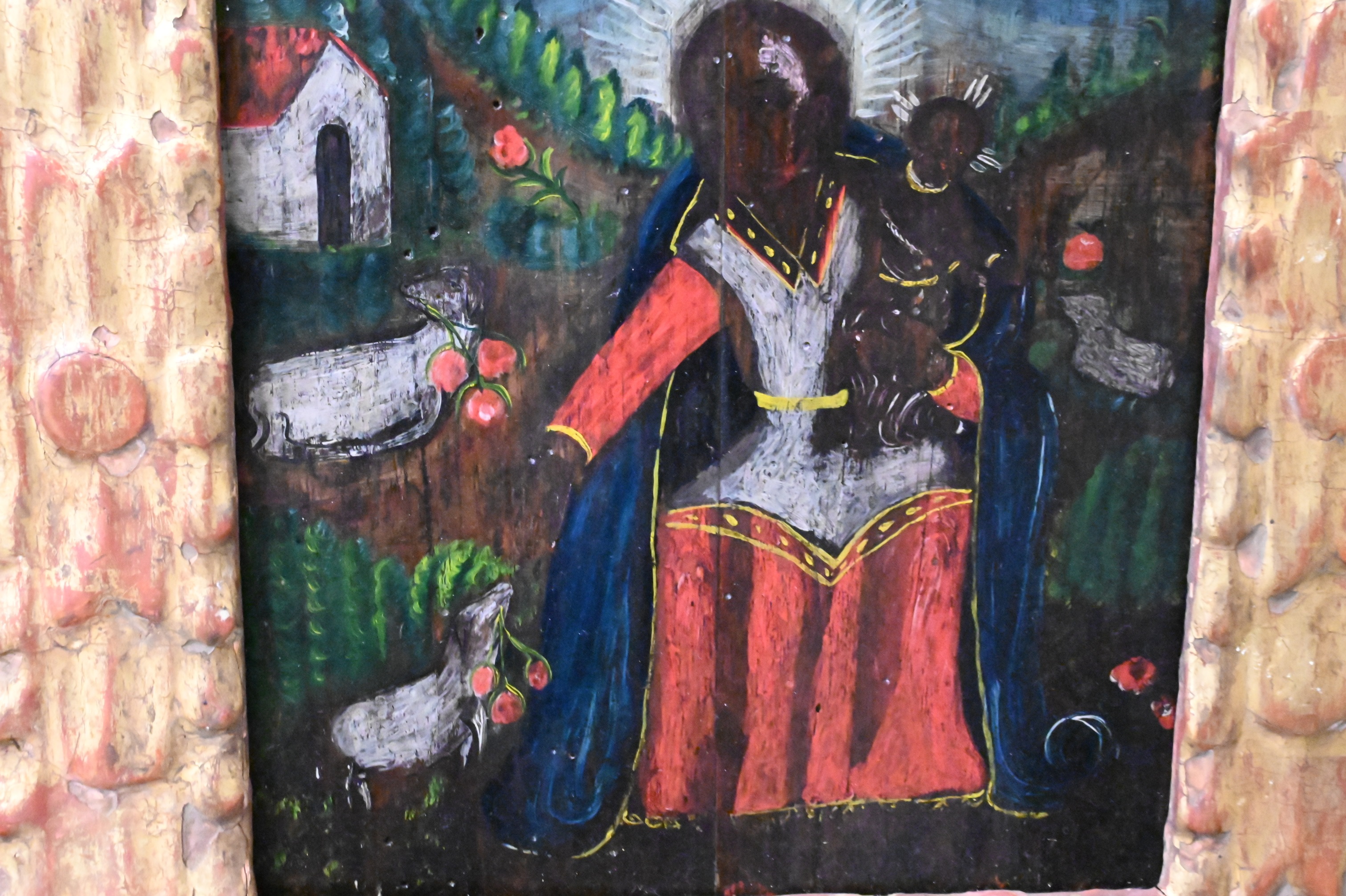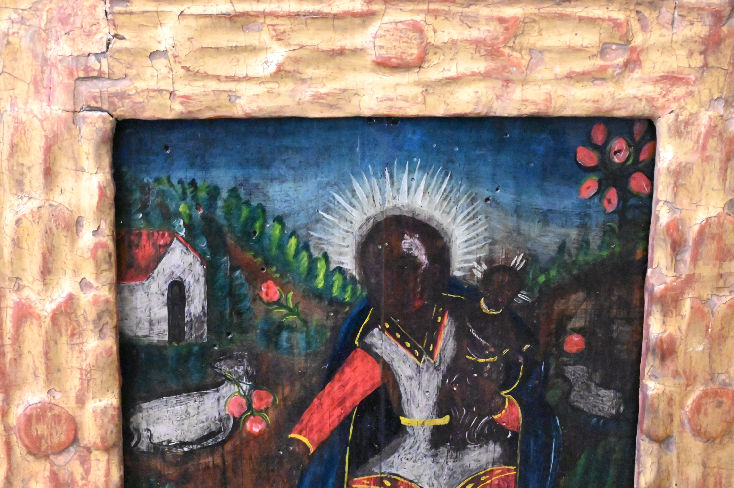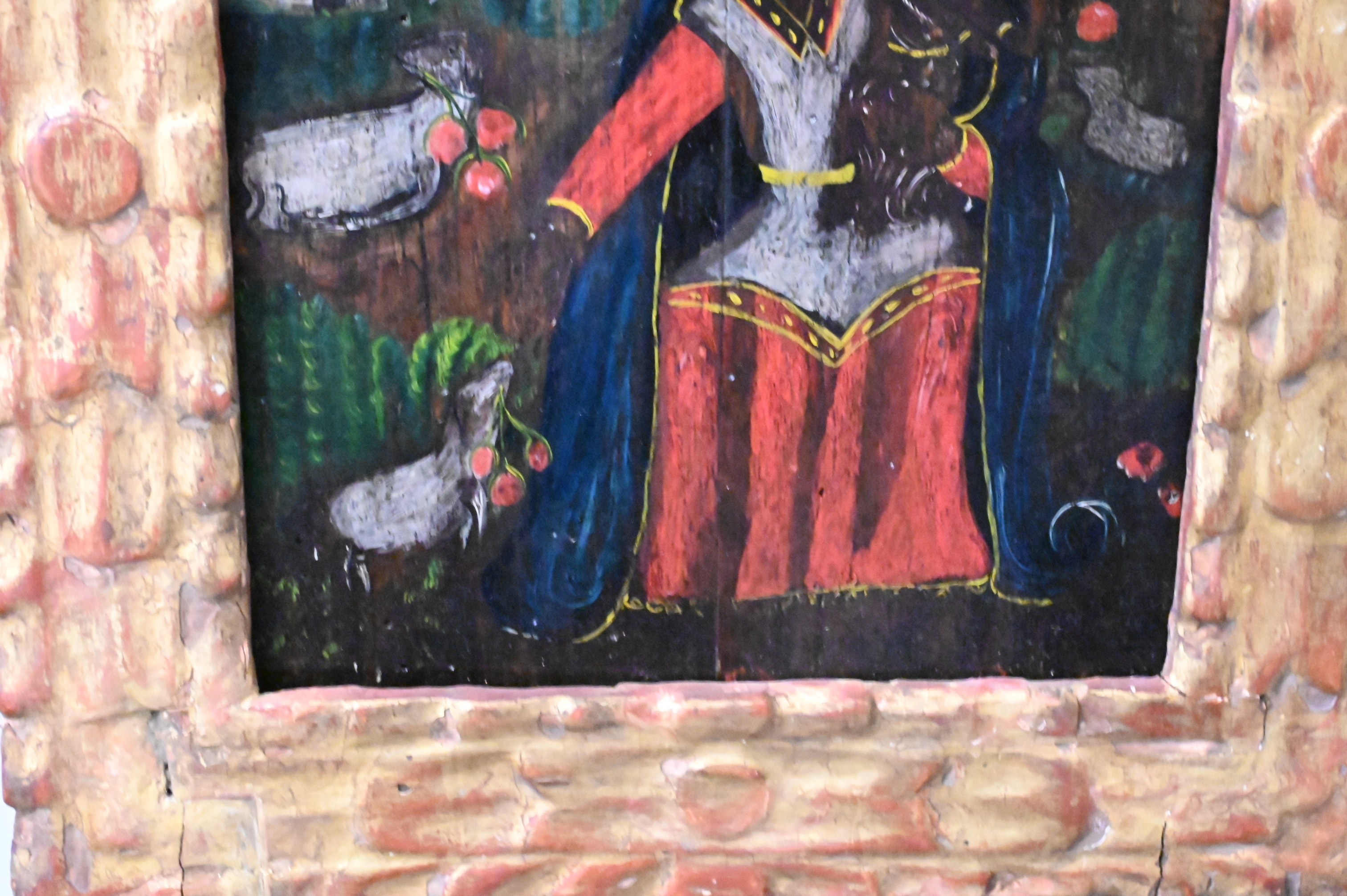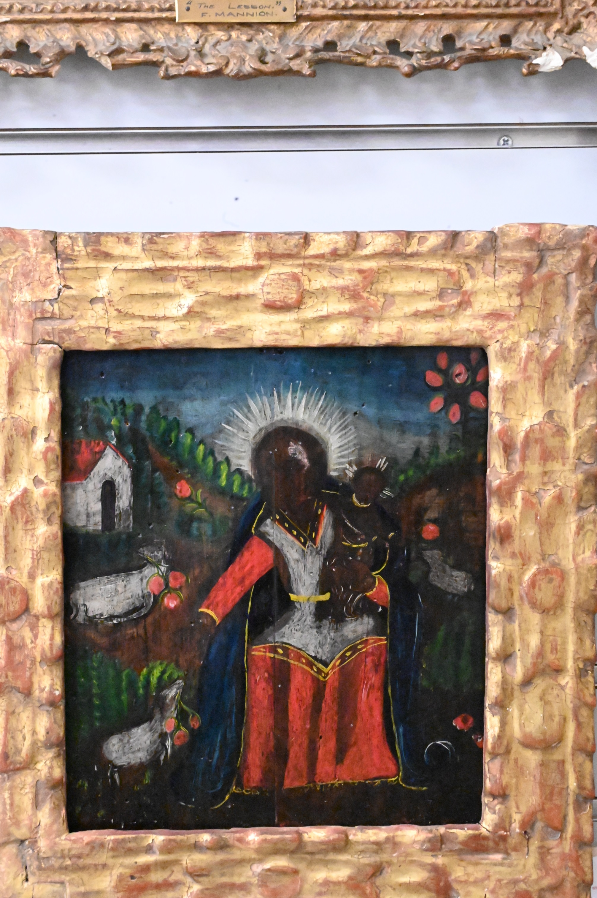 Peruvian Religious Painting, Virgin and Child with Sheep, oil on wood panel, 19th century or earlier, 12″ x 10″, Provenance: Christie’s New York 10/83.