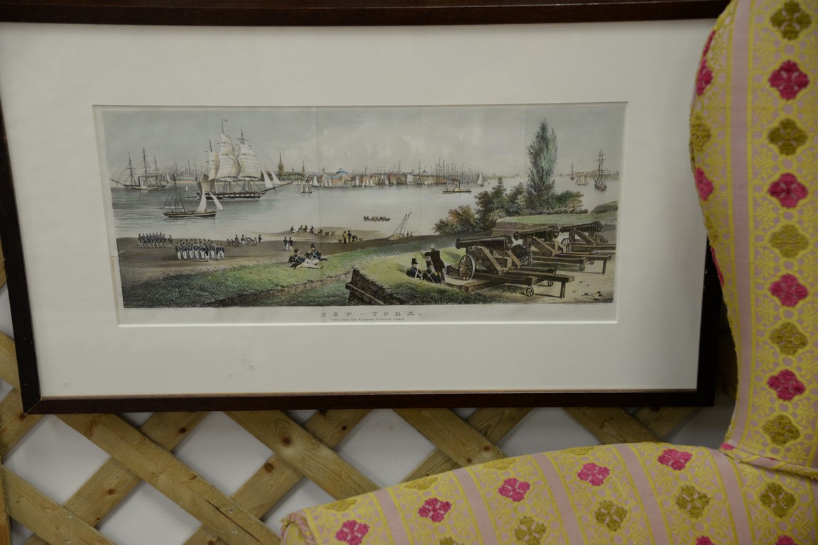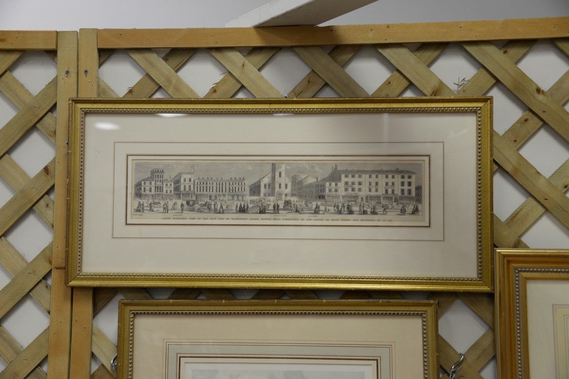 Six handcolored engravings and lithographs prints including A View of the City of Boston the Capitol of New England after Governor Thomas Pownall, A View of Fort George with the City of New York from the S.W. 1740 by Geo. Hayward, New York taken from Fort Columbus Governor’s Island print, Panoramic View of Washington Street Boston, House of Refuge Randal’s Island NY 1860, and Plymouth Congregation Church sight size 4 1/2 x 20 1/2 to 9 3/4 x 12 3/4. Provenance: Property from Credit Suisse’s Americana Collection