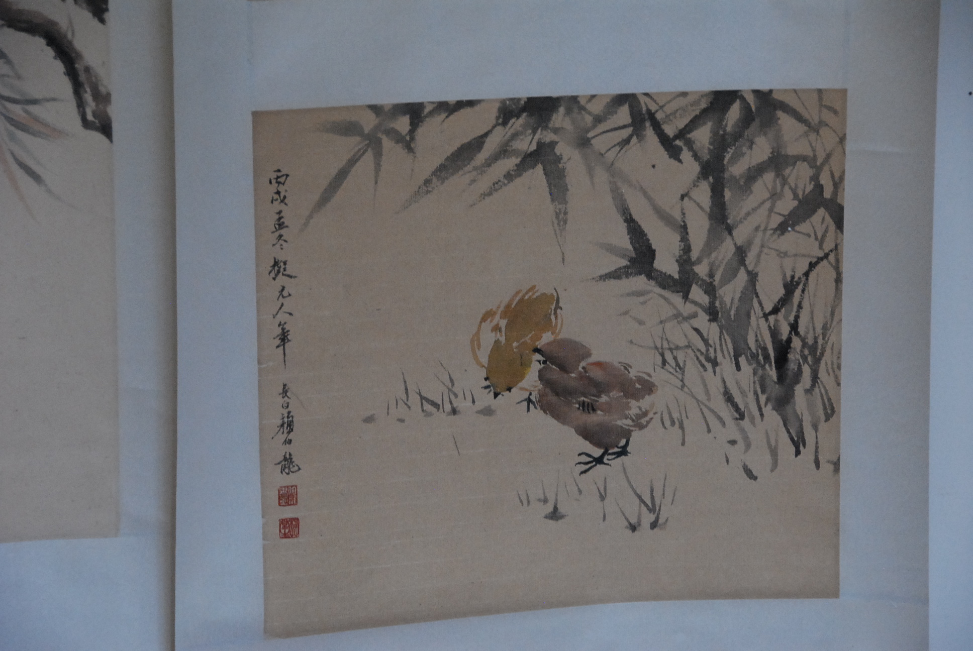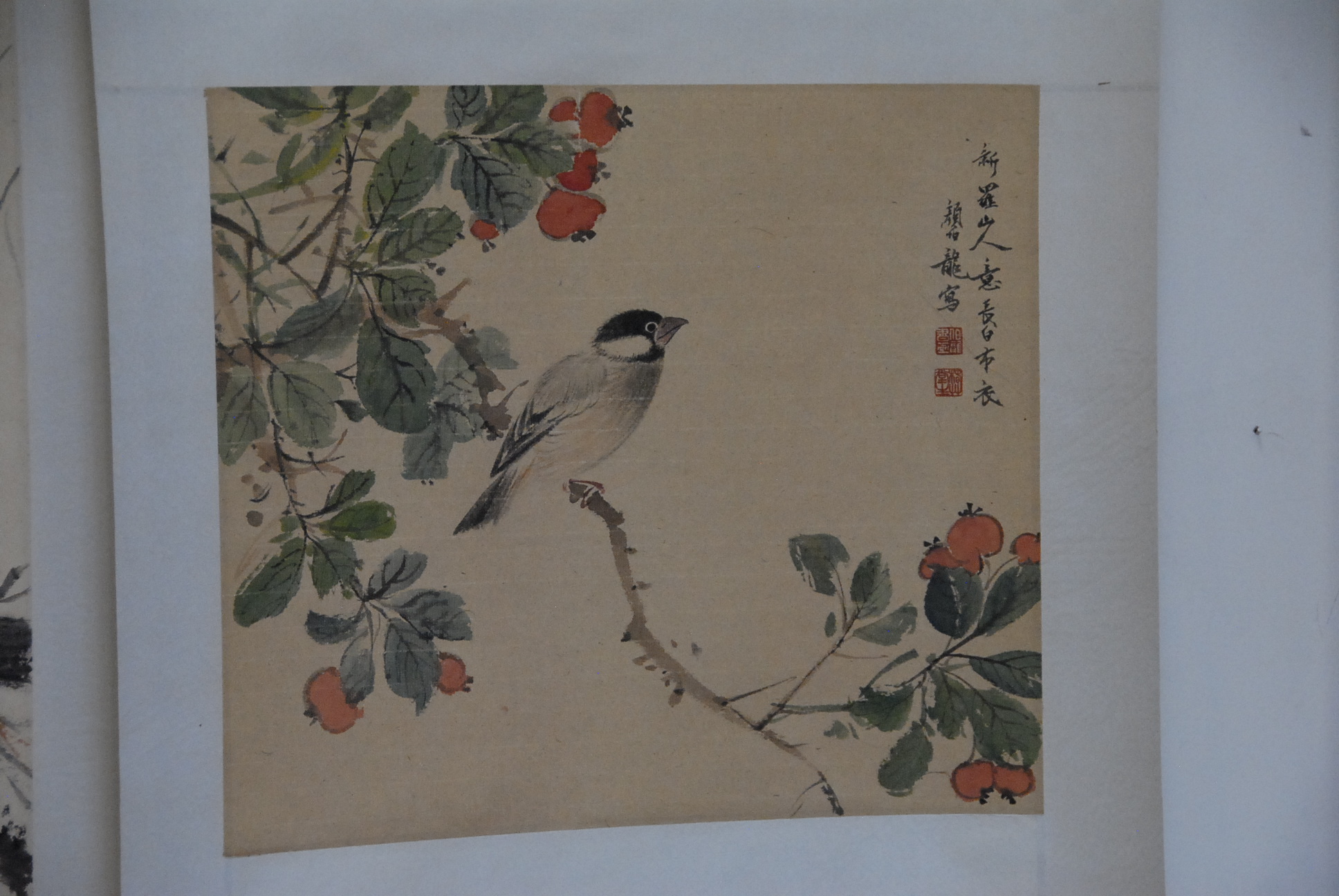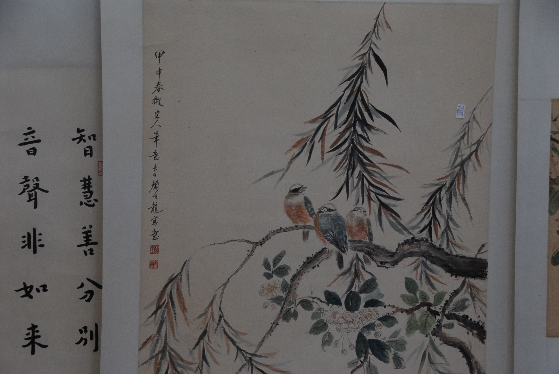 Three Oriental scrolls, watercolor with two scholars and characters 39 x 19, watercolor birds on branch 35 x 22, two watercolors of birds 32 x 17.