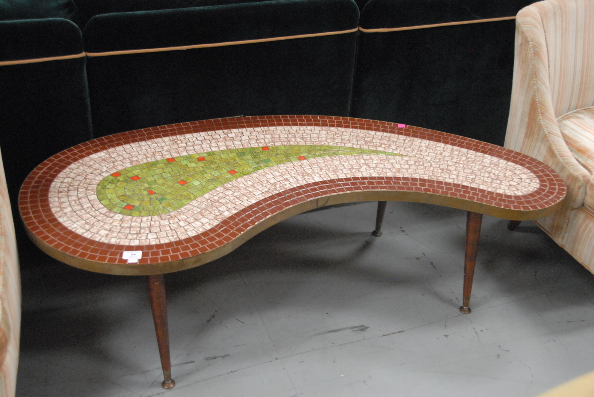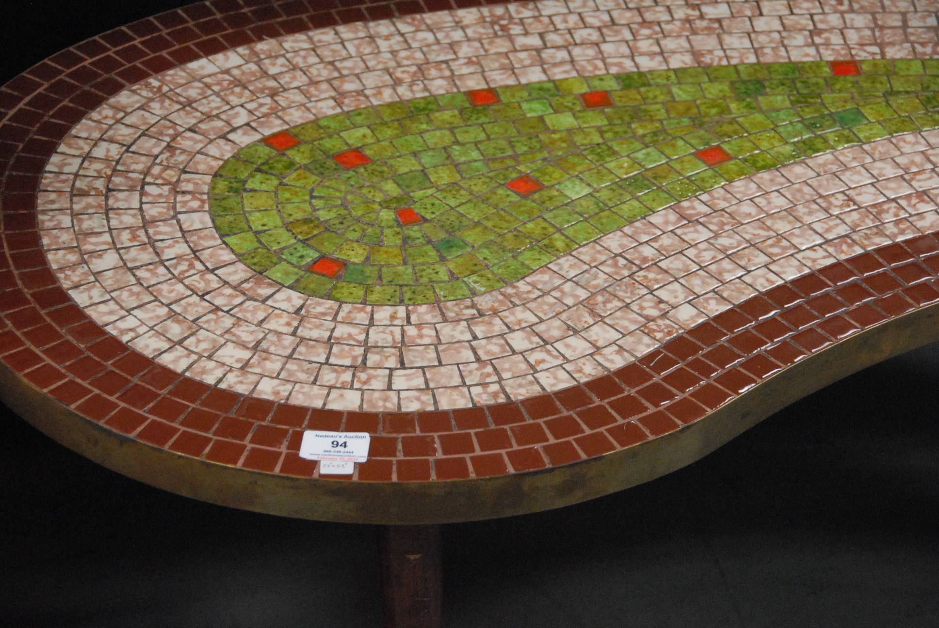 Tile top coffee table with brass banding and wood legs, 23 x 53.