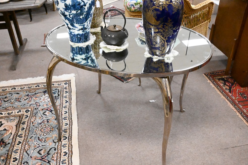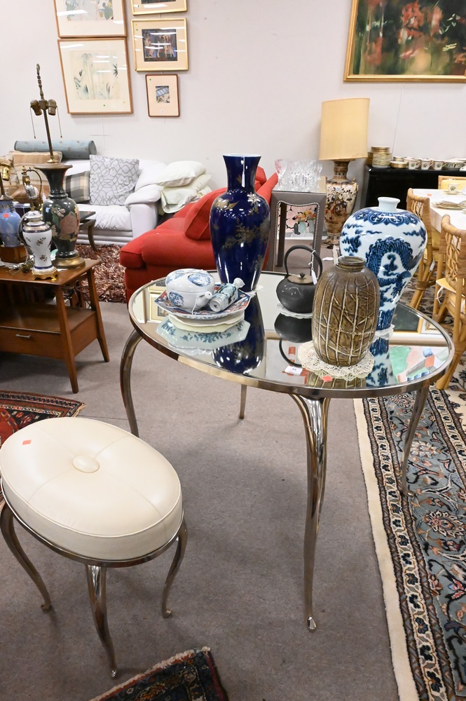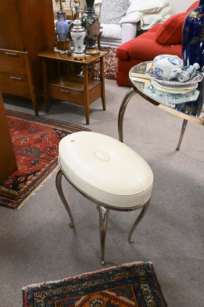 Lot 94: Two Piece Lot, to include a chrome mirrored top oval desk, height 30 inches, top 32″ x 42″; along with a matching stool having leather upholstered top.