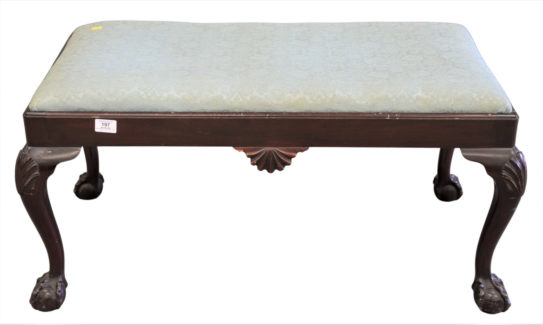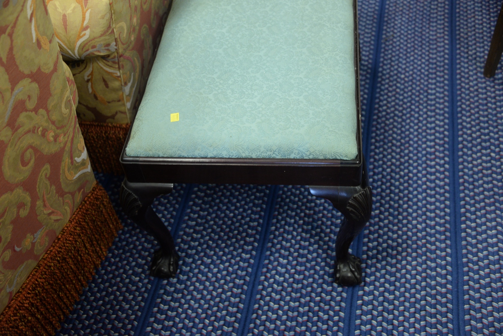 Lot 94: Two Piece Lot, to include mahogany china cabinet having leaded doors, height 56 inches, width 33 inches, depth 12 1/2 inches along with a Potthast Furniture Chippendale style bench having upholstered top and ball and claw feet, height 17 1/2 inches,