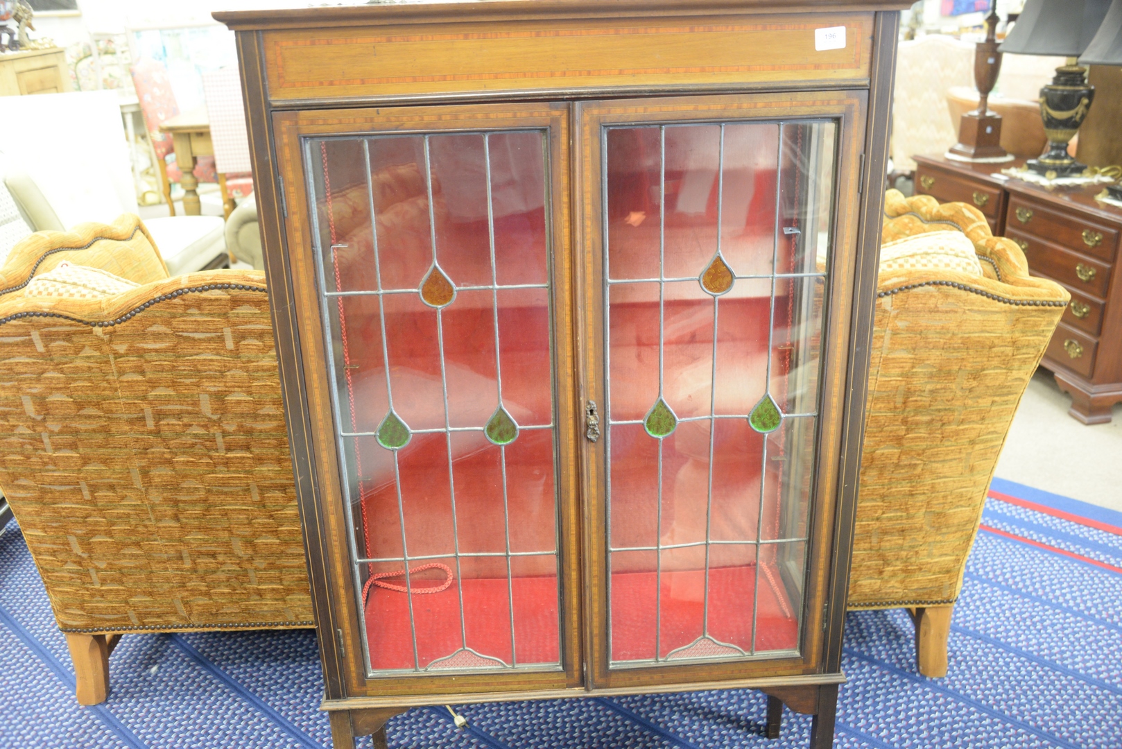 Two Piece Lot, to include mahogany china cabinet having leaded doors, height 56 inches, width 33 inches, depth 12 1/2 inches along with a Potthast Furniture Chippendale style bench having upholstered top and ball and claw feet, height 17 1/2 inches, length 33 1/2 inches, top 18 x 35 1/2.