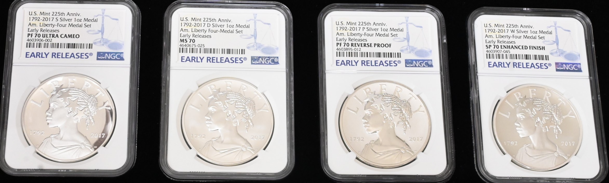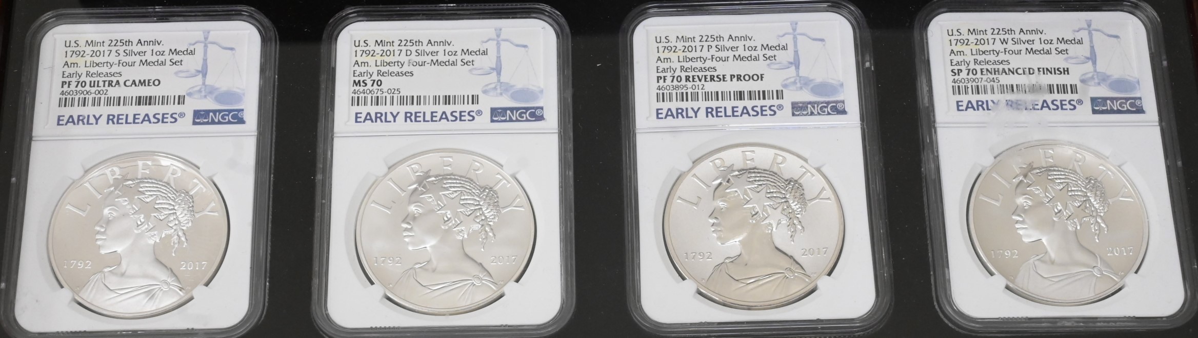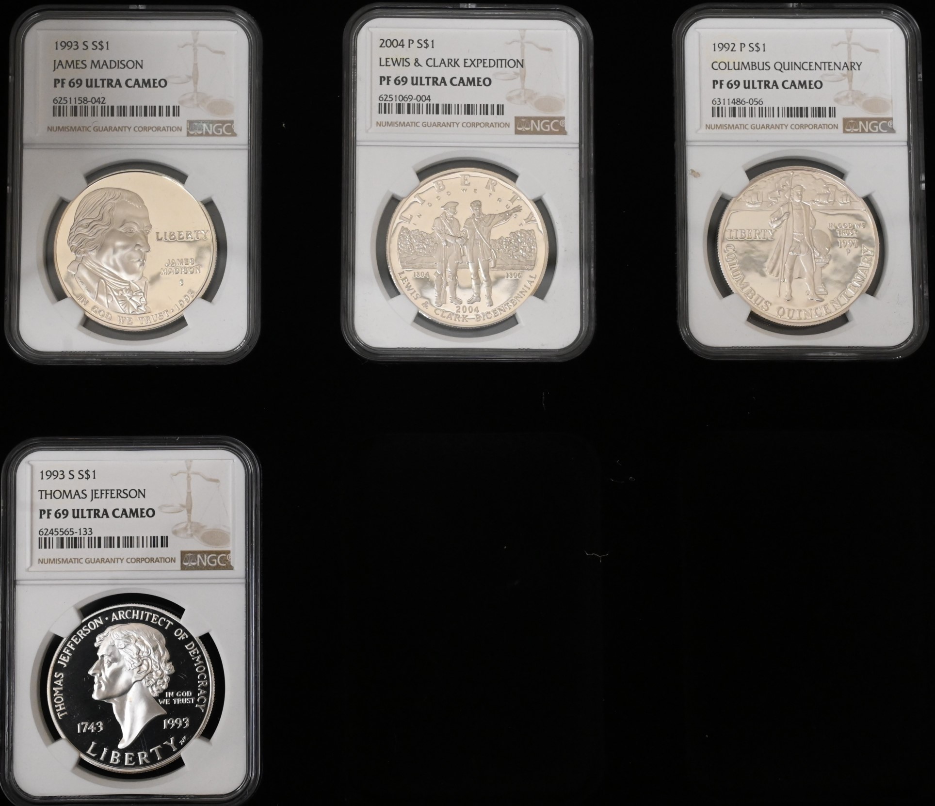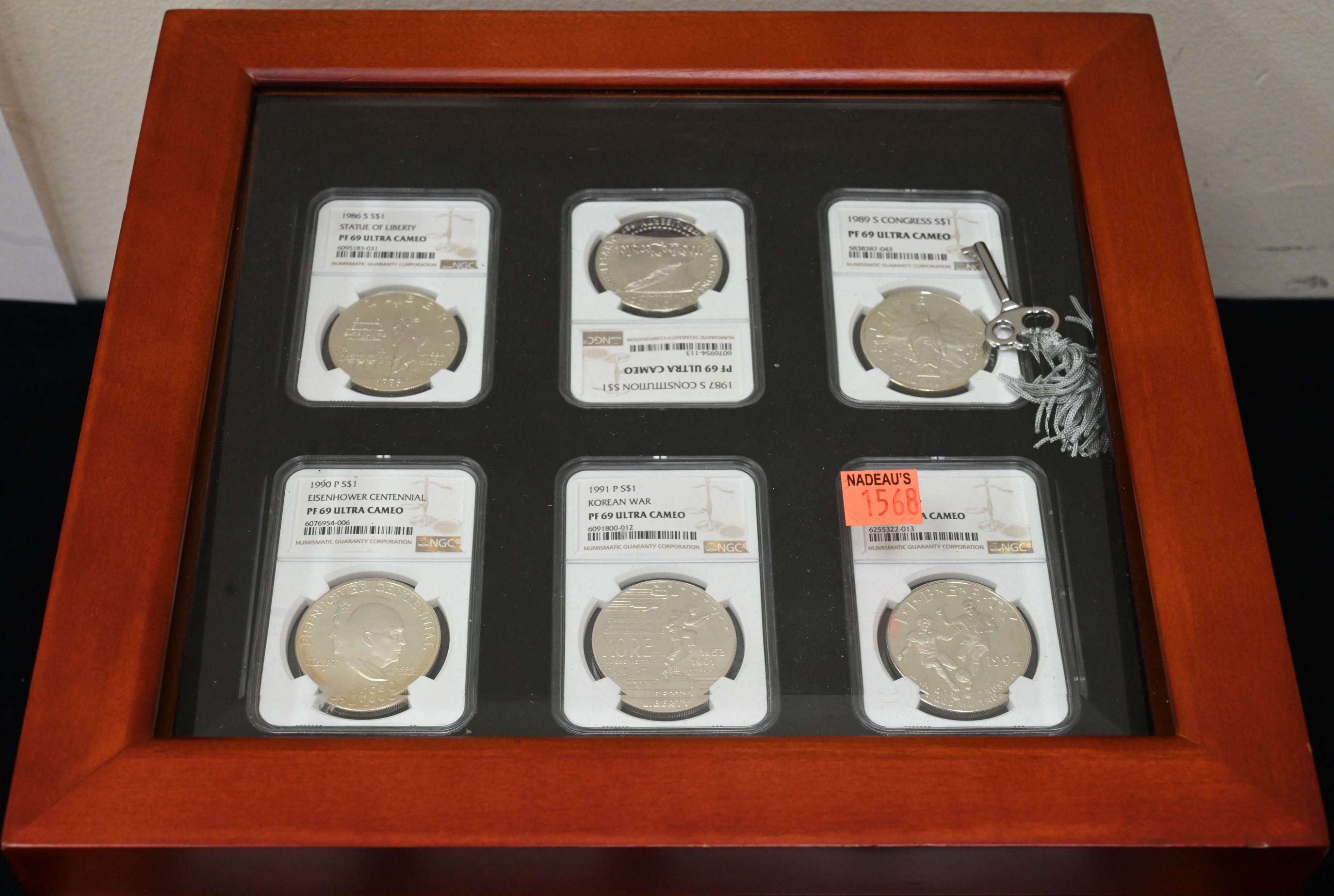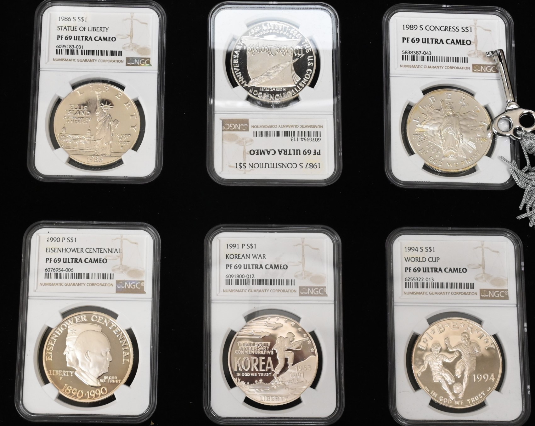 14 Piece Silver Coin Lot, to include presentation case with modern U.S. dollars commemorative all NGC Proof 69 Ultra Cameo, also 4 piece box with NGC MS70 Silver commemoratives, plus 10 pieces of Statue of Liberty commemoratives, In proof.