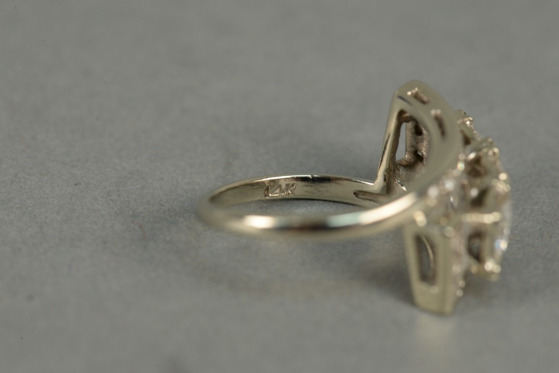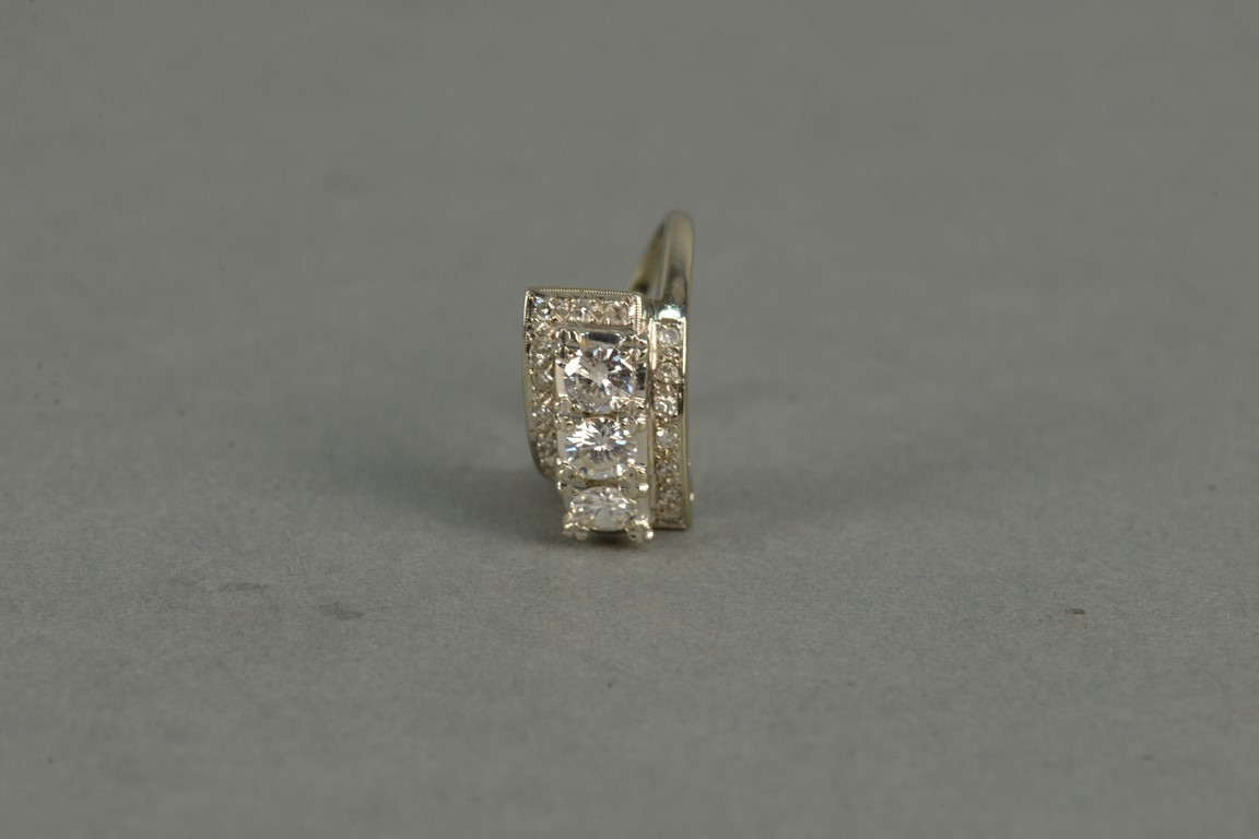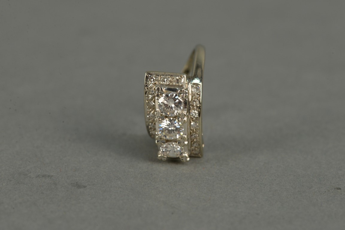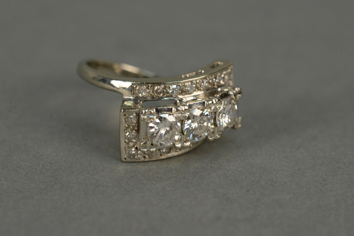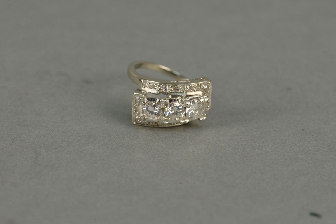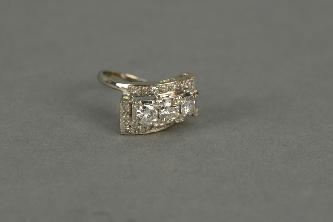 Lot 95: 14K ladies ring set with three round diamonds surrounded by 18 small diamonds, three large stones total weight 1.65cts.