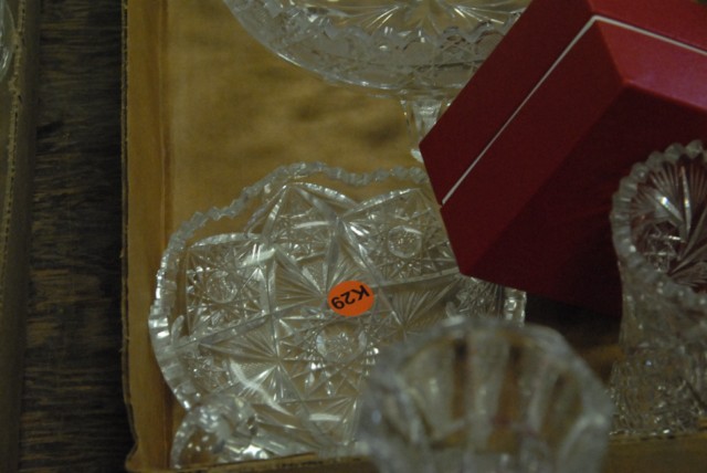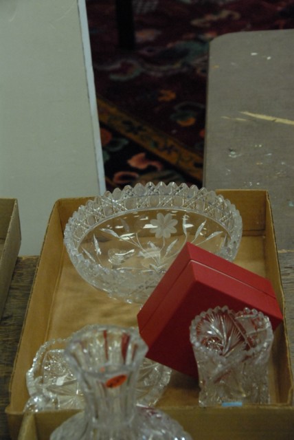 4 box lots to include 5 pieces of cut glass, punch bowl base, carafe, vase, 2 dishes, plus pressed glass dishes and various other items.