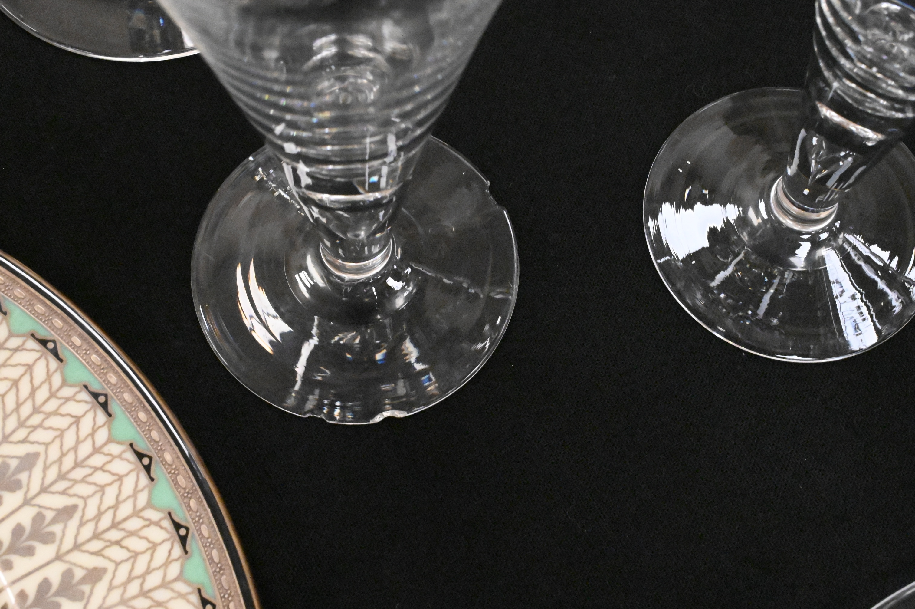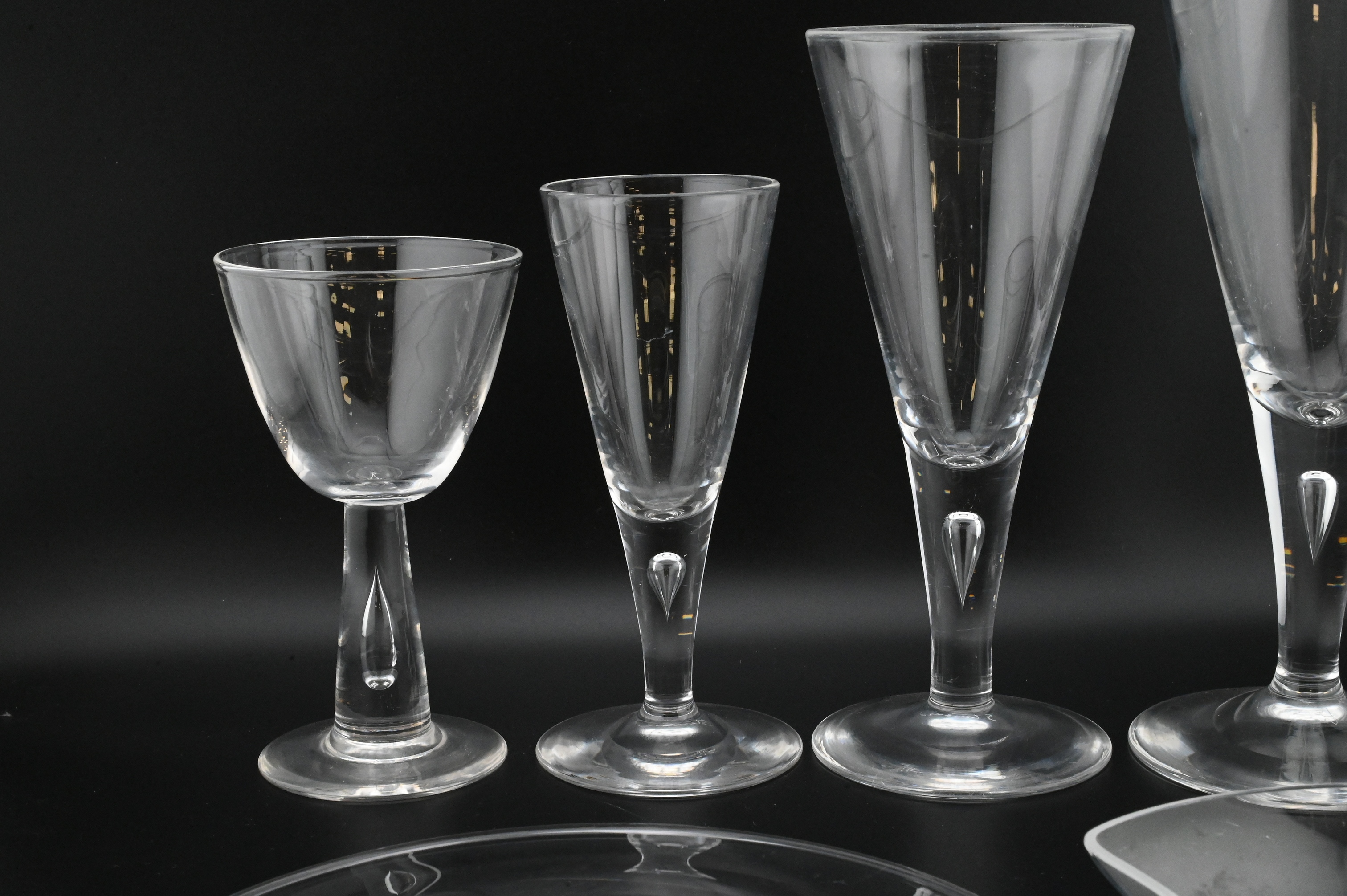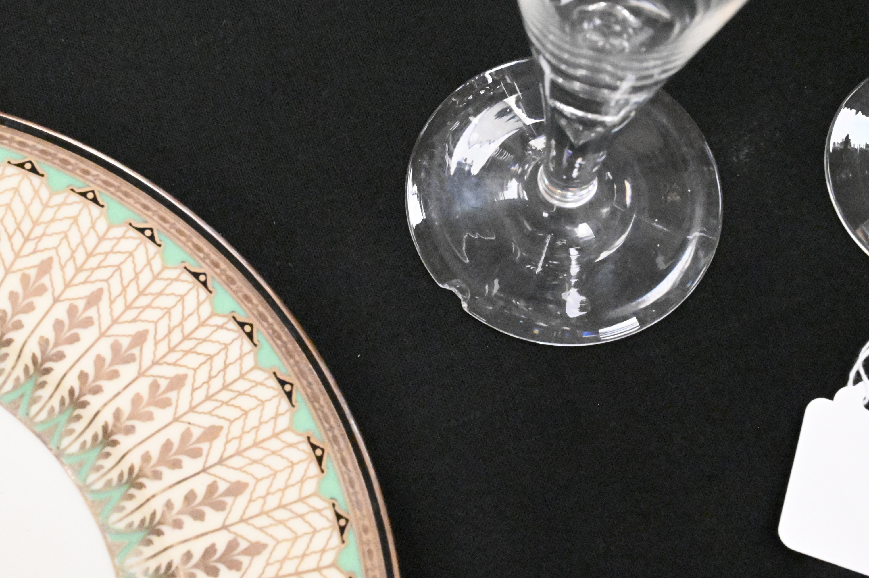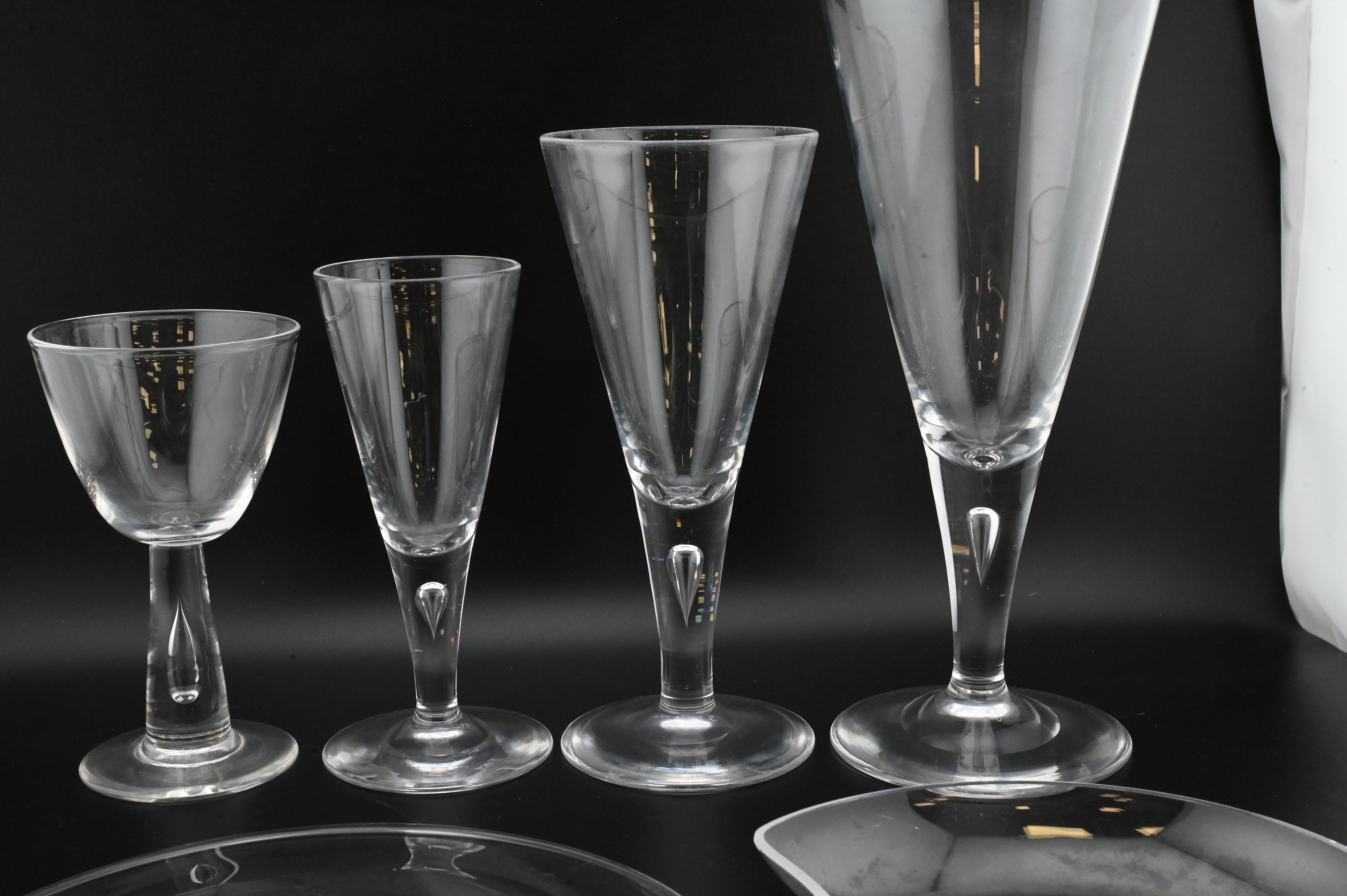 to include multiple sizes and forms such as wines, flutes, and cordials, all exhibiting Steuben’s characteristic clarity and refined craftsmanship, each piece signed Steuben on the underside, having 9 water glasses (8 1/2 inches), 10 red wine (7 inches), 2 white wine (6 1/2 inches), 8 sherry (5 inches), 9 cordial (5 inch), 4 bread and butter plate (unmarked, 6 1/4 inches diameter, 10 dessert plates (7 inches diameter), and 9 bone plates (marked Lalique, 6 1/2 inches)
