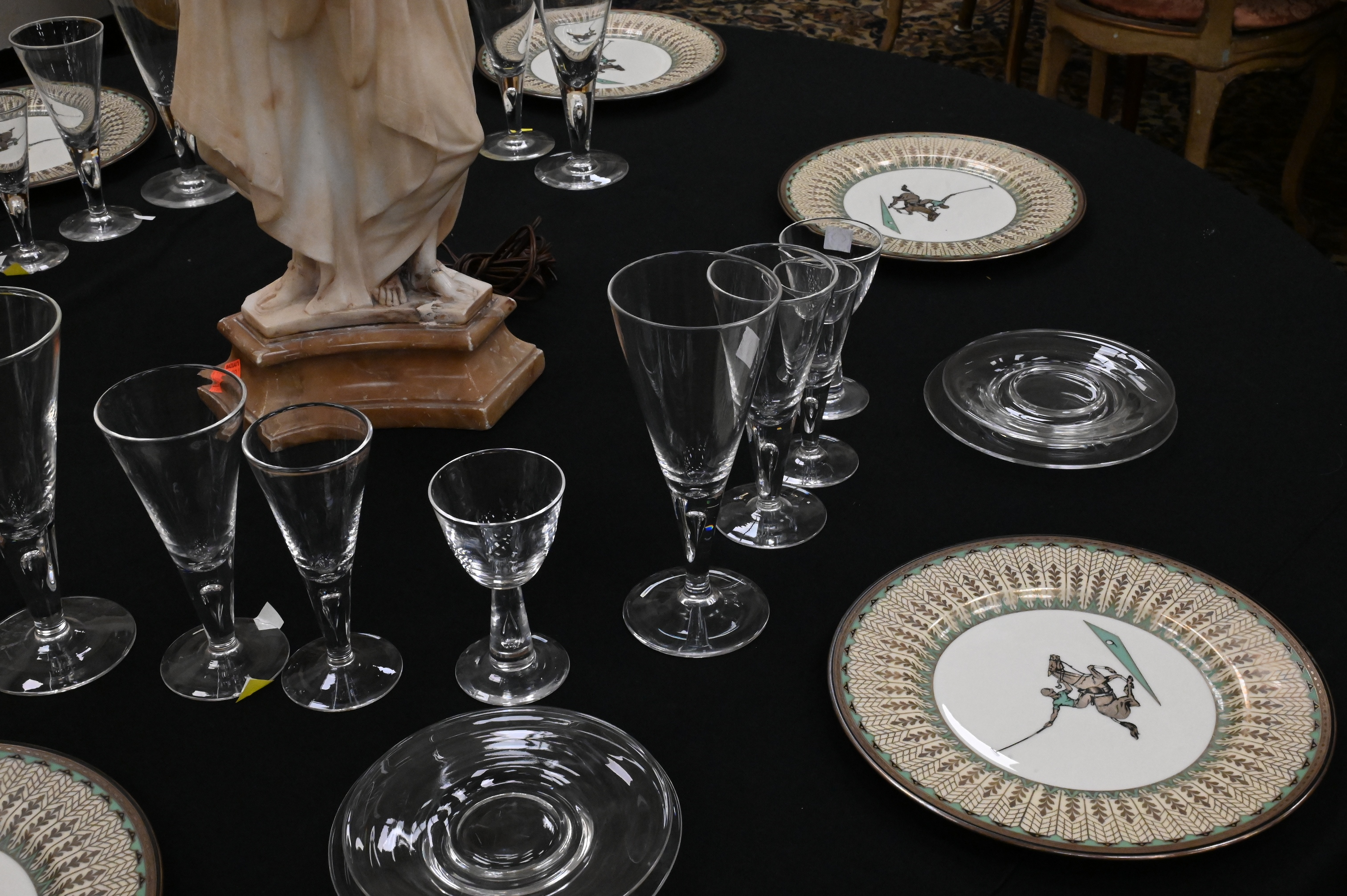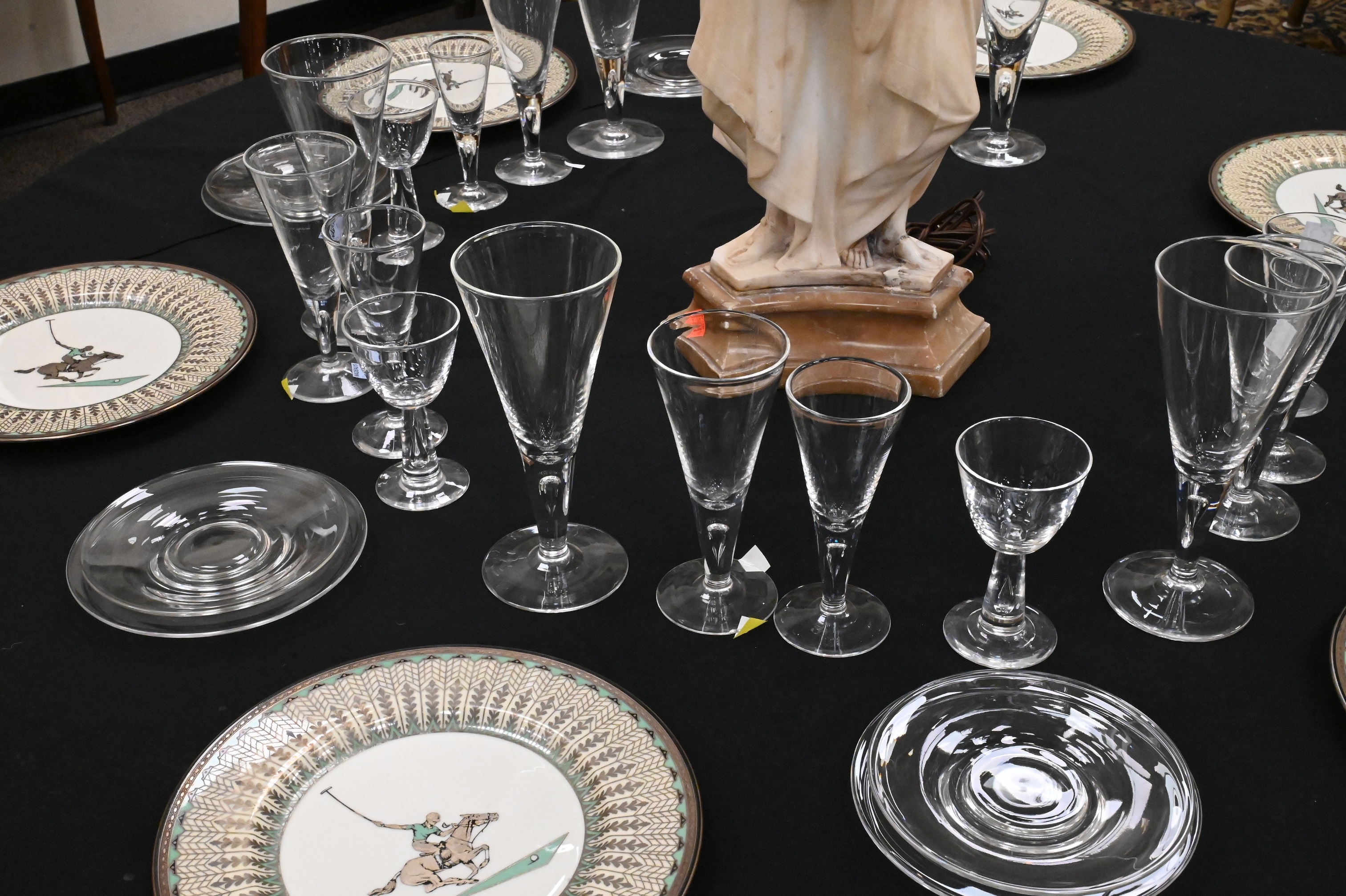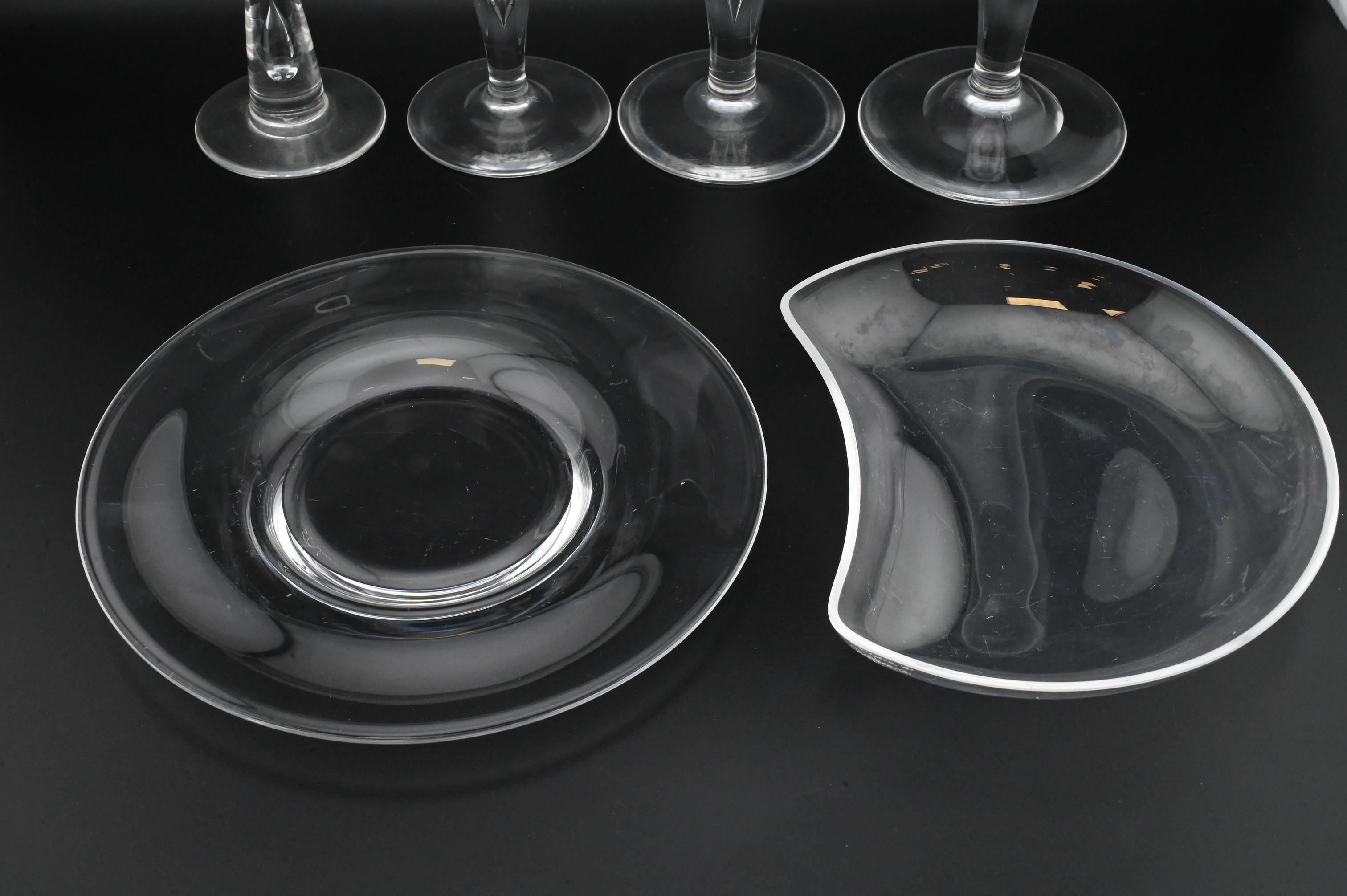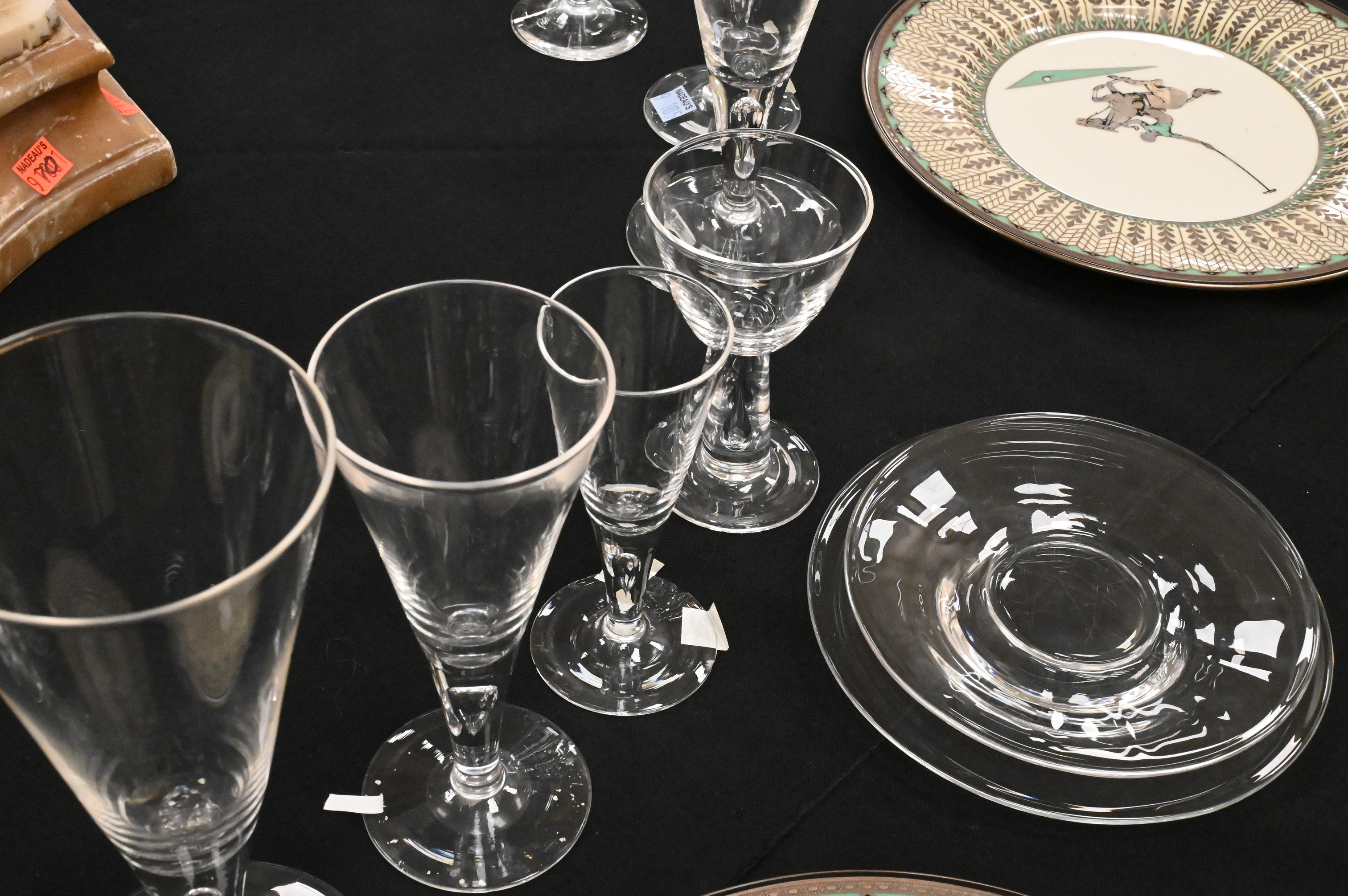 to include multiple sizes and forms such as wines, flutes, and cordials, all exhibiting Steuben’s characteristic clarity and refined craftsmanship, each piece signed Steuben on the underside, having 9 water glasses (8 1/2 inches), 10 red wine (7 inches), 2 white wine (6 1/2 inches), 8 sherry (5 inches), 9 cordial (5 inch), 4 bread and butter plate (unmarked, 6 1/4 inches diameter, 10 dessert plates (7 inches diameter), and 9 bone plates (marked Lalique, 6 1/2 inches)