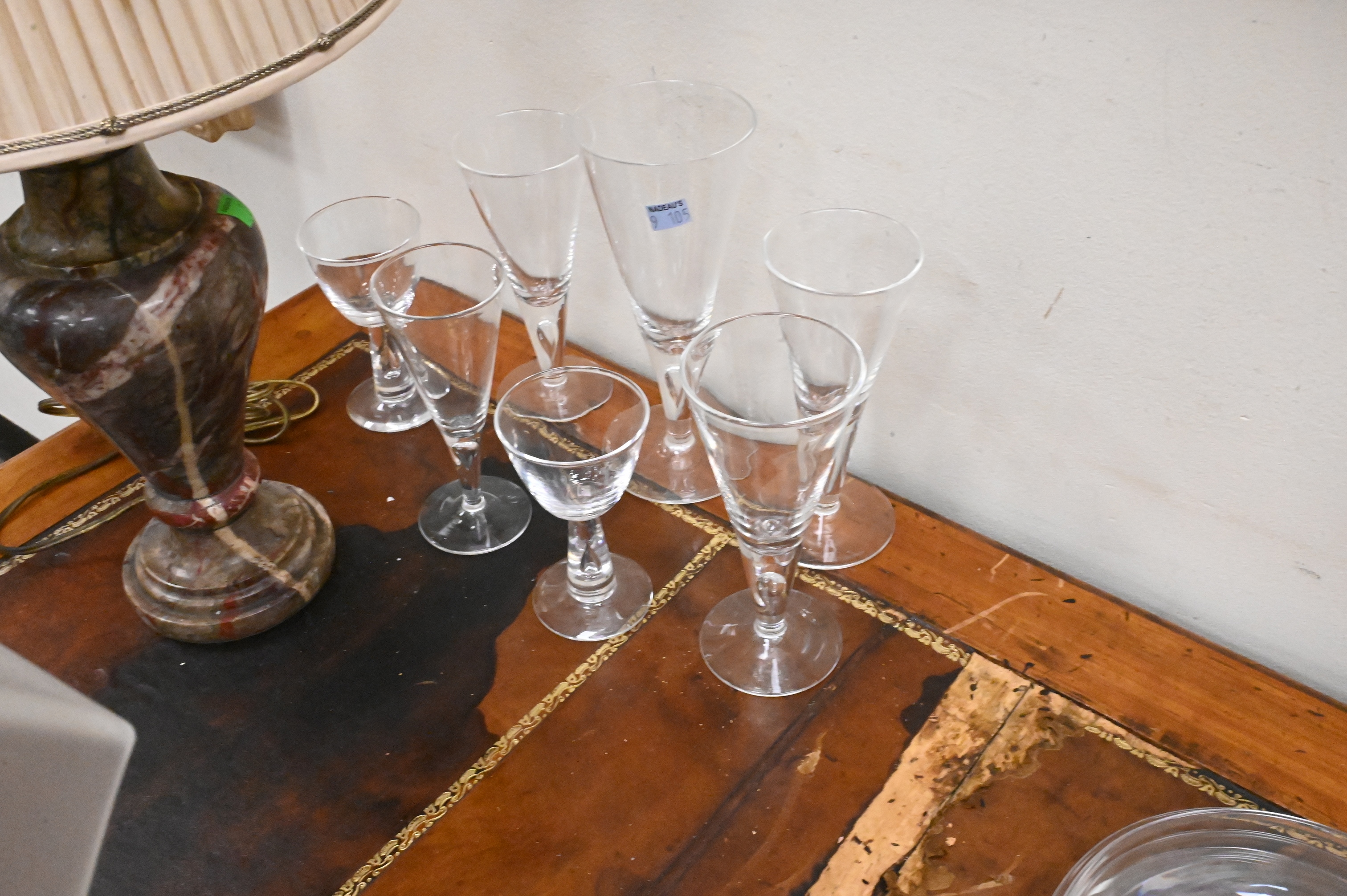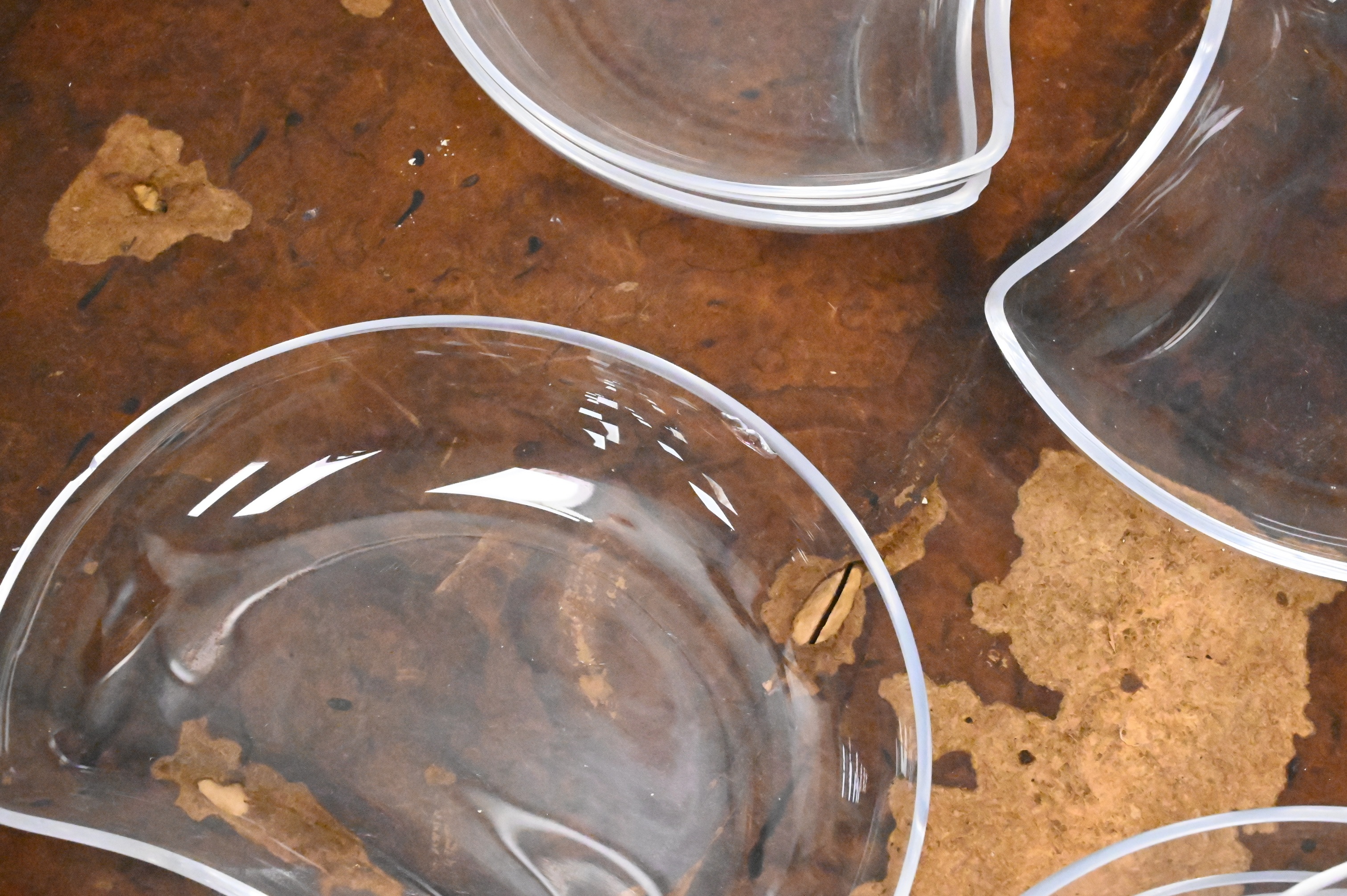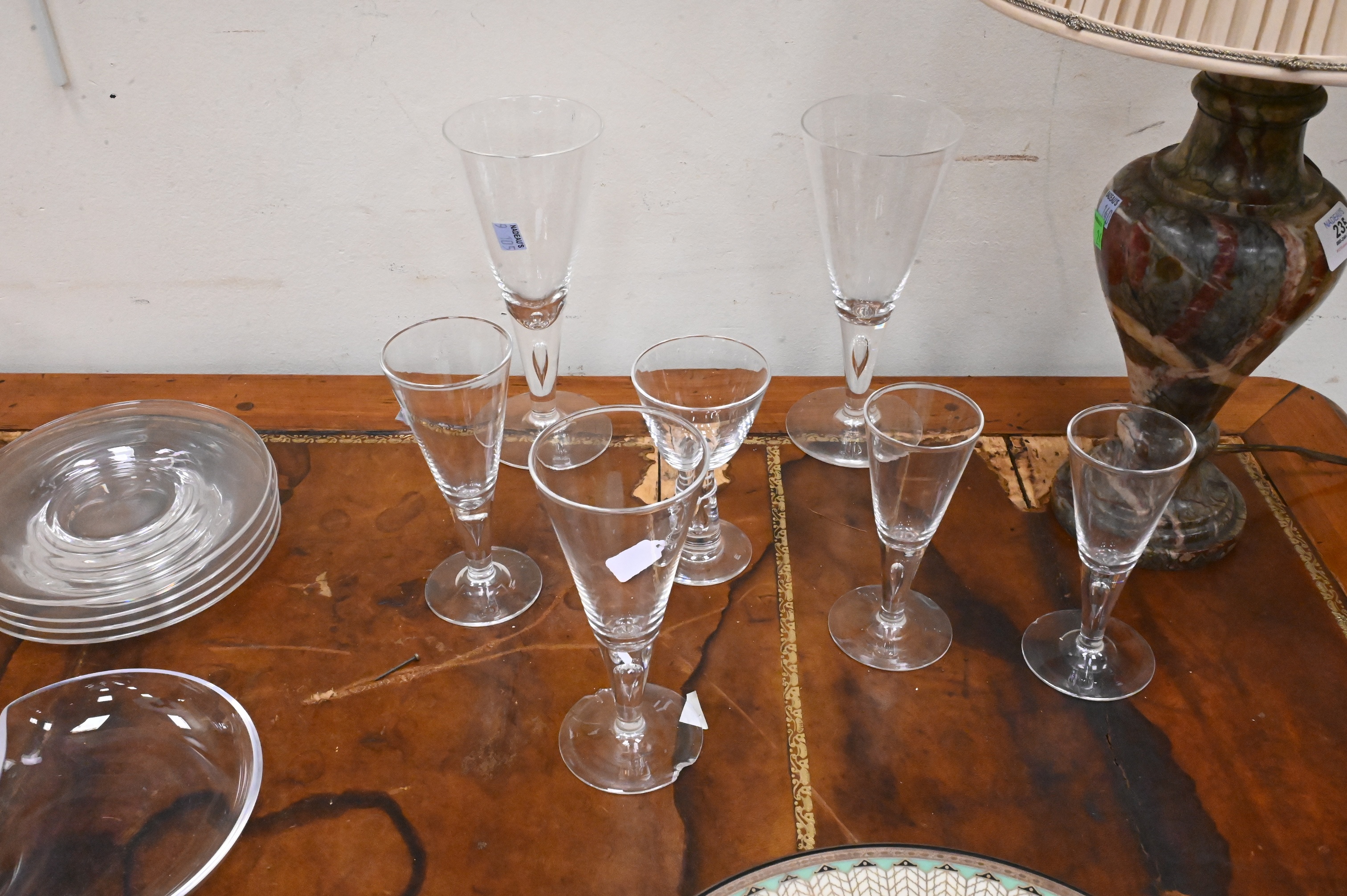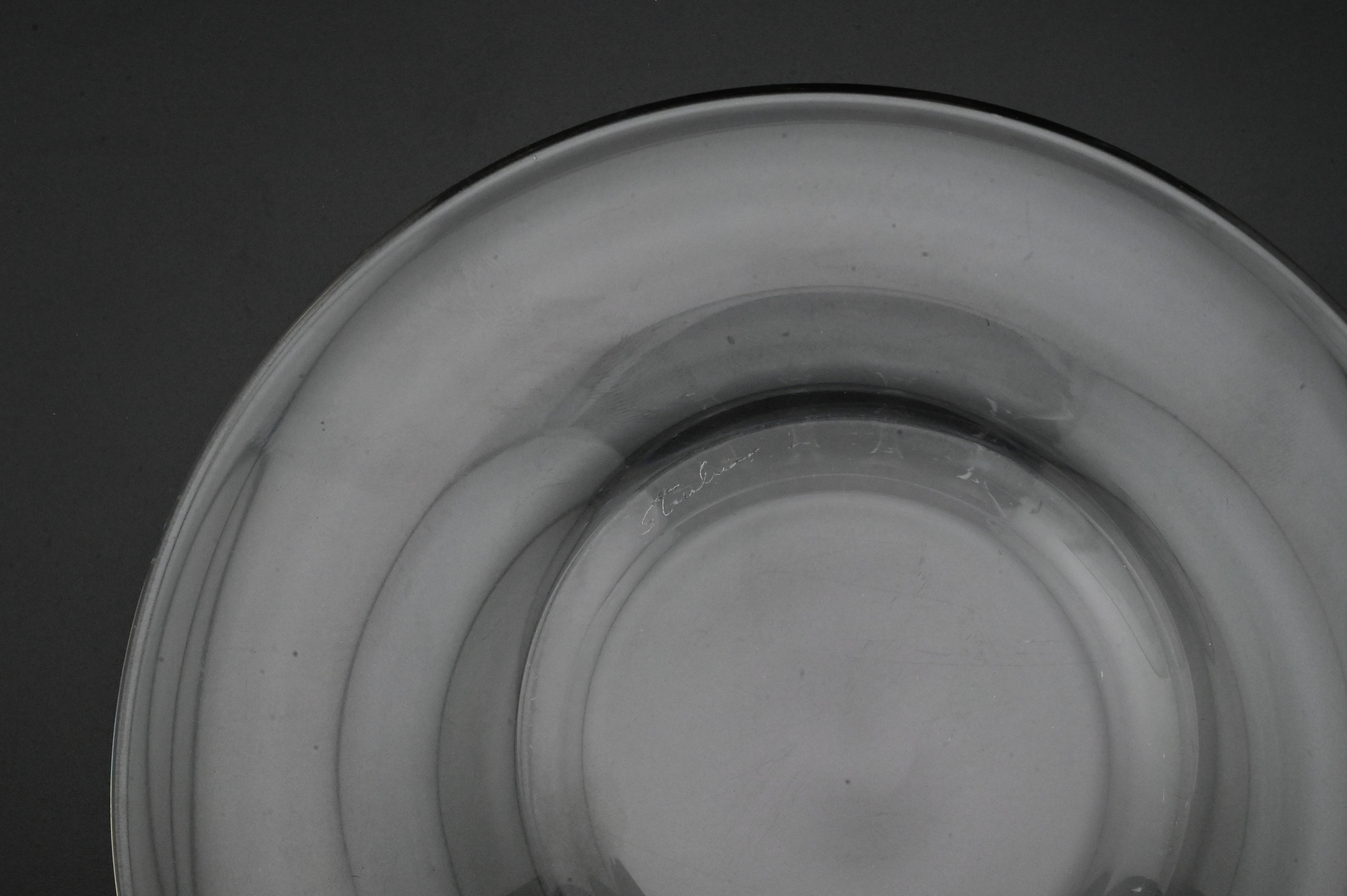 to include multiple sizes and forms such as wines, flutes, and cordials, all exhibiting Steuben’s characteristic clarity and refined craftsmanship, each piece signed Steuben on the underside, having 9 water glasses (8 1/2 inches), 10 red wine (7 inches), 2 white wine (6 1/2 inches), 8 sherry (5 inches), 9 cordial (5 inch), 4 bread and butter plate (unmarked, 6 1/4 inches diameter, 10 dessert plates (7 inches diameter), and 9 bone plates (marked Lalique, 6 1/2 inches)