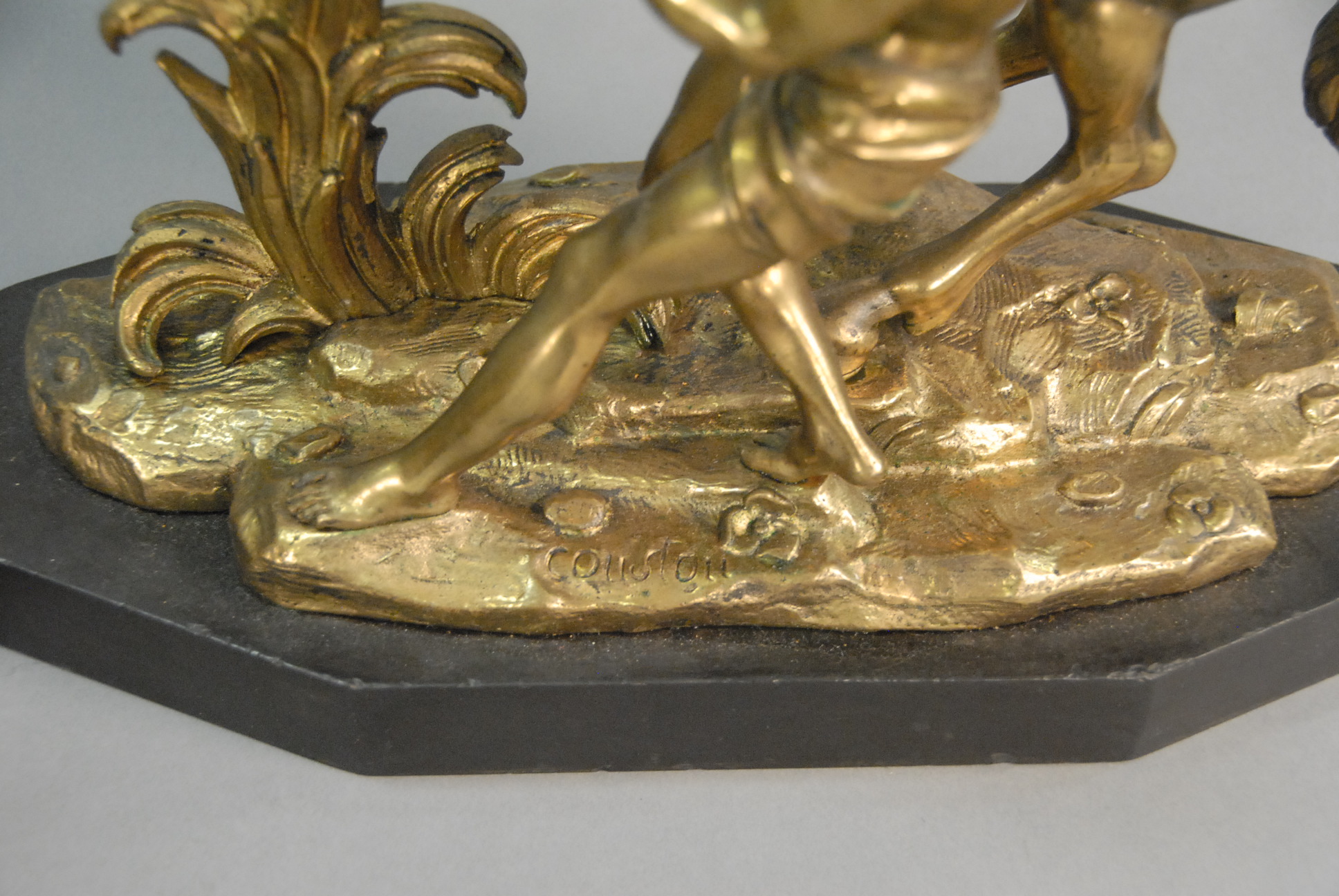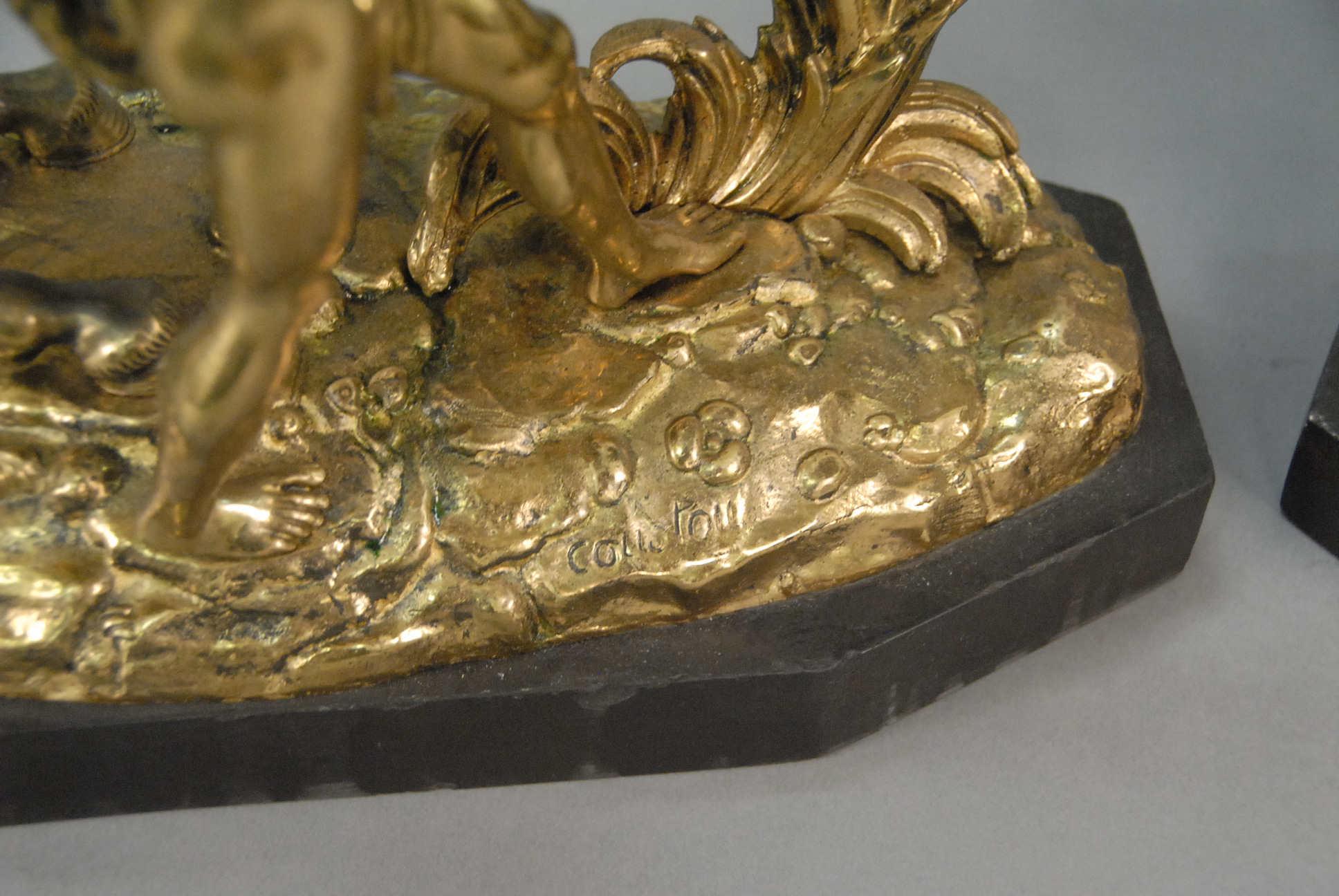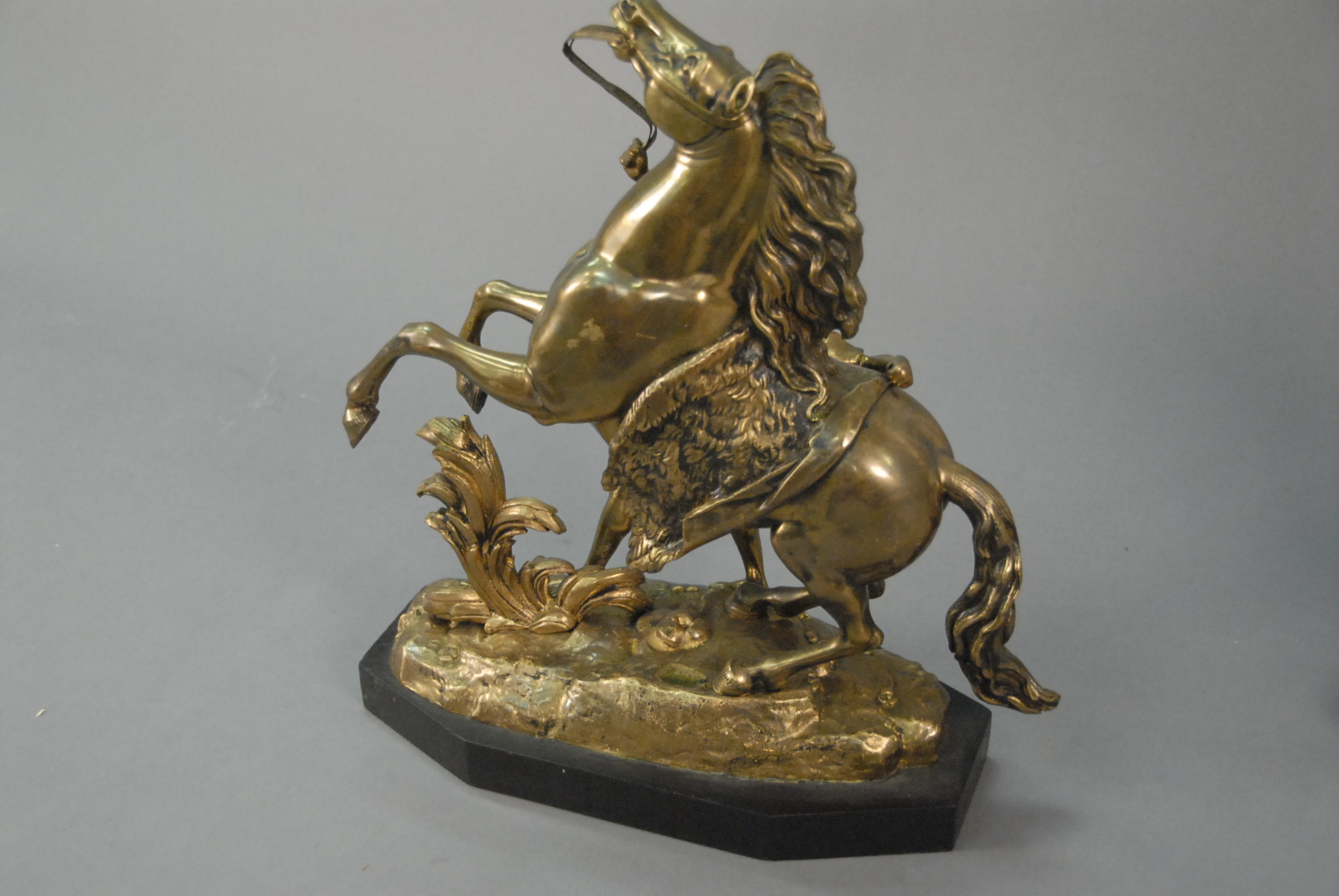 Lot 95: Couston pair of brass horses rearing up with horseman, set on black slate bases. ht. 16 1/2in.