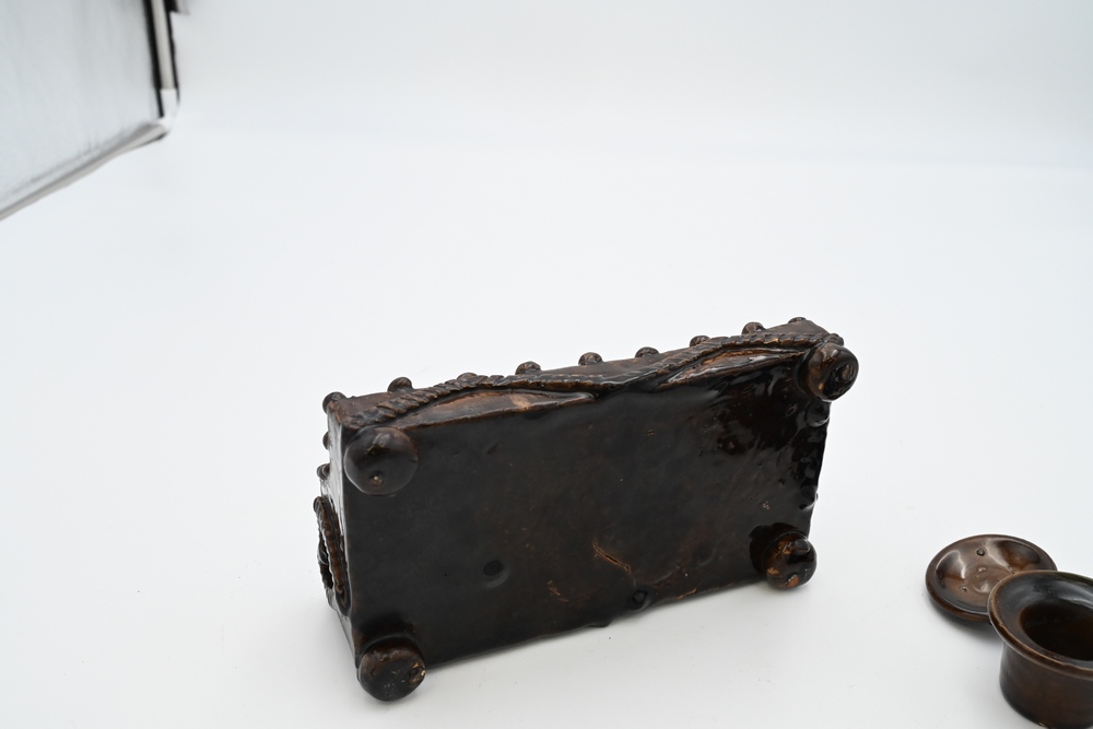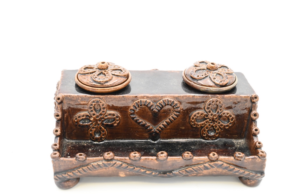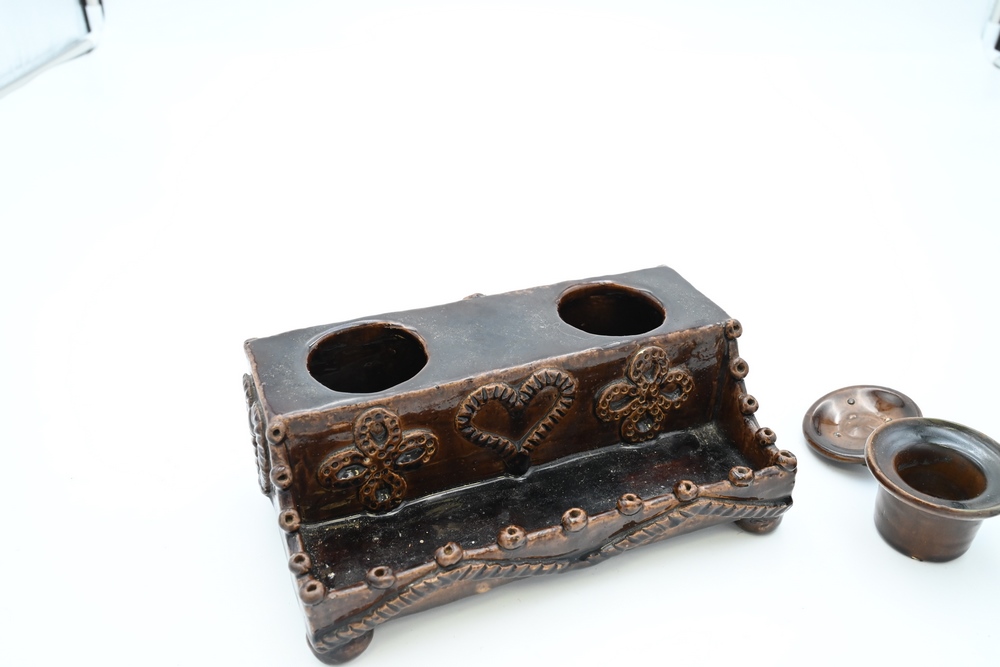 Lot 95: Earthenware Double Inkwell having molded heart and flower decoration height 3 1/2 inches, length 8 inches