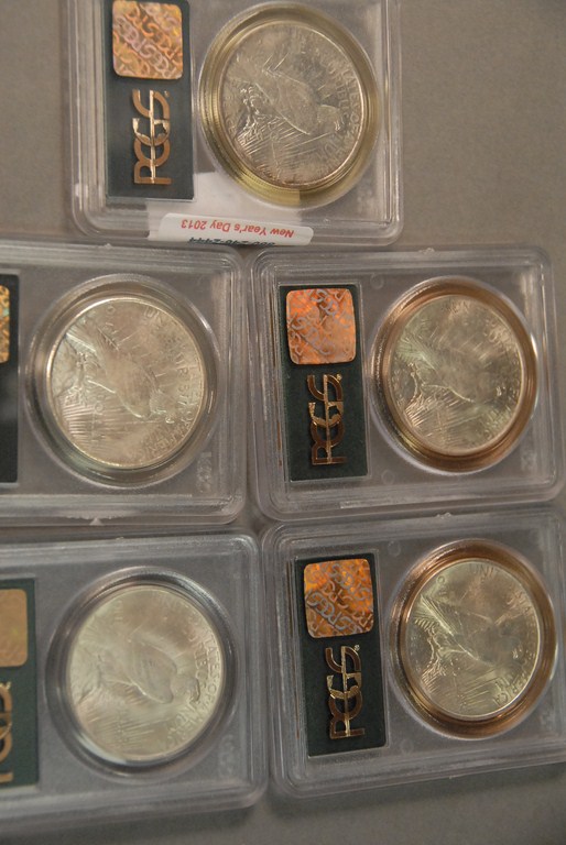 Five silver dollars 1923-D PCGS 62, 1924 PCGS 63, 1924 PCGS 63, 1924-S PCGS 61, and 1925 PCGS 63.