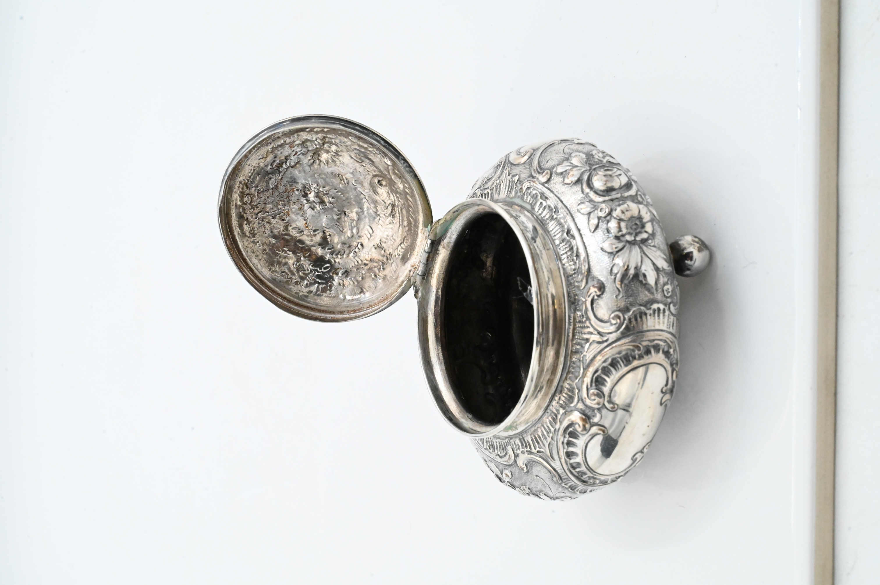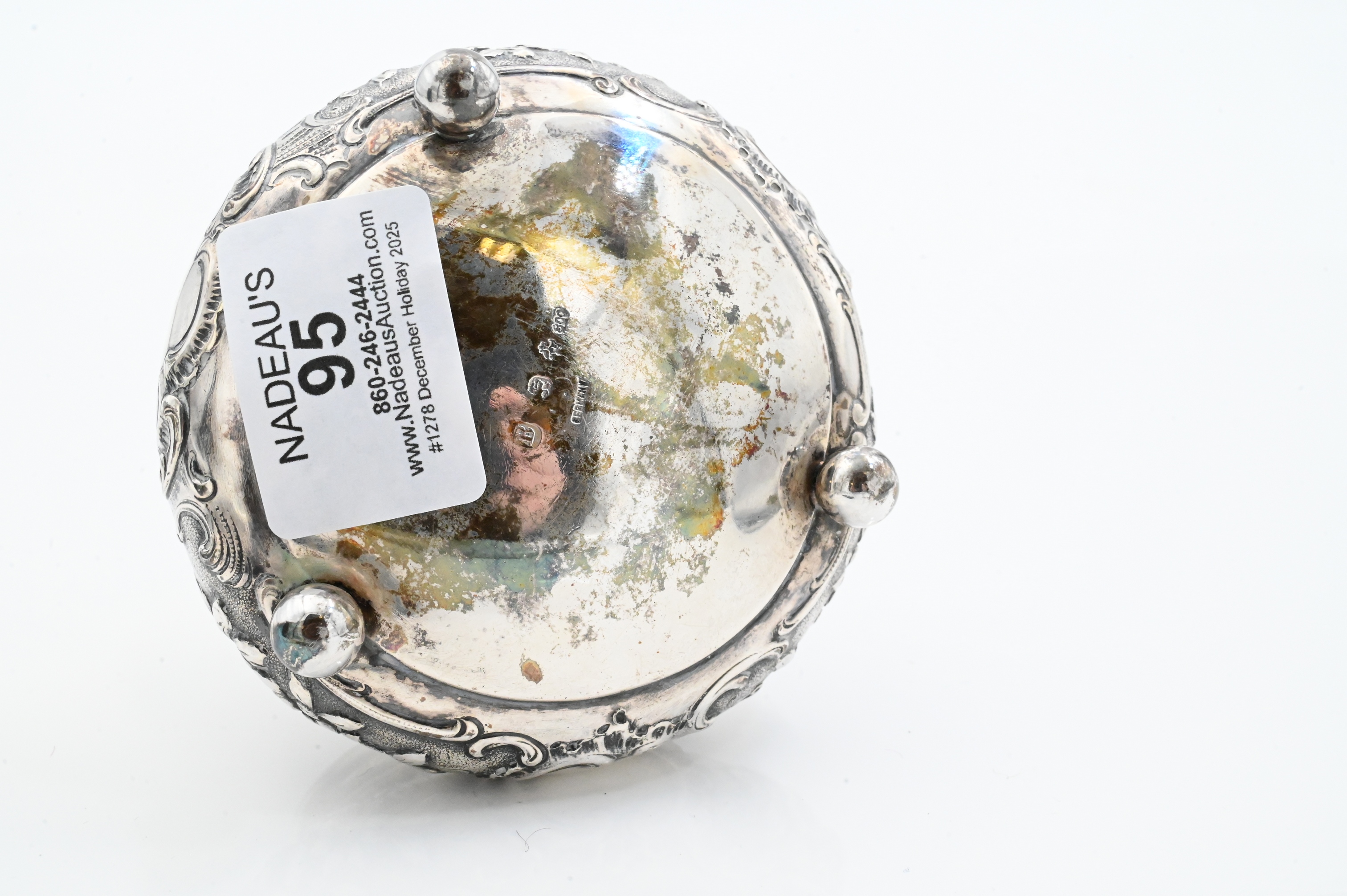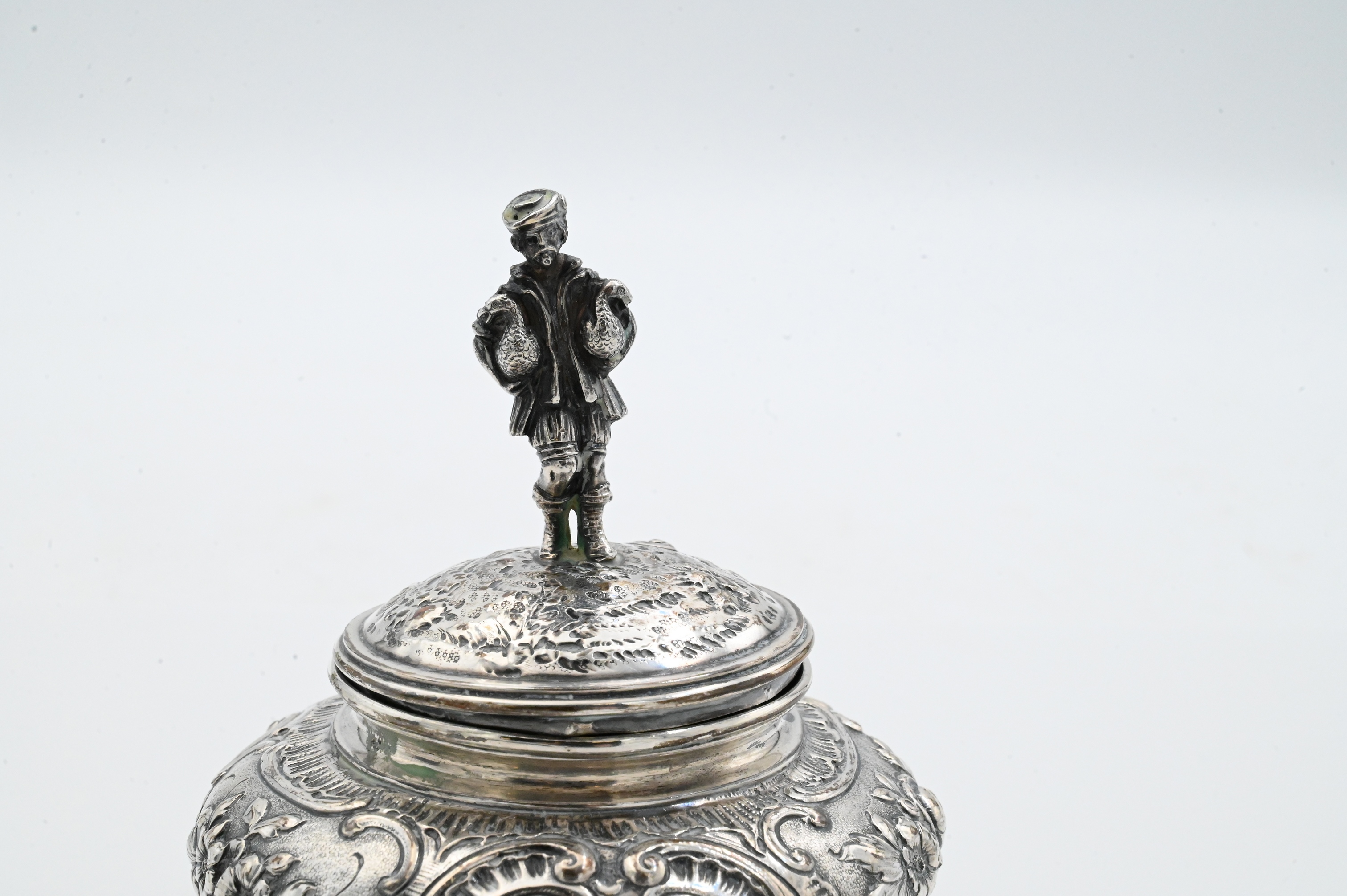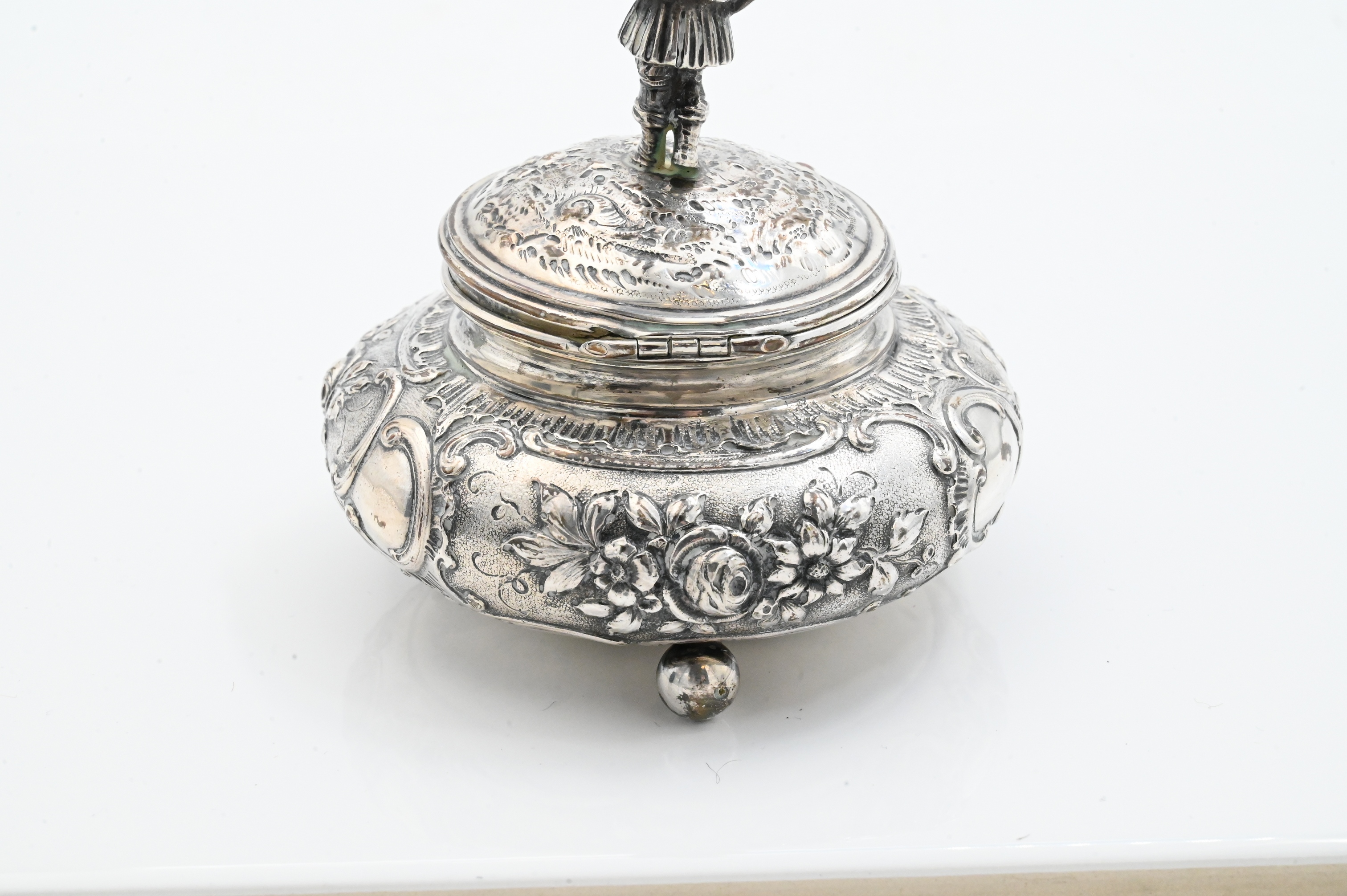 having finial depicting a figure holding two chickens set on repoussé body ending in three ball fee, hallmarks to underside, no liner