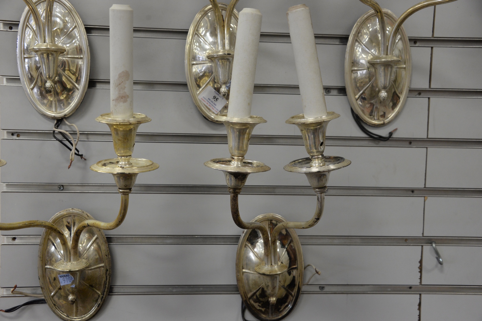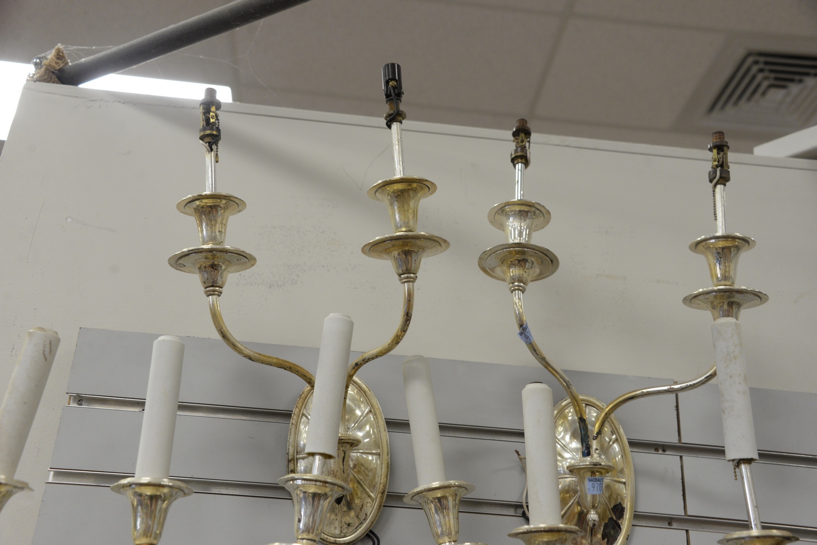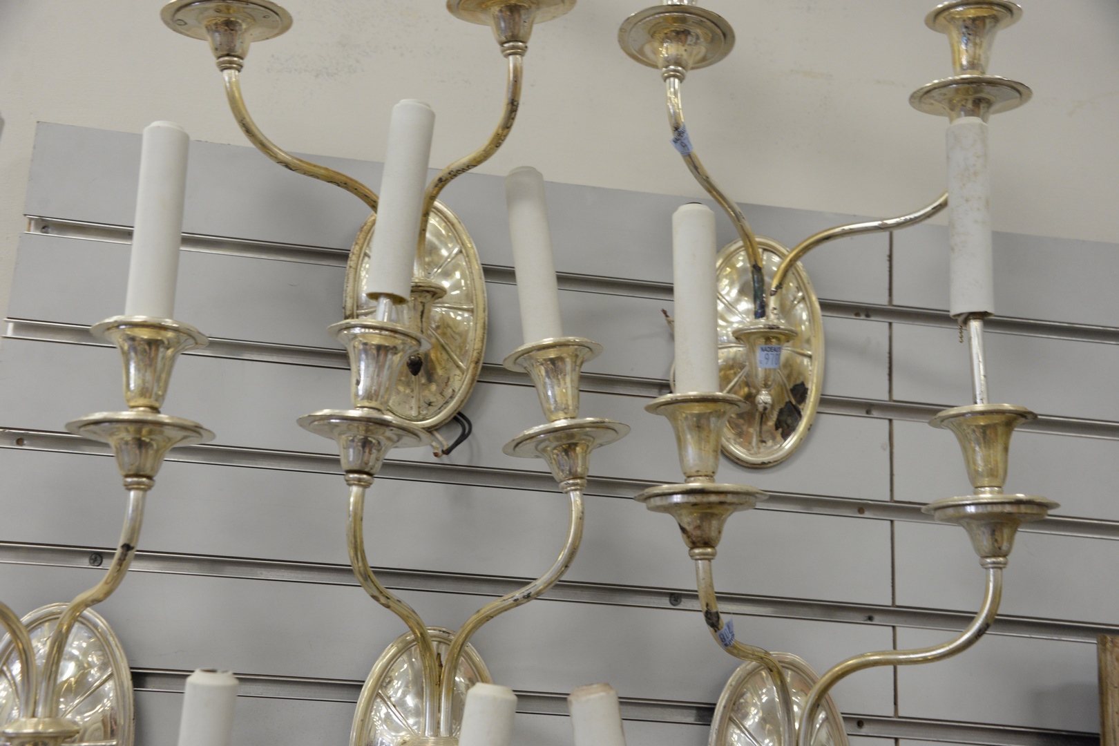 Lot 95: Group of Seven Caldwell Two Light Sconces having silver finish with scrolled candle arm marked with C inside a diamond or lozenge …
