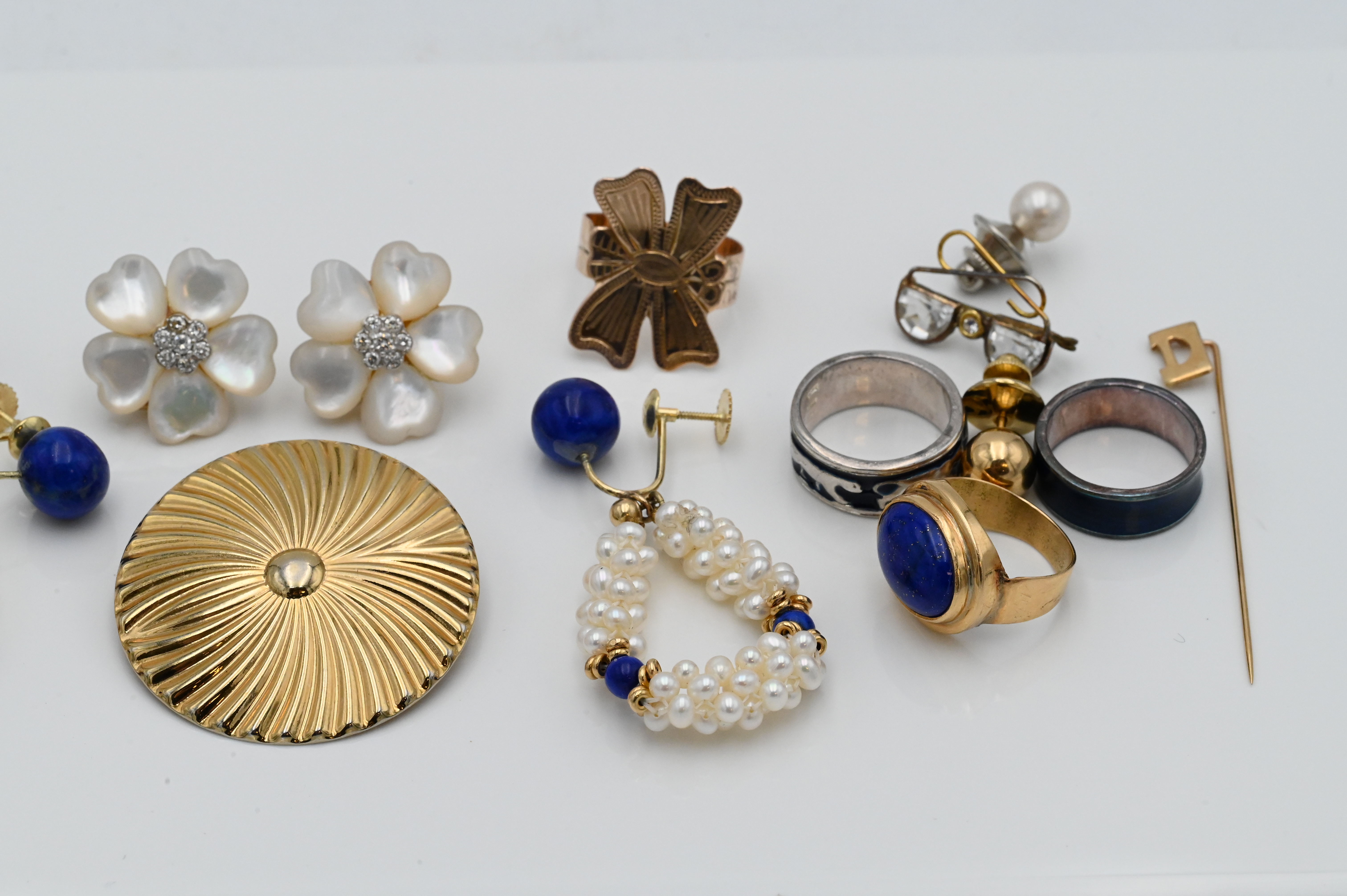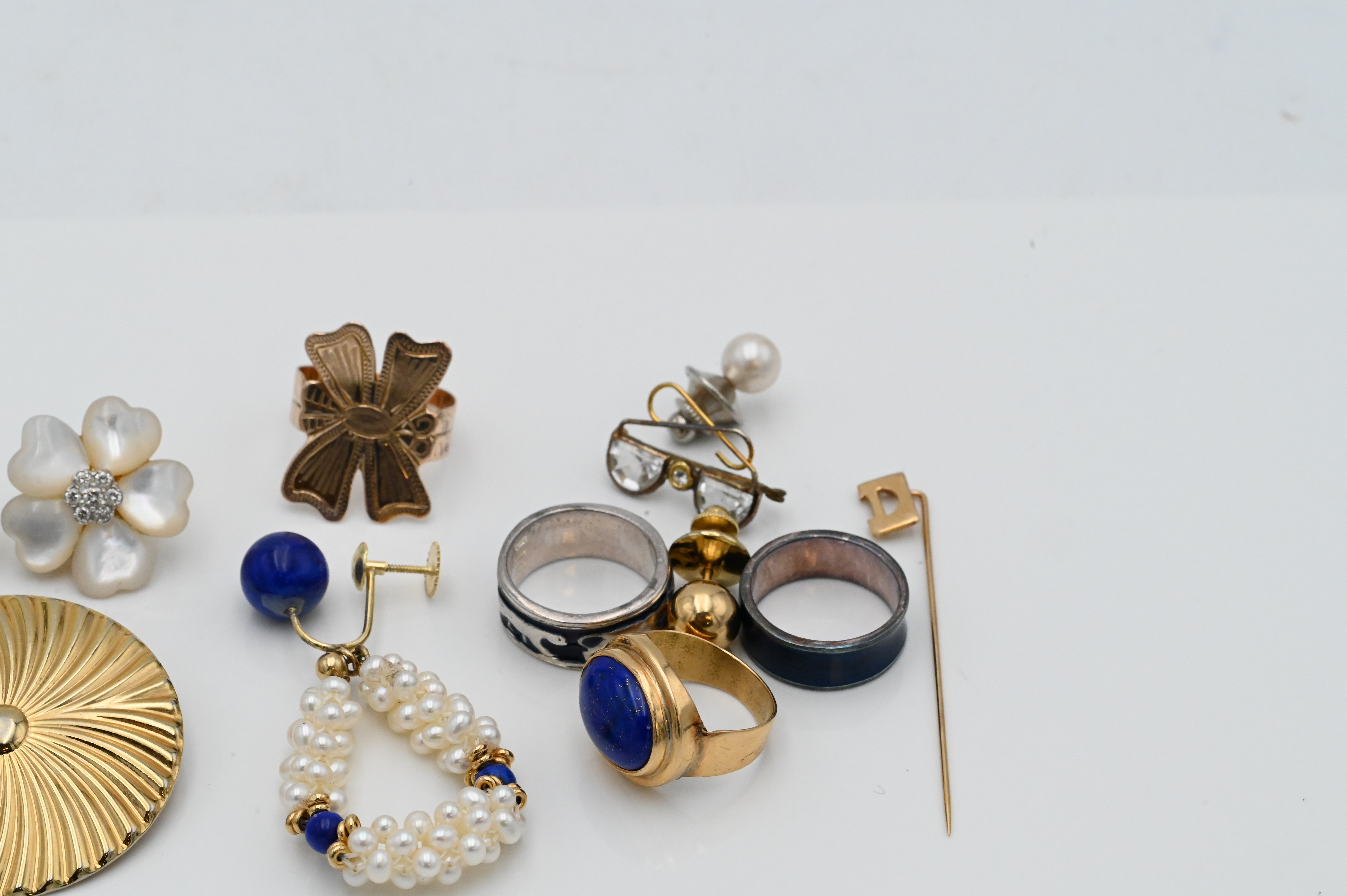 Jewelry Lot, to include a single diamond ear clip, two gold rings, earrings with pearls and sterling silver, 14 karat yellow gold six point star pendant, a 14 karat yellow gold stickpin, along with two tie tacks.