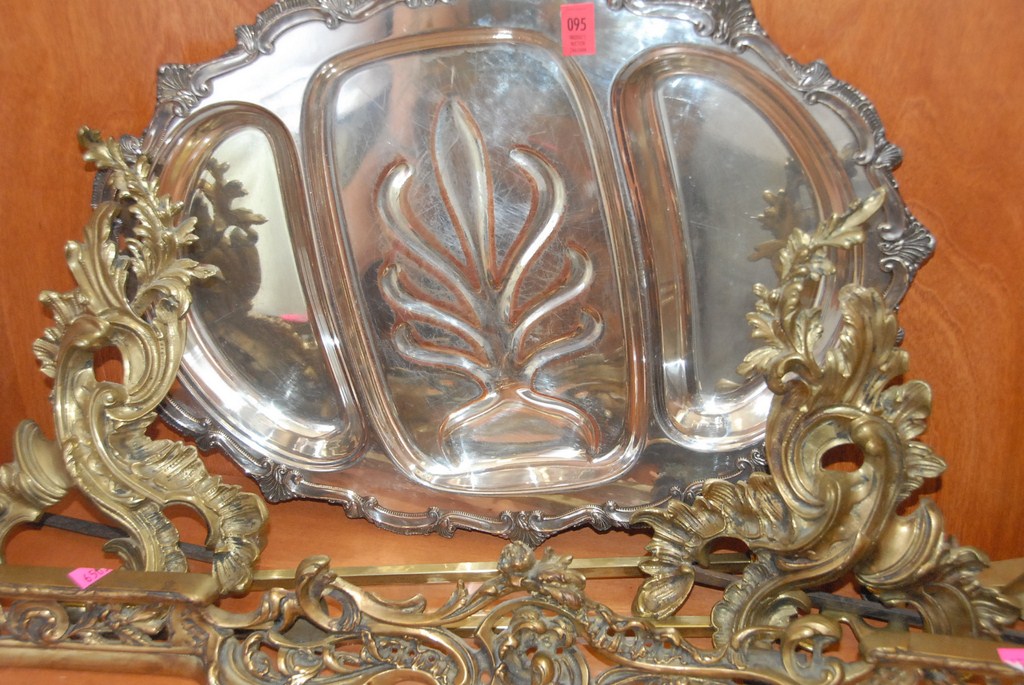 Louis XV style brass fire fender, two tools, and foot stool etc.