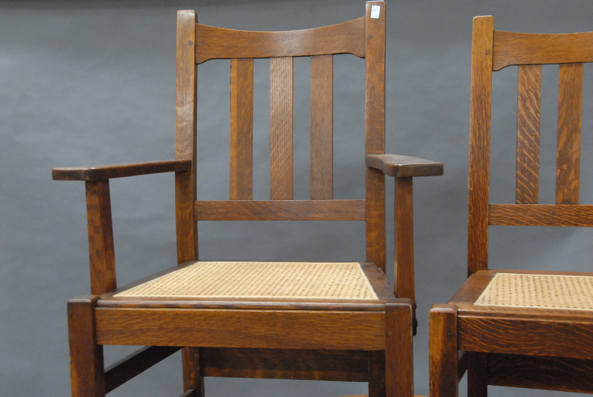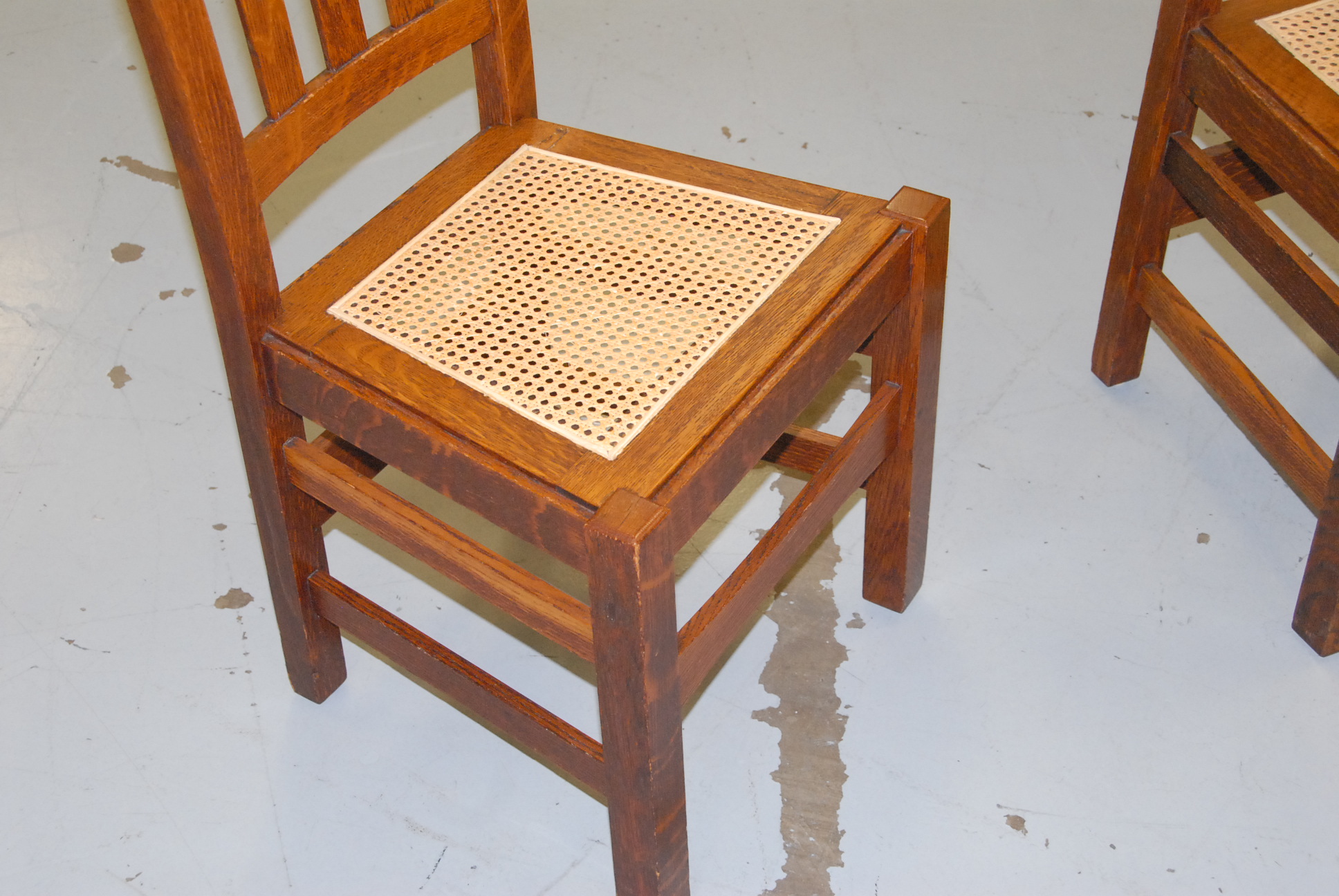Mission oak round dining table and six chairs with caned seats with metal labels marked Quaint Furniture, Stickley Brothers Company, Grand Rapids, Michigan, two leaves and custom pads.