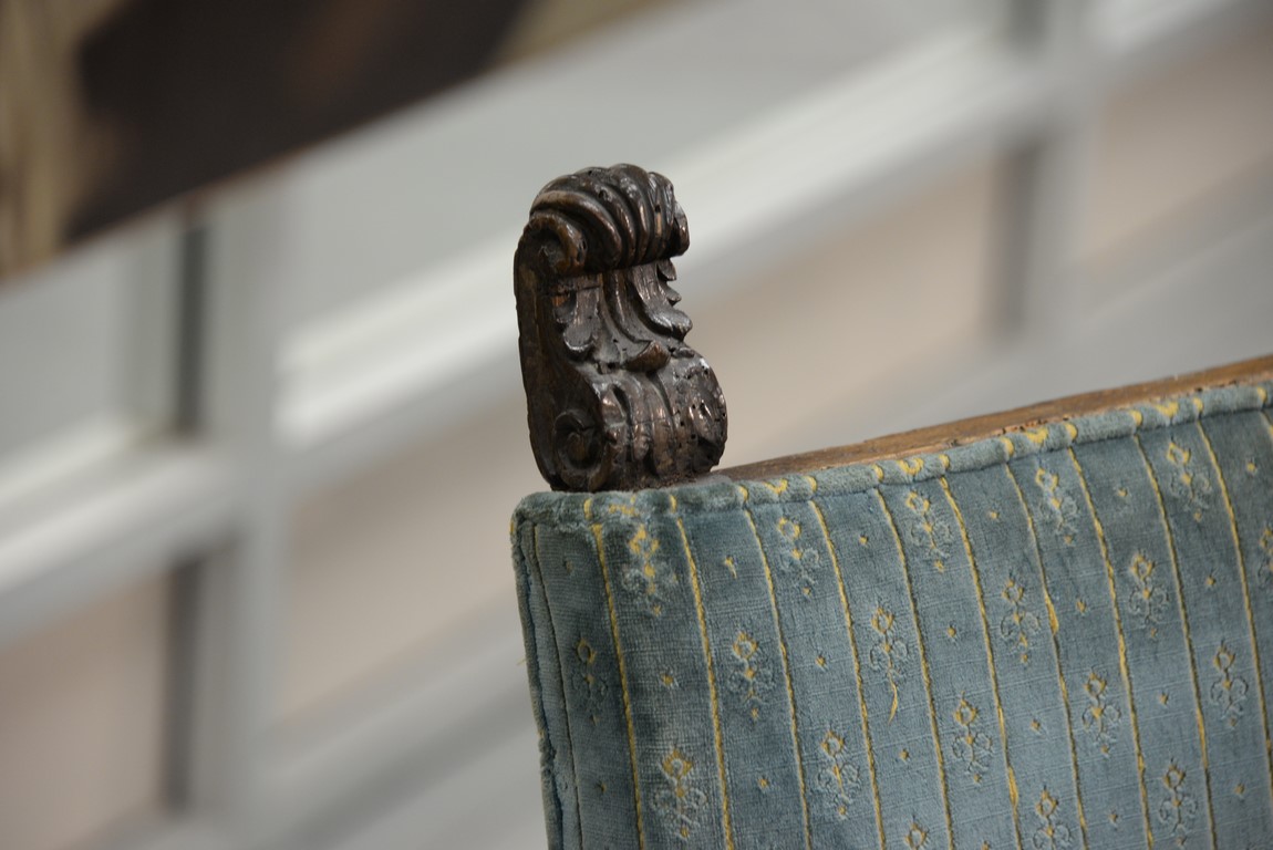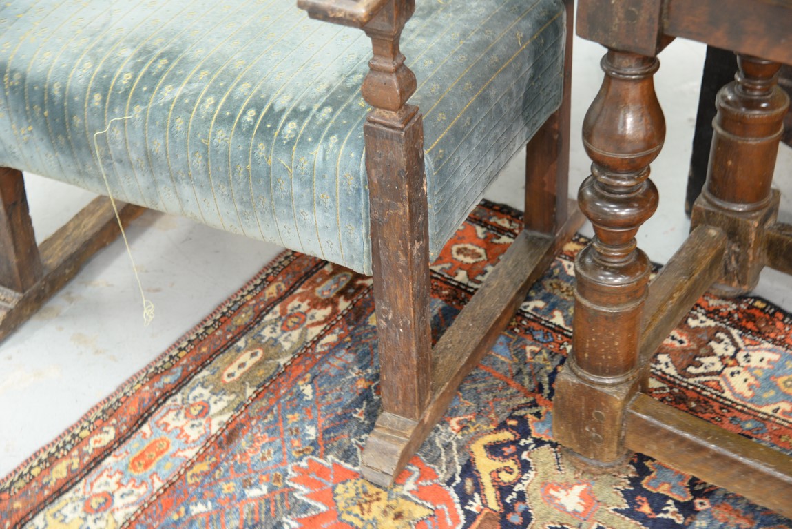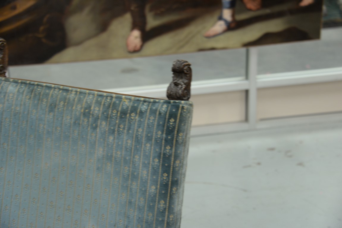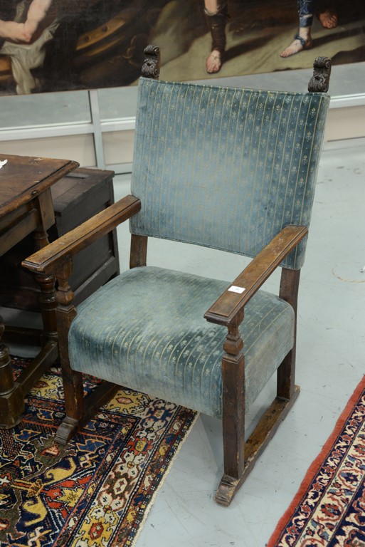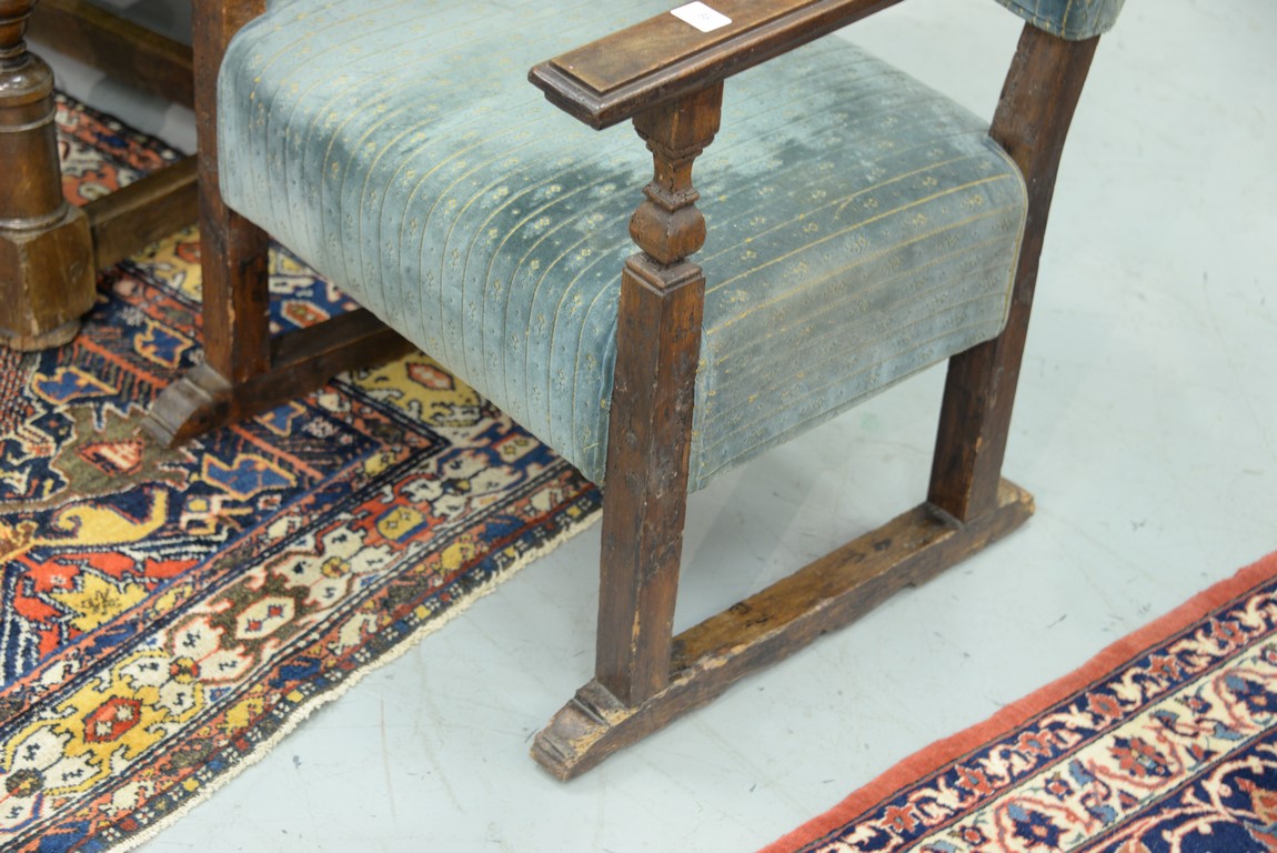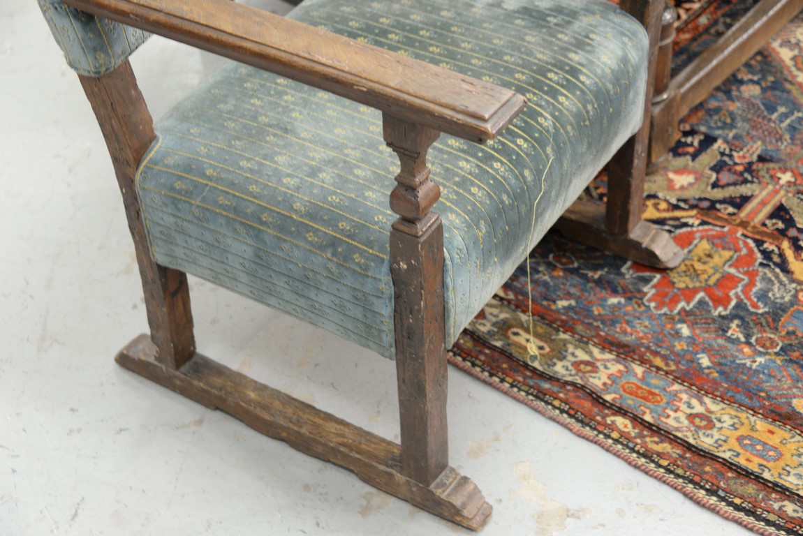 Lot 95: Pair of Italian walnut armchairs having two carved finials over upholstered back and seat, arms supported by carved uprights all set on tressel style feet, Italy probably 17th century. ht. 44 3/4 in. seat ht. 16 1/2 in.