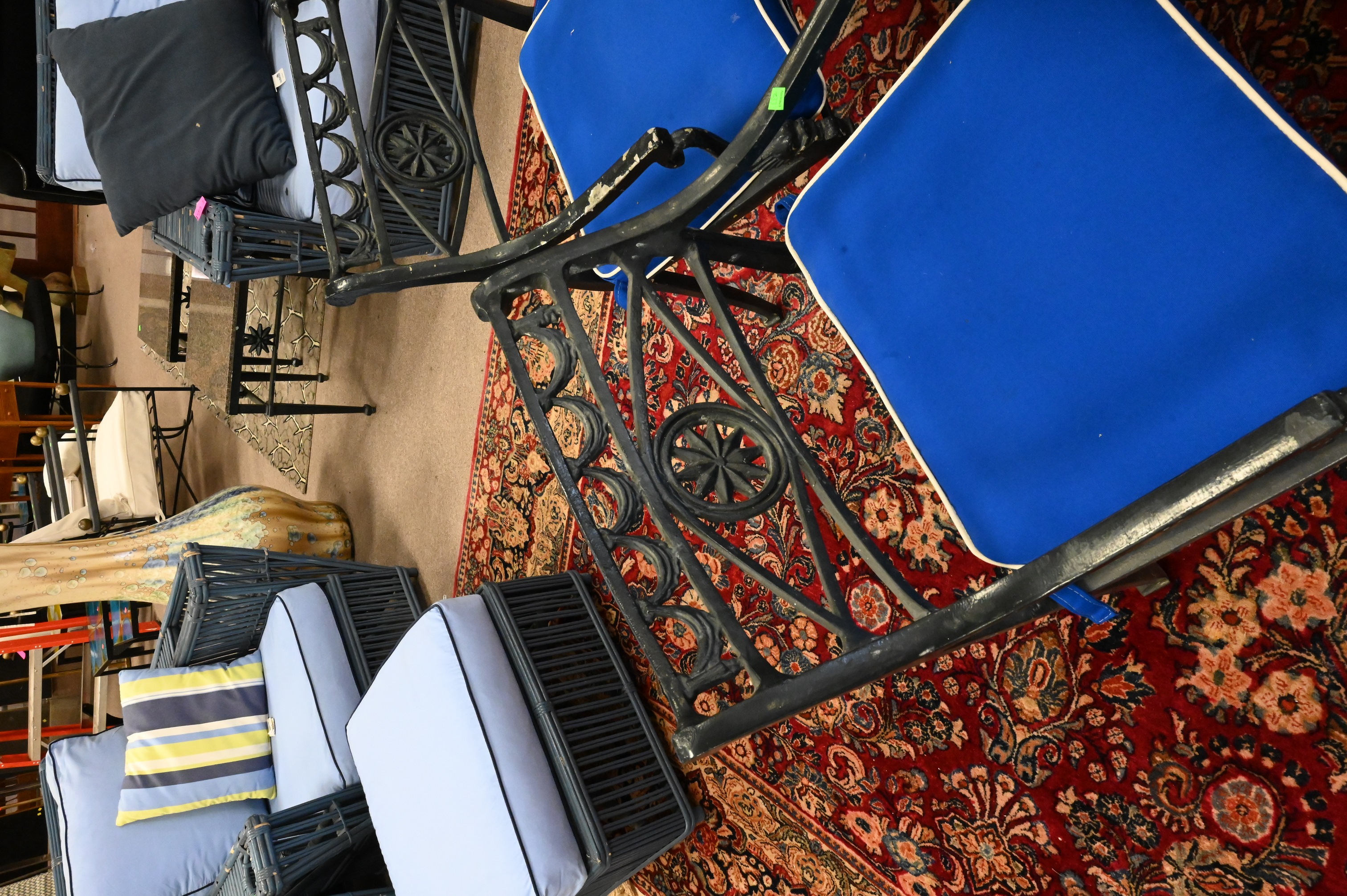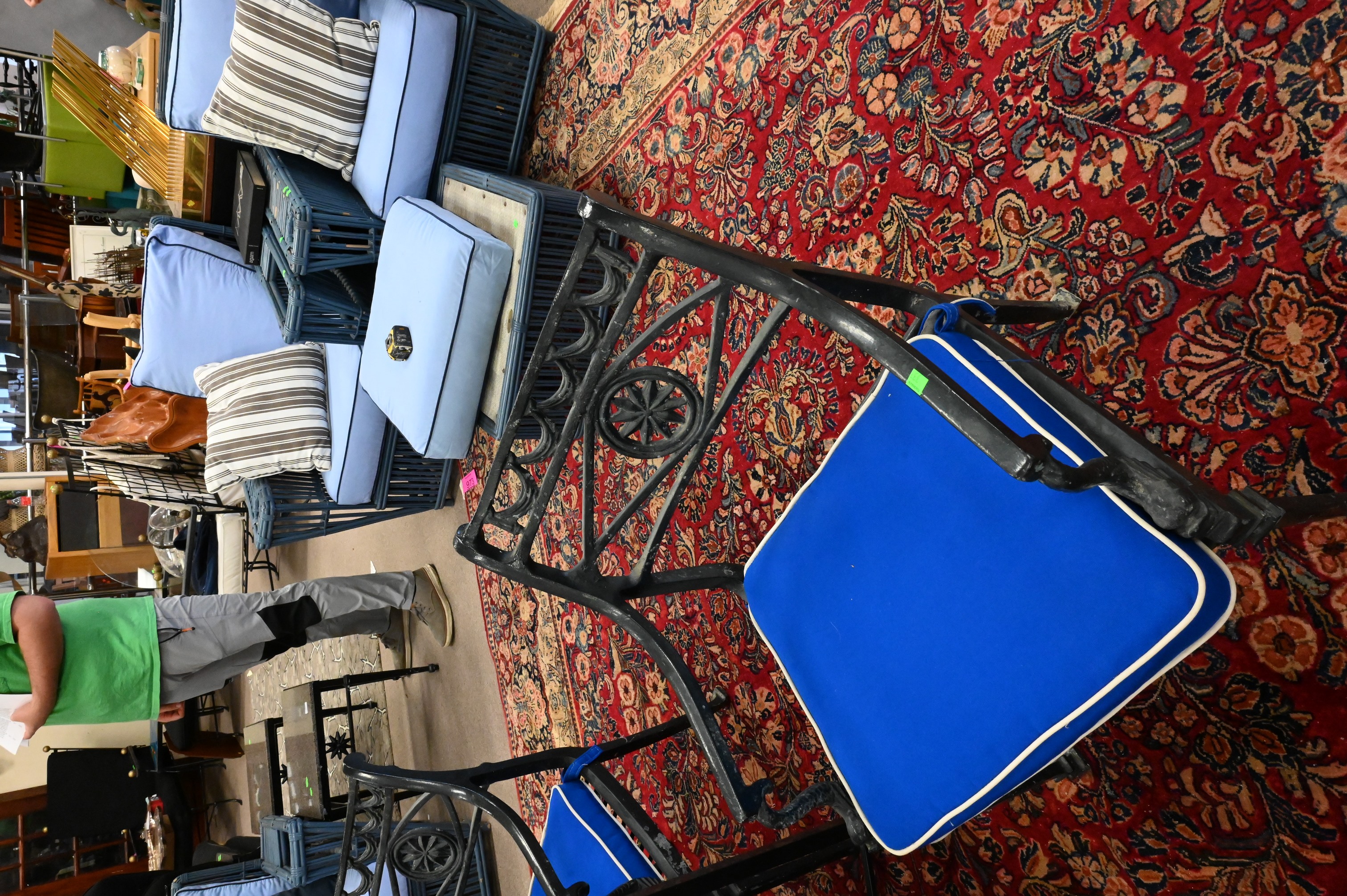 having dolphin arms and sun motif back, with blue outdoor cushions
