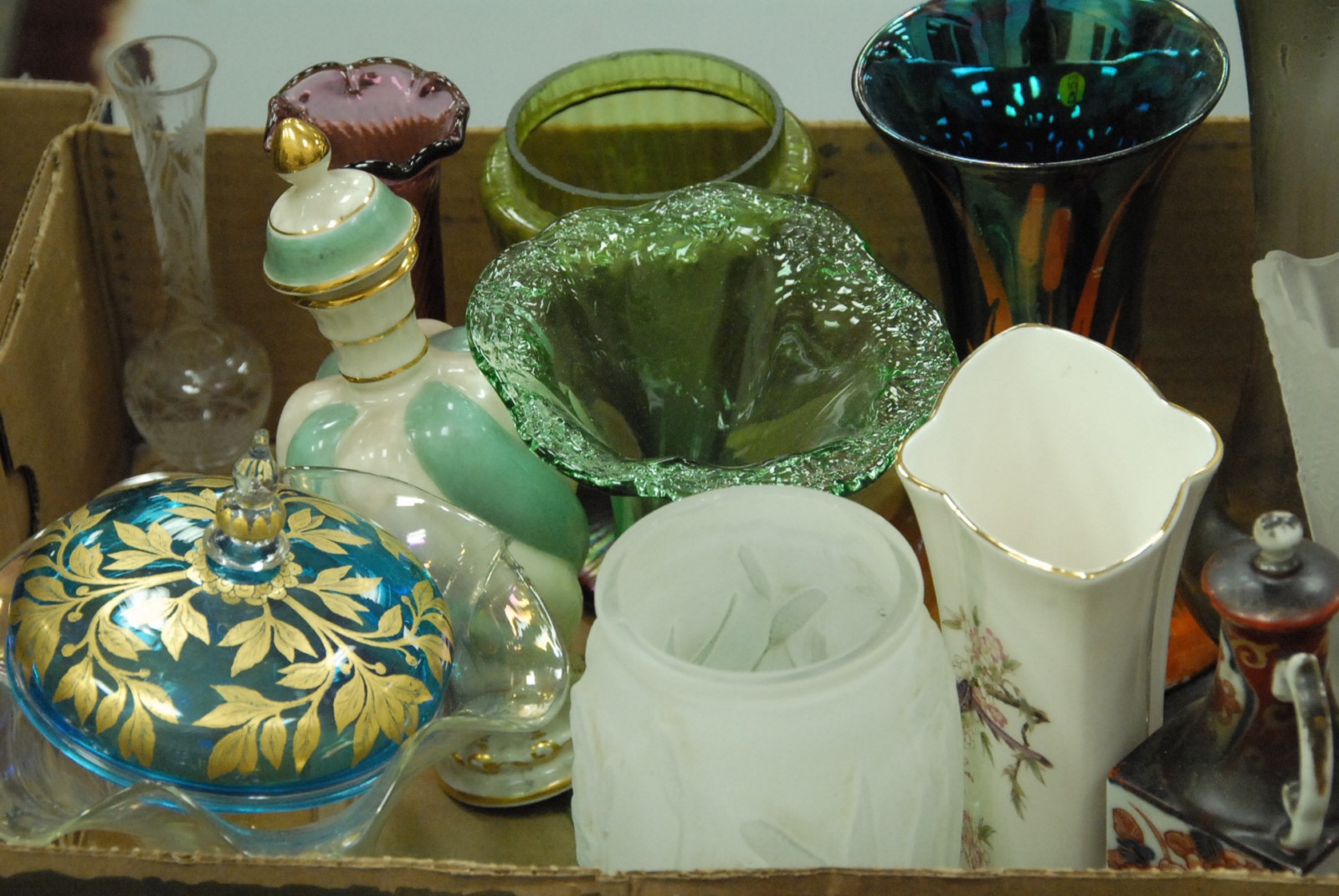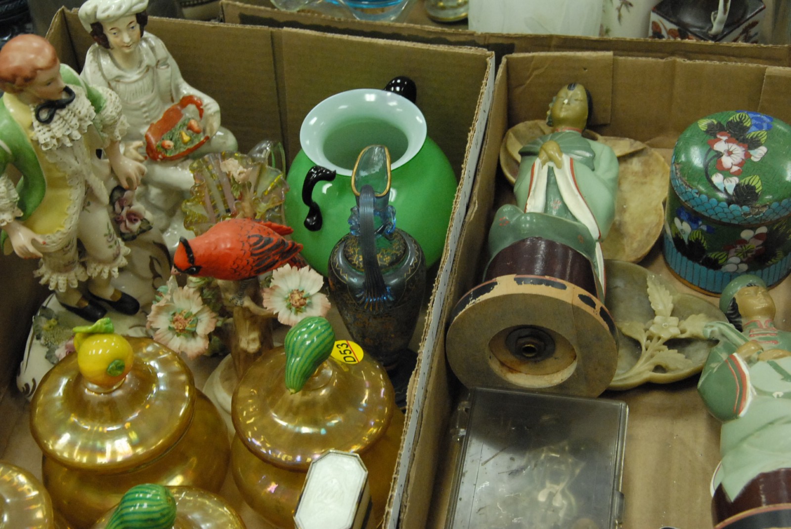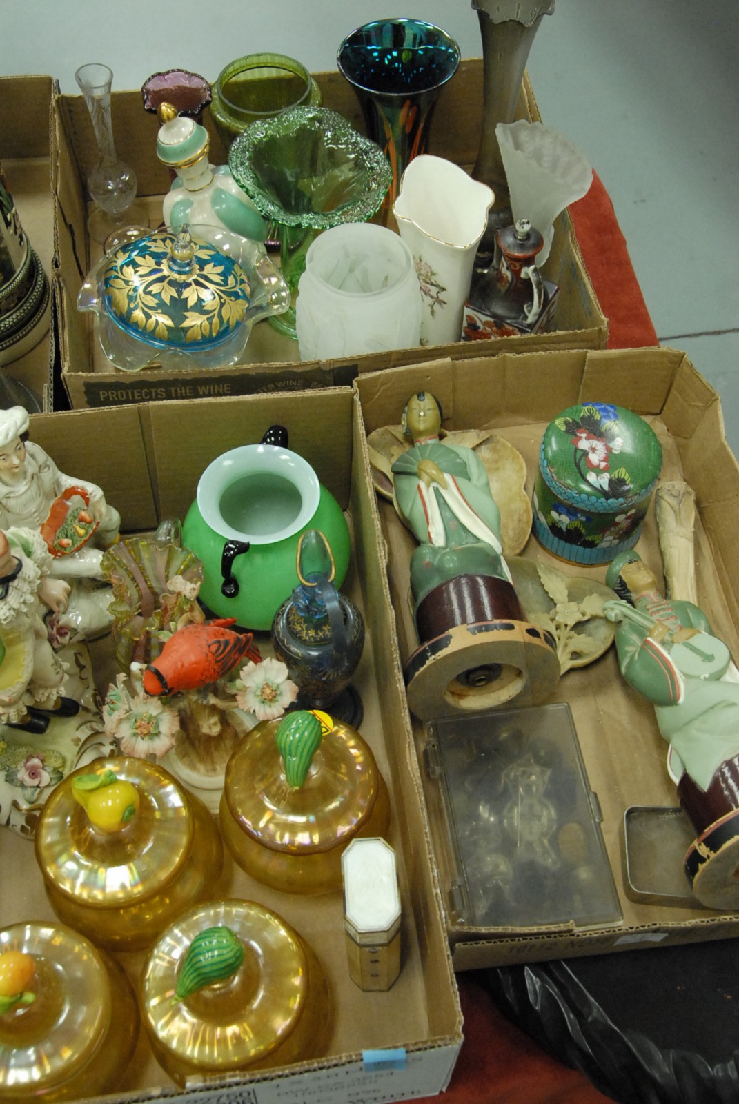Three box lots to include four Murano glass covered jars, two fifties Oriental plaster figures, vases, Staffordshire figure, etc.