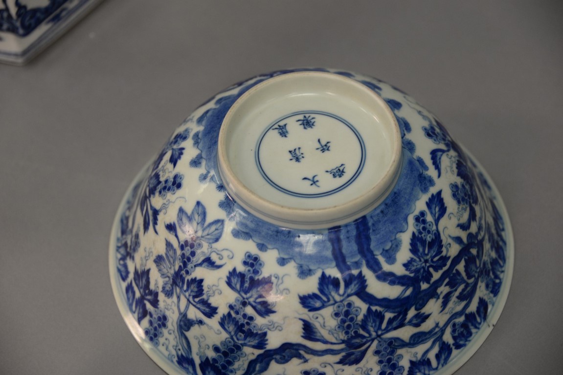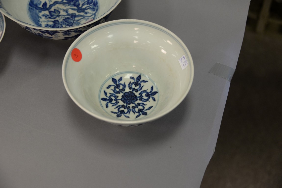 Lot 95: Three Chinese porcelain blue and white bowls, one with scrolling blossoming flowers having seal mark on bottom, ht. 3 1/2 in., dia. …