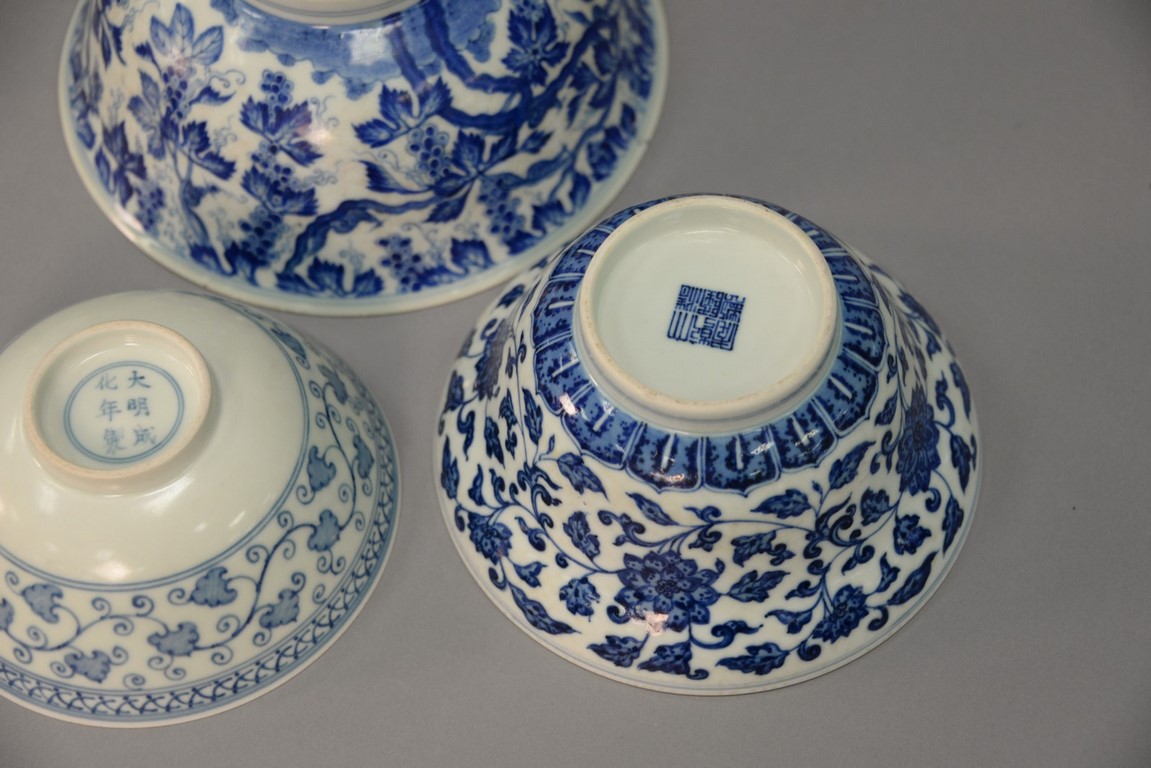 Three Chinese porcelain blue and white bowls, one with scrolling blossoming flowers having seal mark on bottom, ht. 3 1/2 in., dia. 7 in. one with scrolling leaves and six character mark on bottom, ht. 2 3/4 in., dia. 6 in. and the largest bowl having painted trees with leaves and six character mark on the bottom, ht. 3 1/2 in., dia. 8 1/2 in.