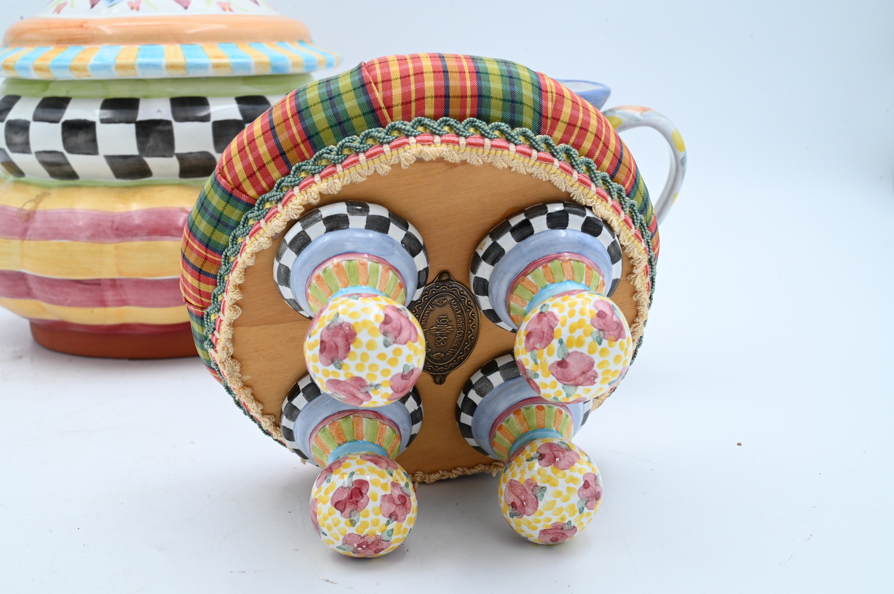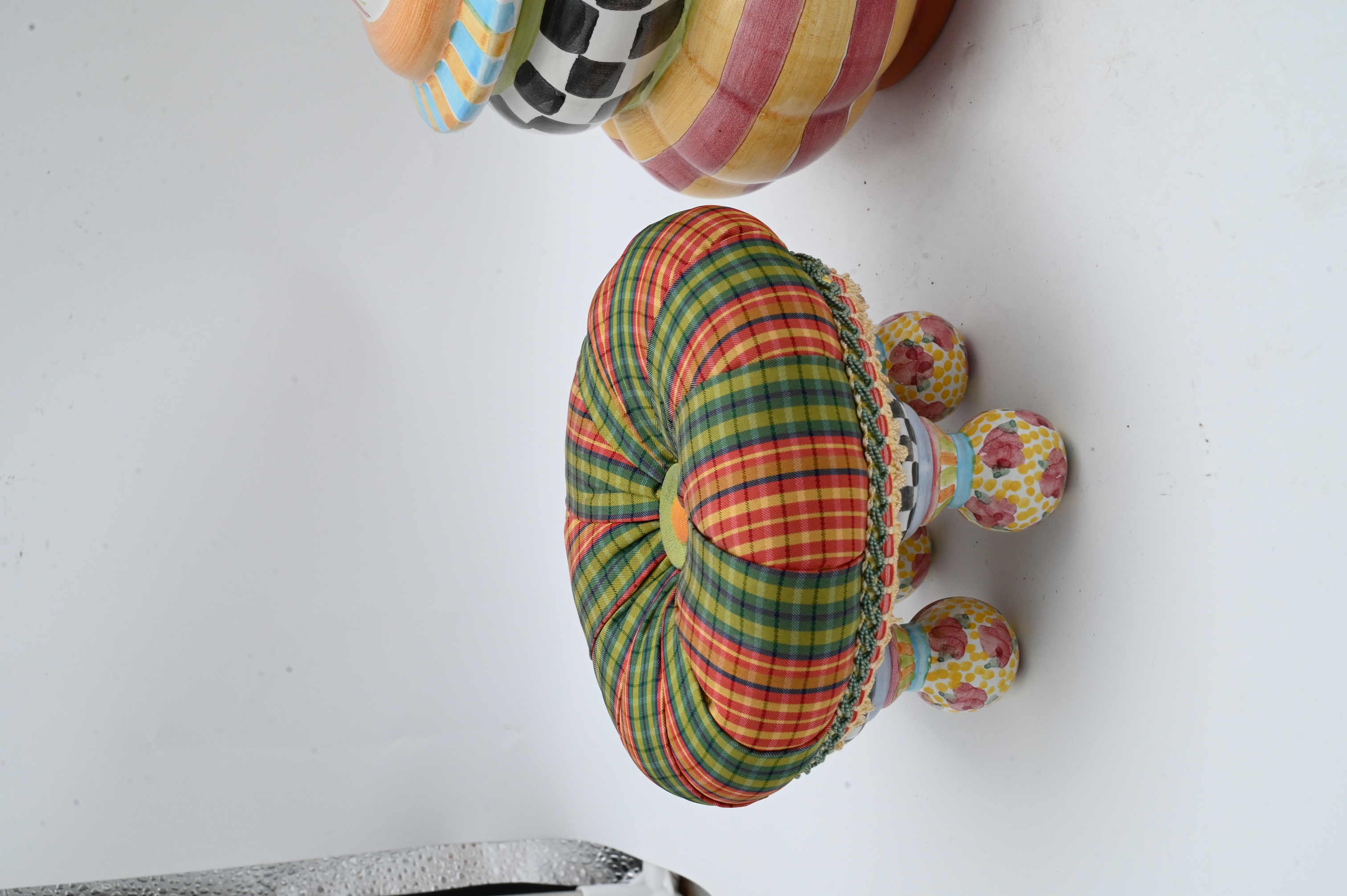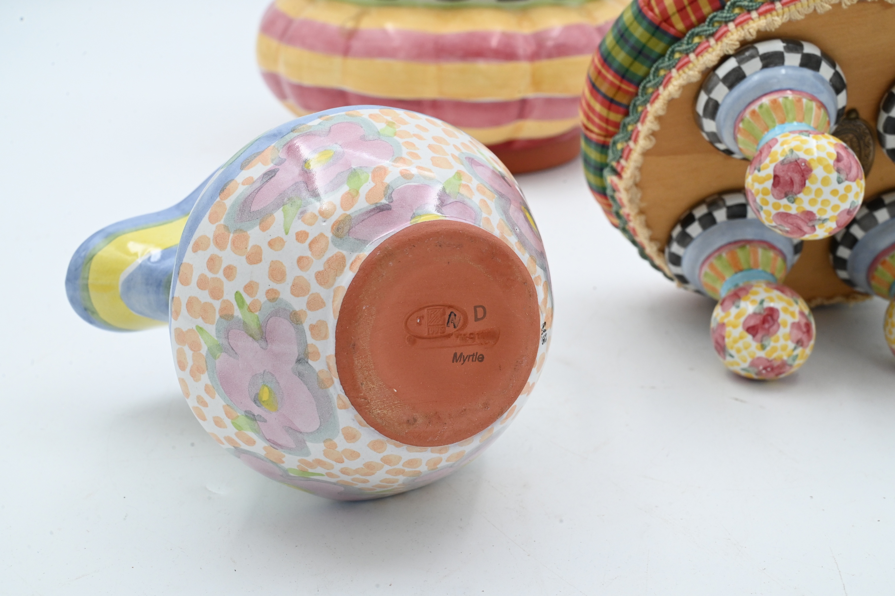 miniature tufted ottoman with brass stamp, small cream pitcher, along with covered jar