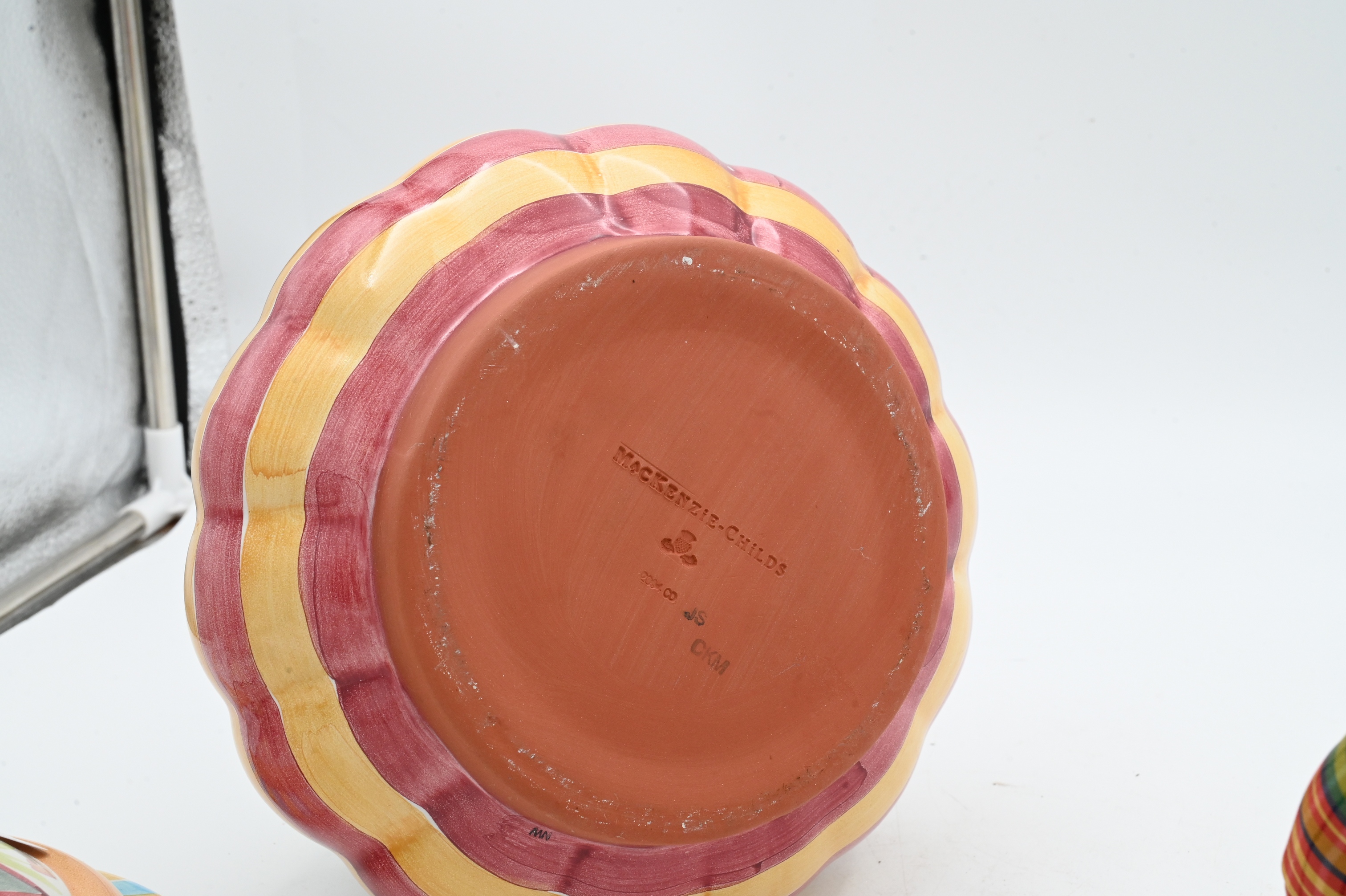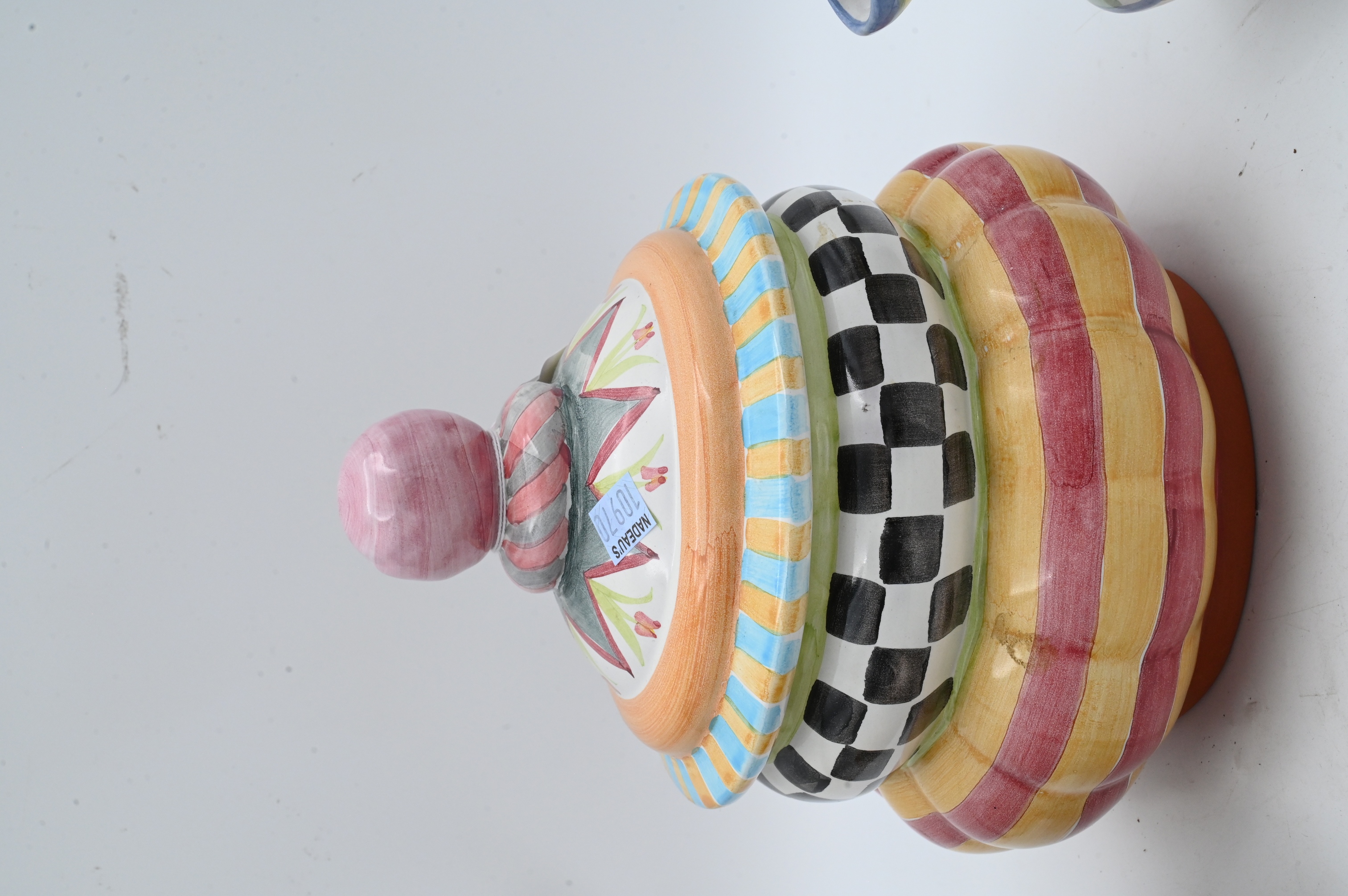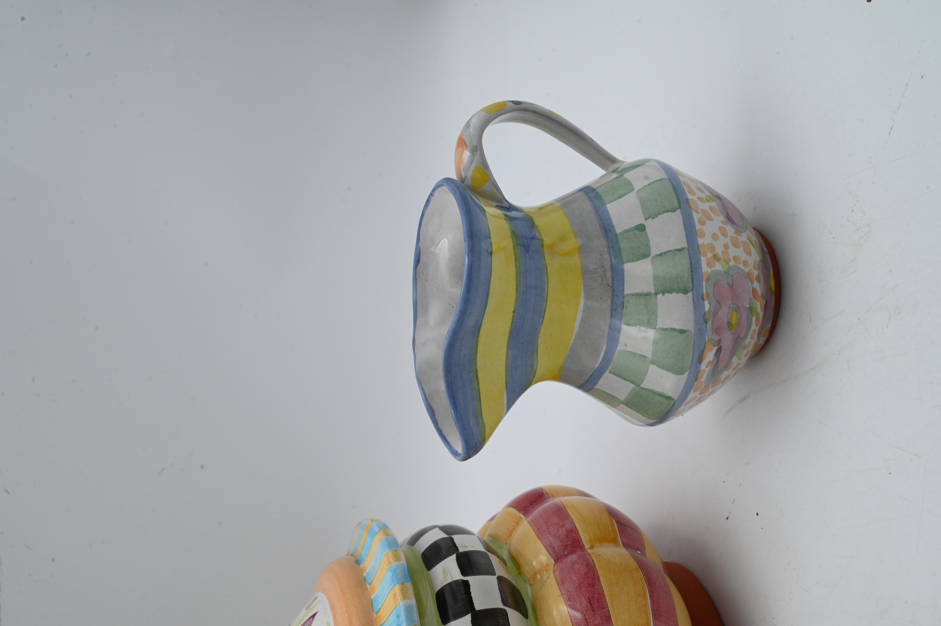 miniature tufted ottoman with brass stamp, small cream pitcher, along with covered jar
