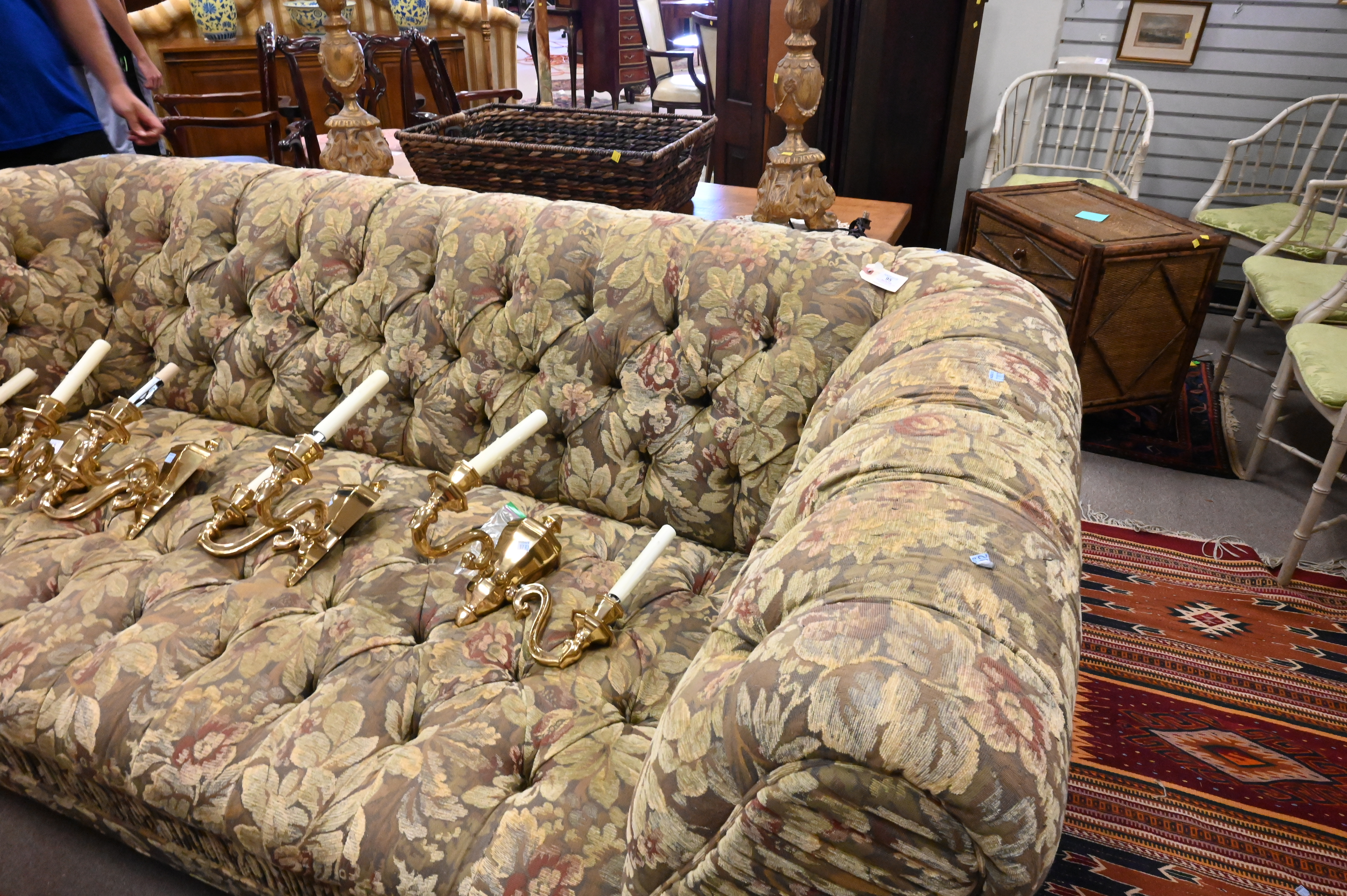 Tufted Upholstered Sofa, with tapestry style upholstery, on turned legs, height 36 inches, length 85 inches, depth 43 inches.