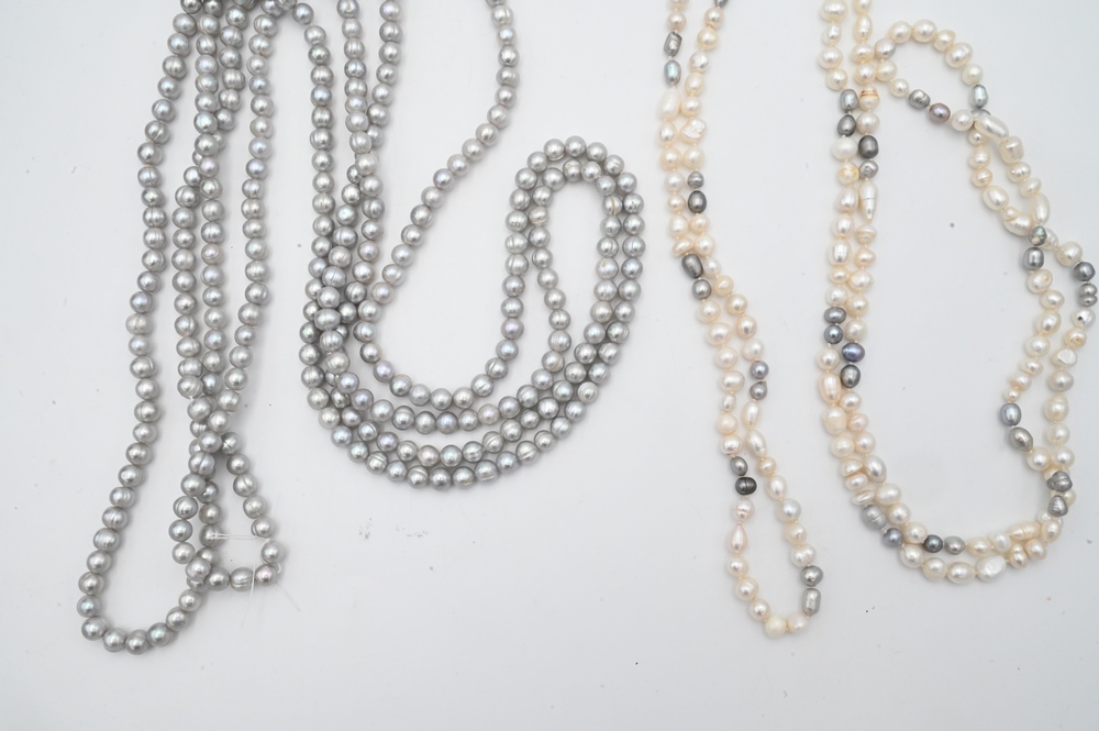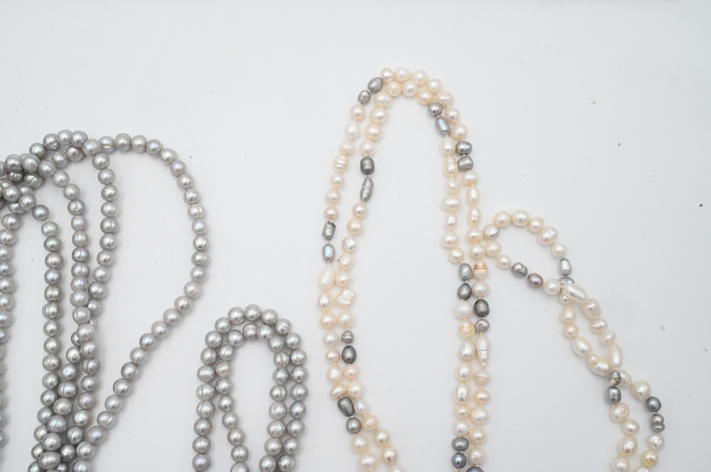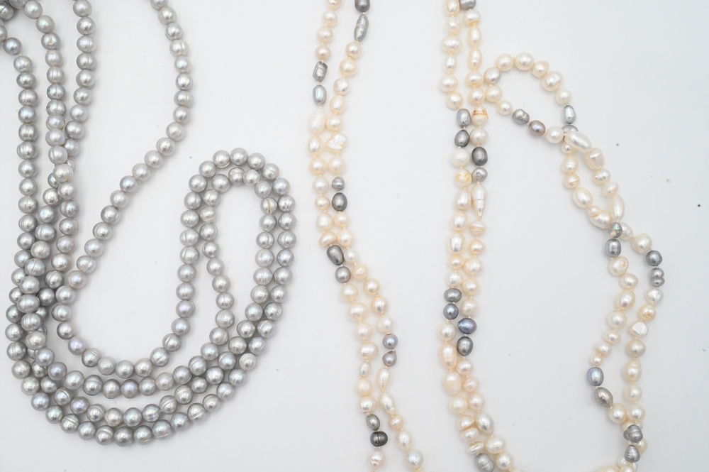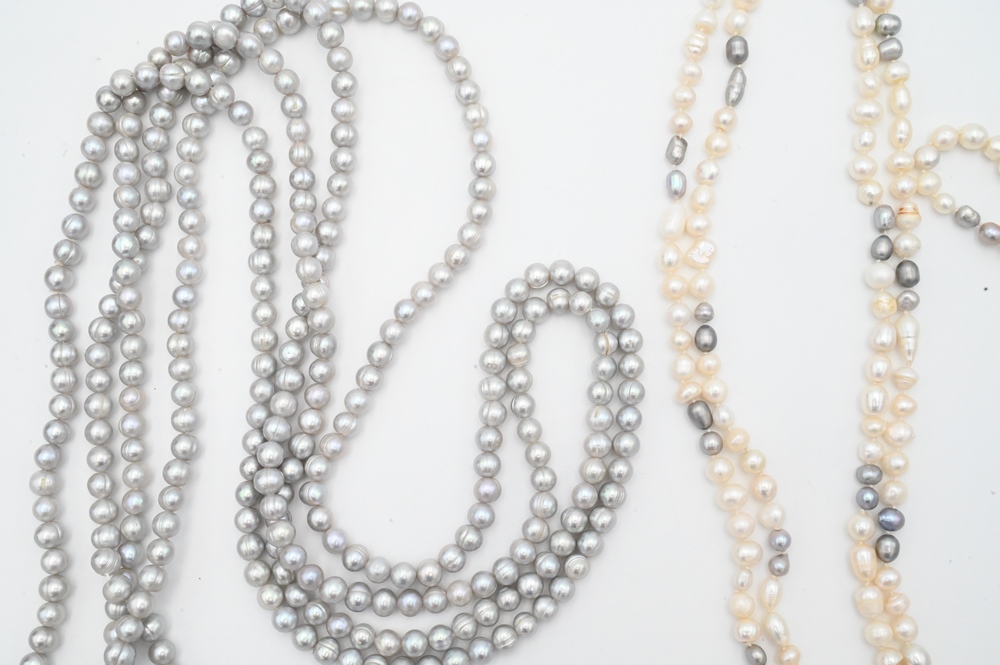 Two Long Strings of Pearls, to include grey pearls, approximately 96 inches; along with grey and white pearls, approximately 64 inches.