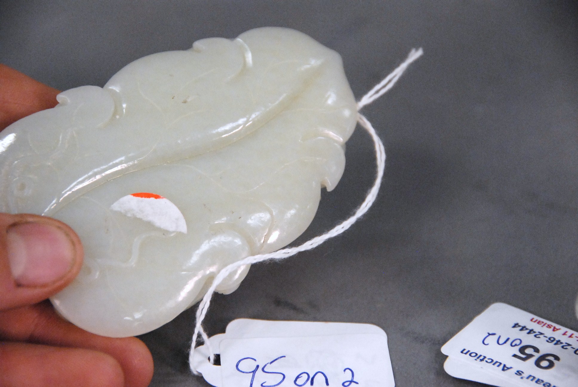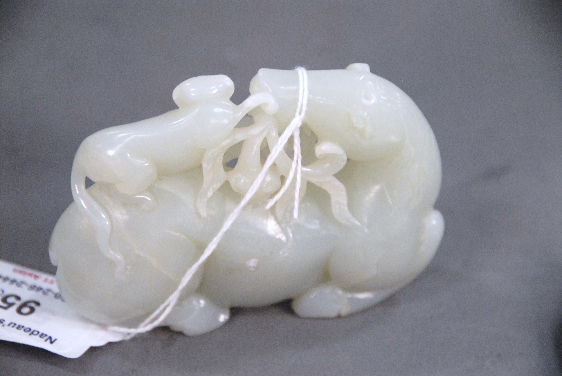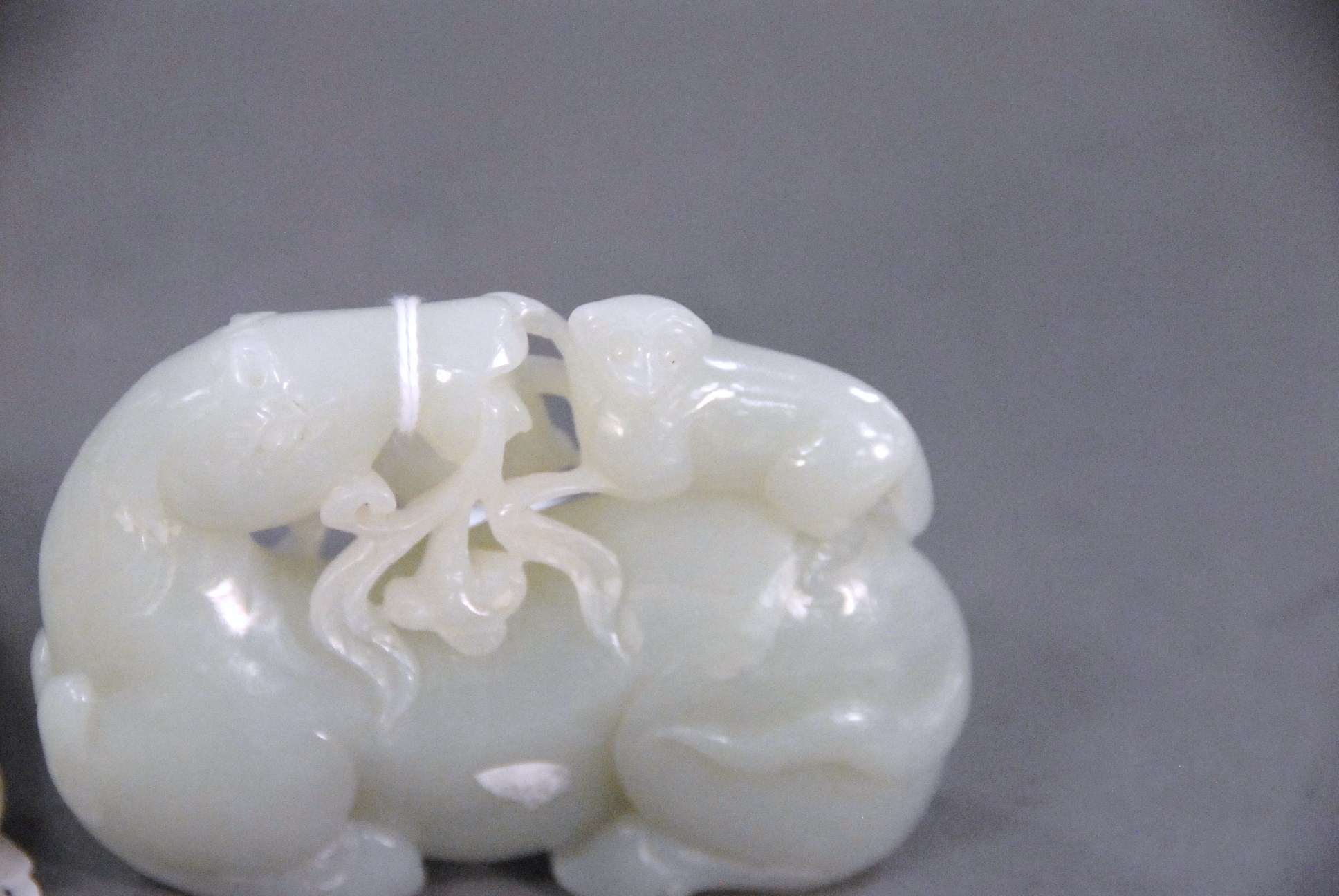 Two pieces of Chinese celadon jade in the shape of a horse and pug, and grapes, 20th century.