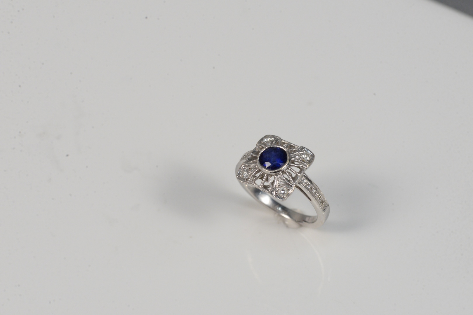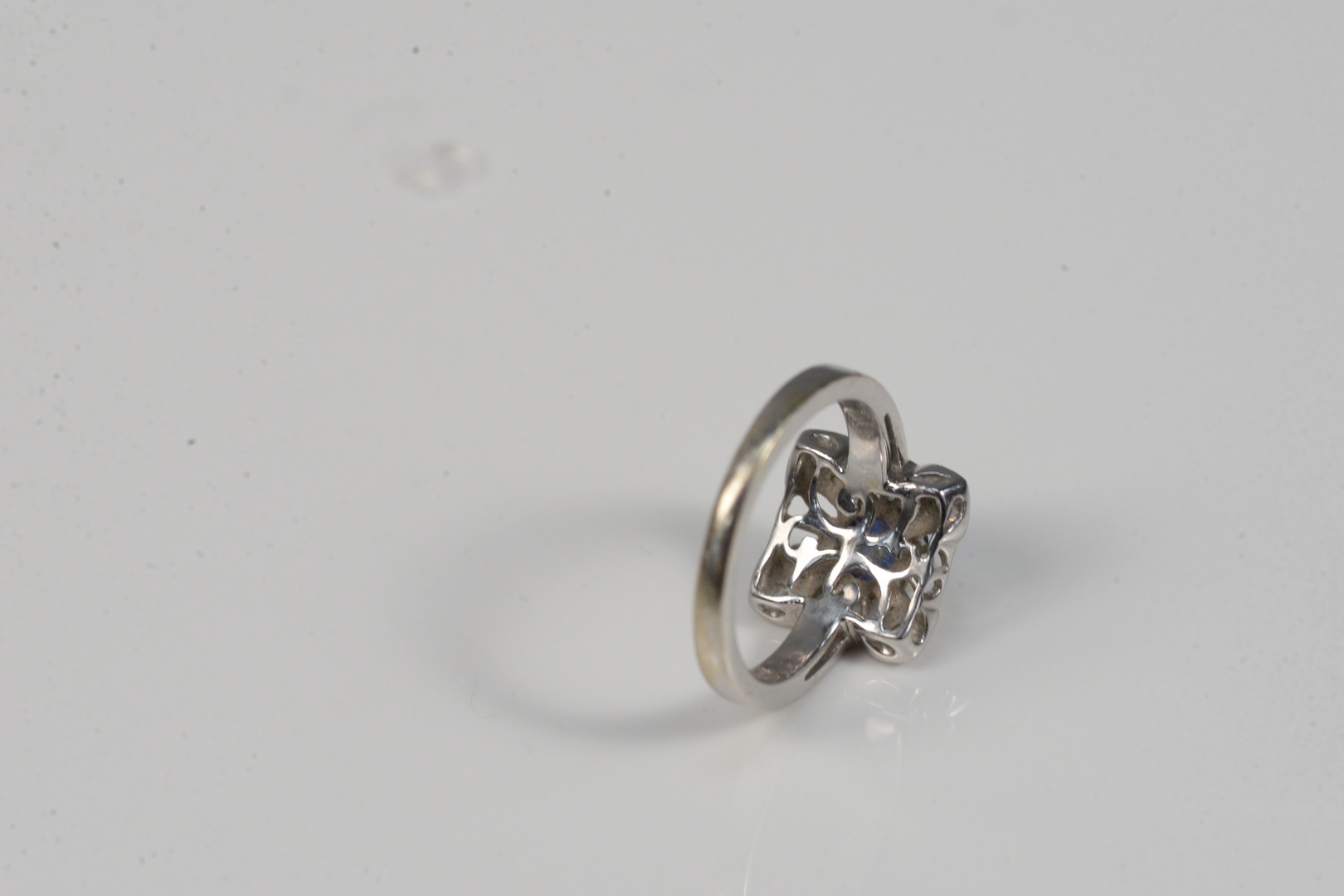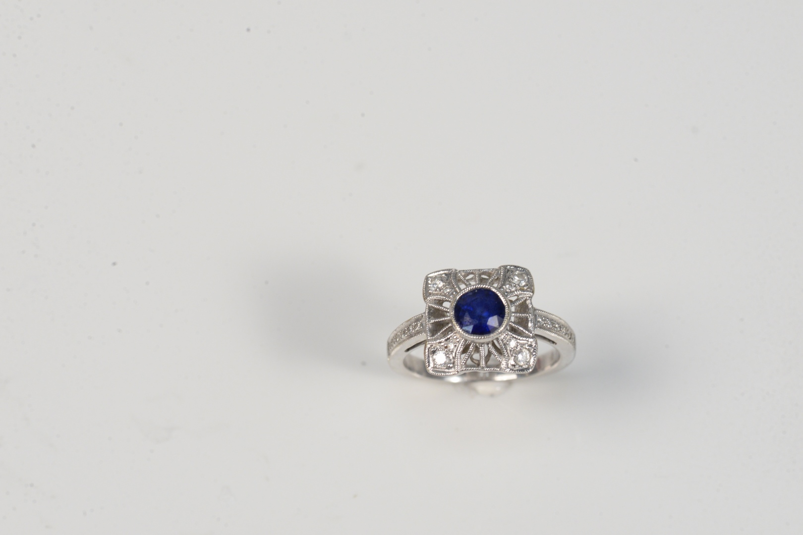 Lot 96: 18 Karat White Gold Ring with center blue sapphire, with diamond surround, and diamonds in band size 6