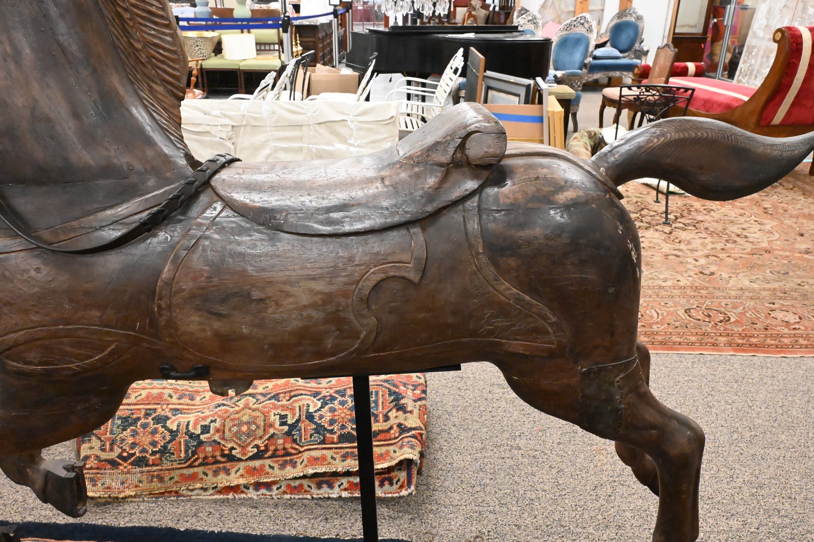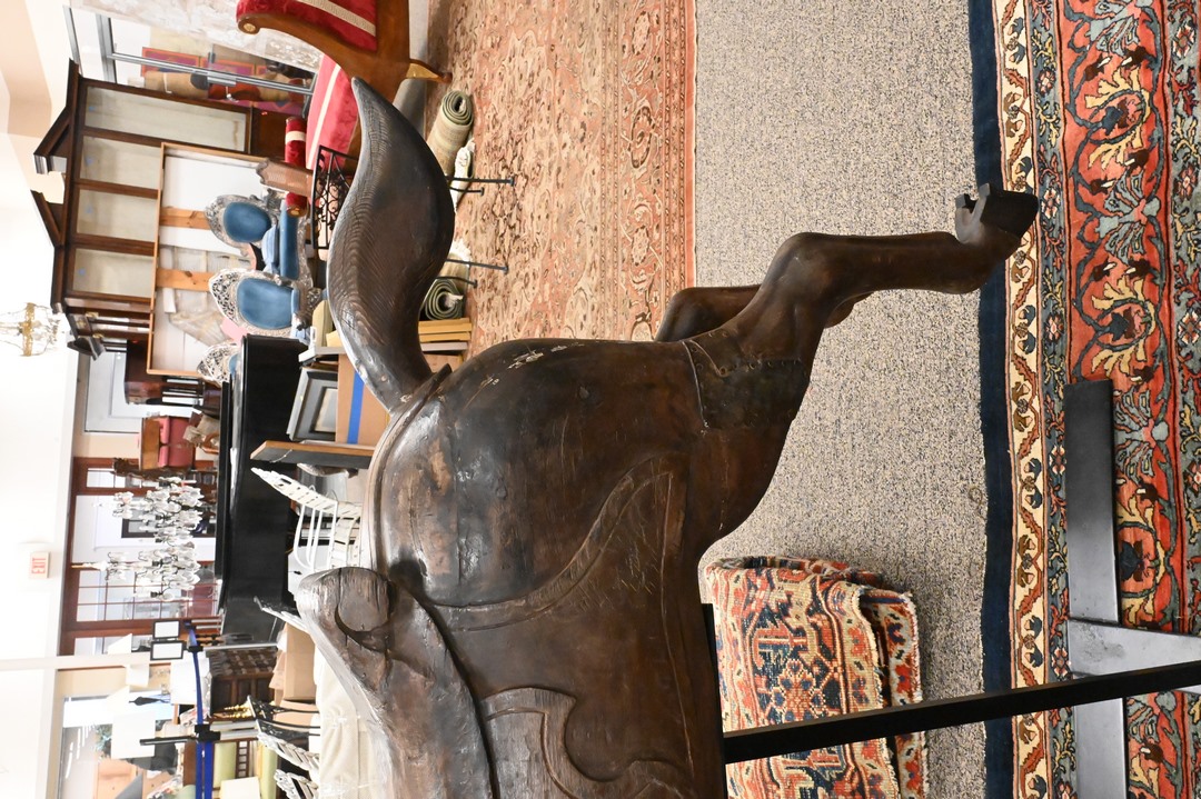 Carousel “Jumper” Horse, Bay Pine horse with flowing mane, tall and flaring nostrils, elaborate brindle and harness, iron bit with leather reins, now on metal stand, restored by J. Kostich 4/30/91, height 42 inches, length 532 inches. Provenance: Joseph Birschor 1981 – 1936. Sotheby’s New York, sale 1347, lto 265, 1/29/91.