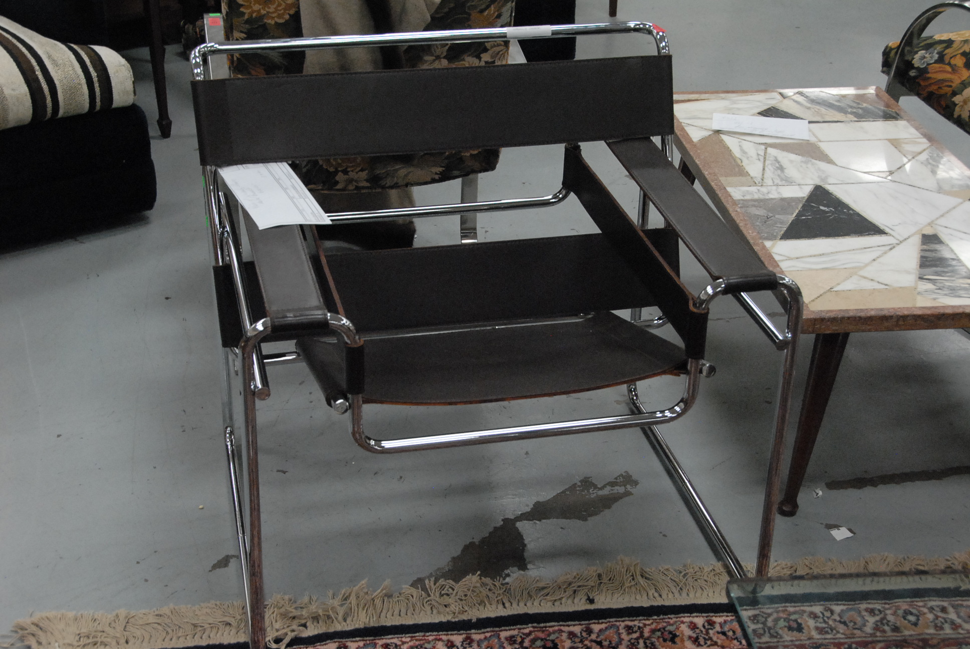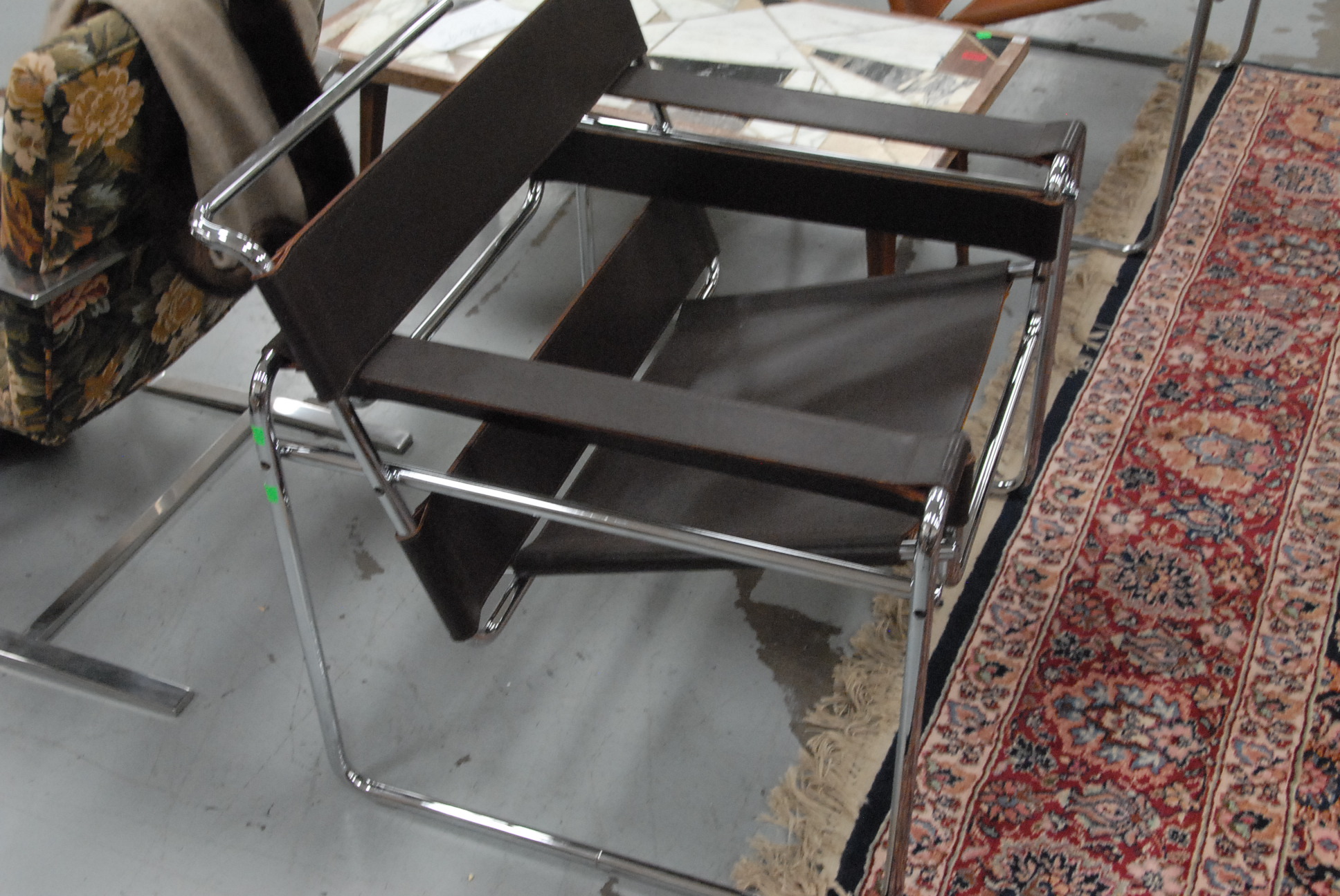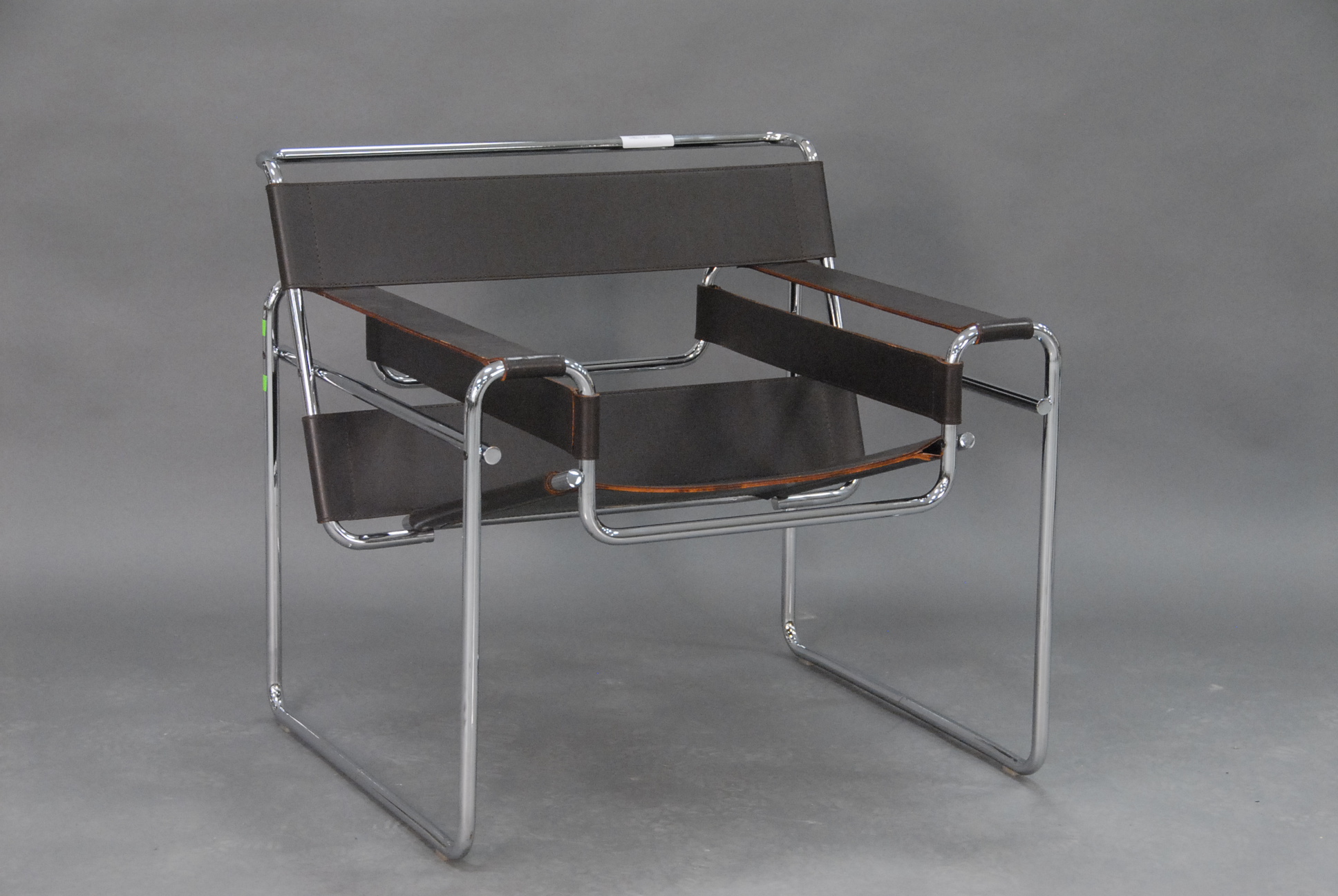Contemporary Marcel Breuer style Wassily chair of tubular chrome and dark brown leather.