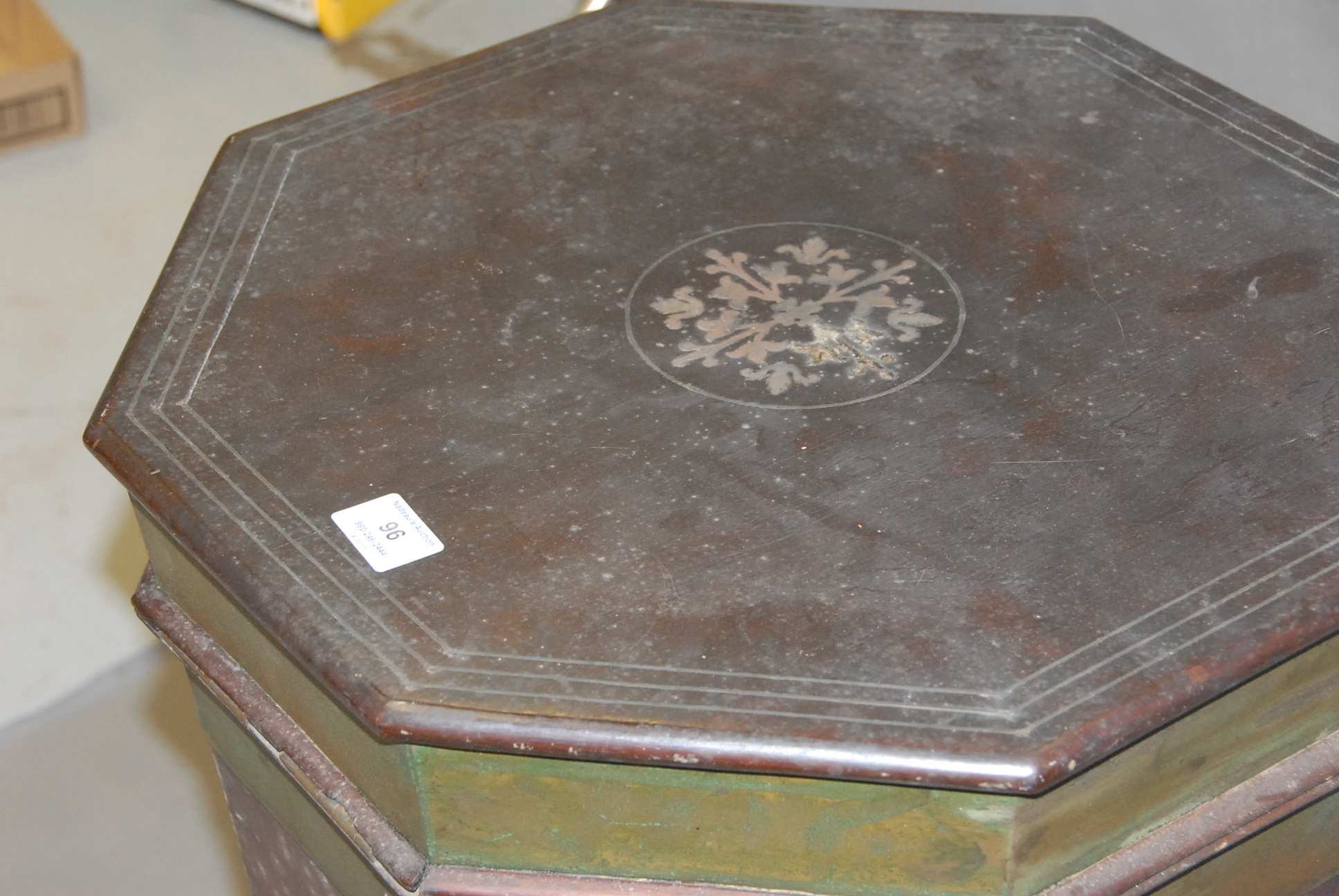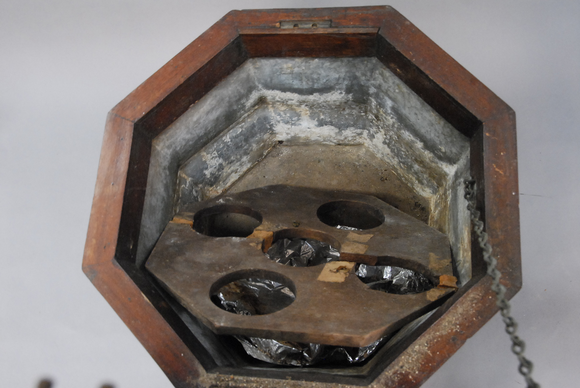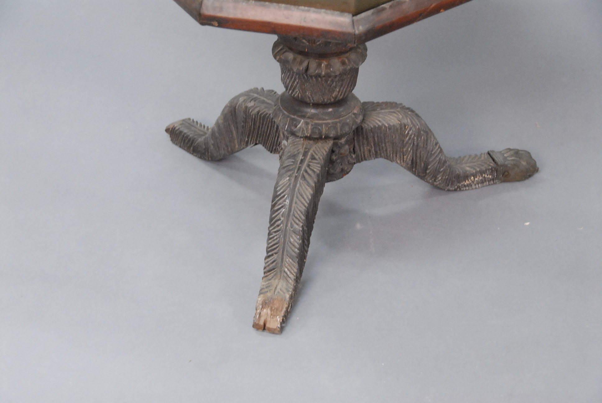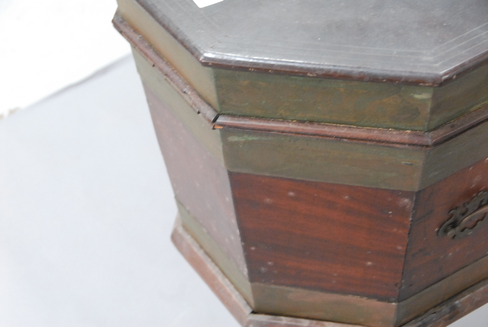 Federal mahogany cellarette octagon with brass bands set on carved pedestal on carved tripod base, one foot missing, circa 1830.