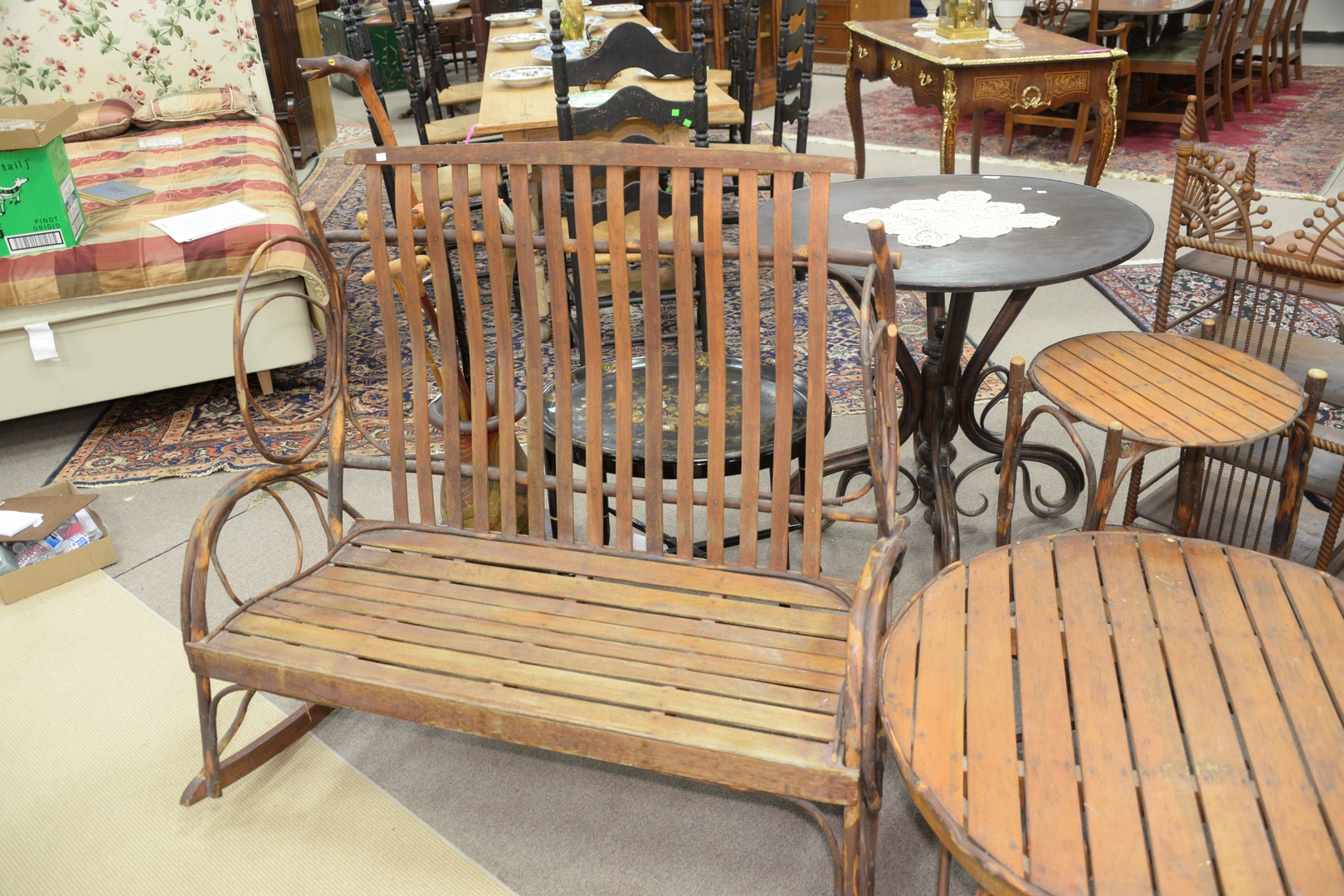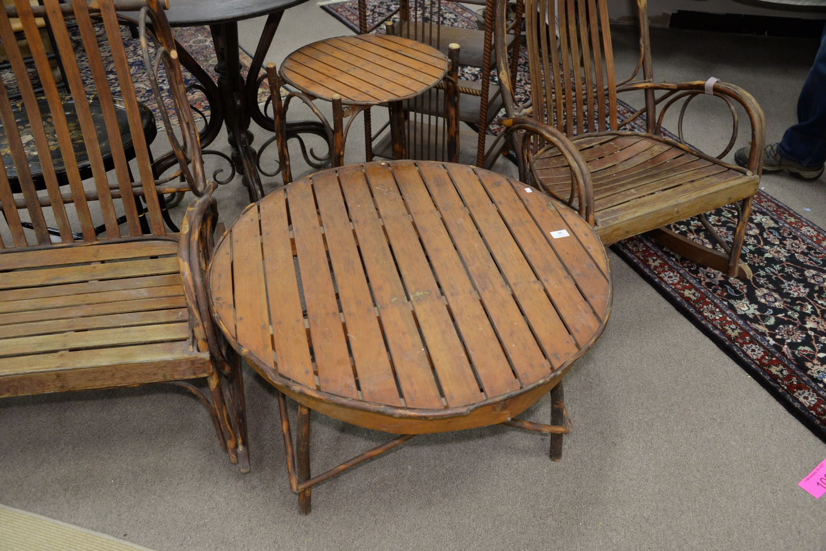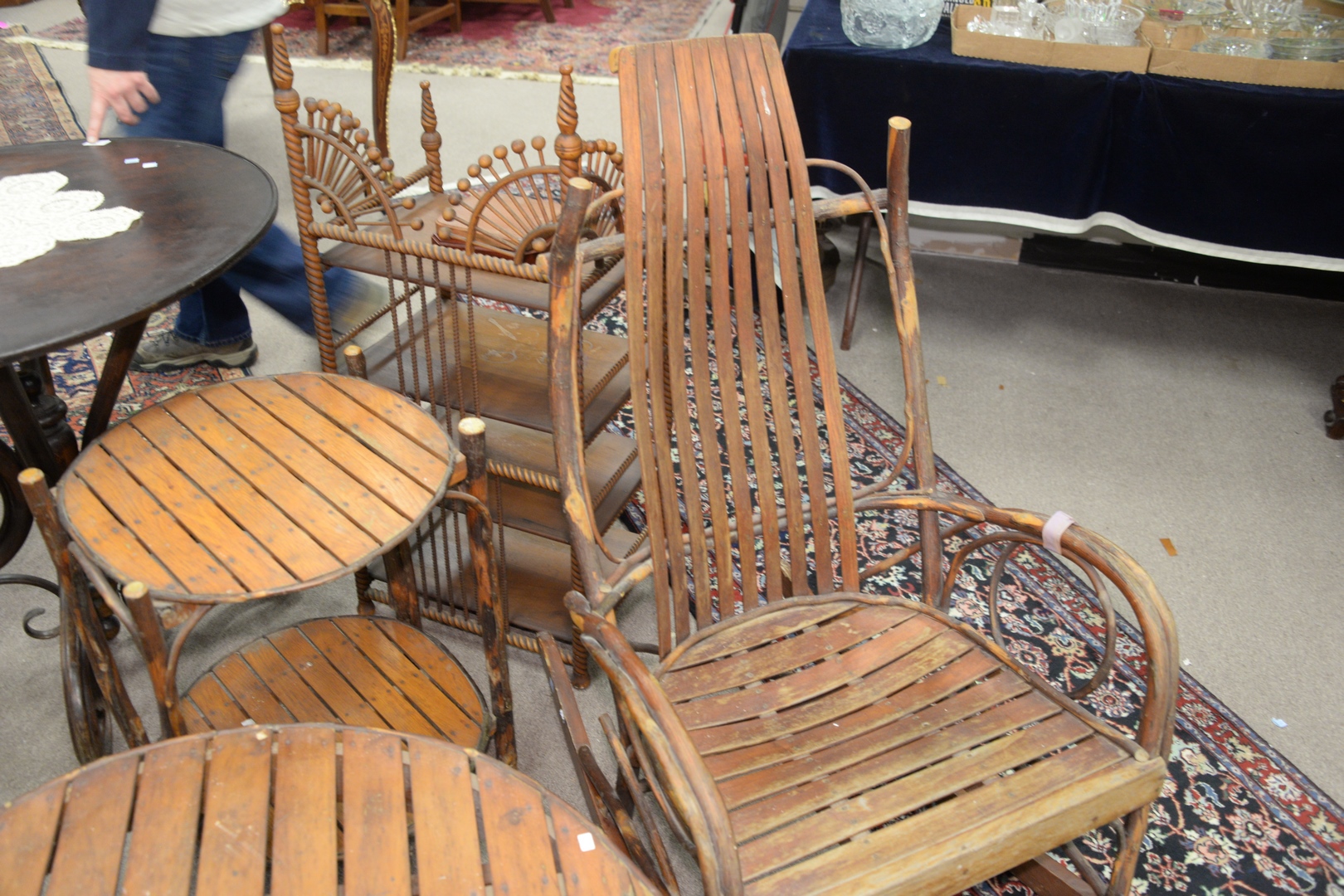 Lot 96: Four piece Adirondack Style Set to include double rocker, length 44 1/2 inches two tables, and rocker two marked Amish Adventures, …