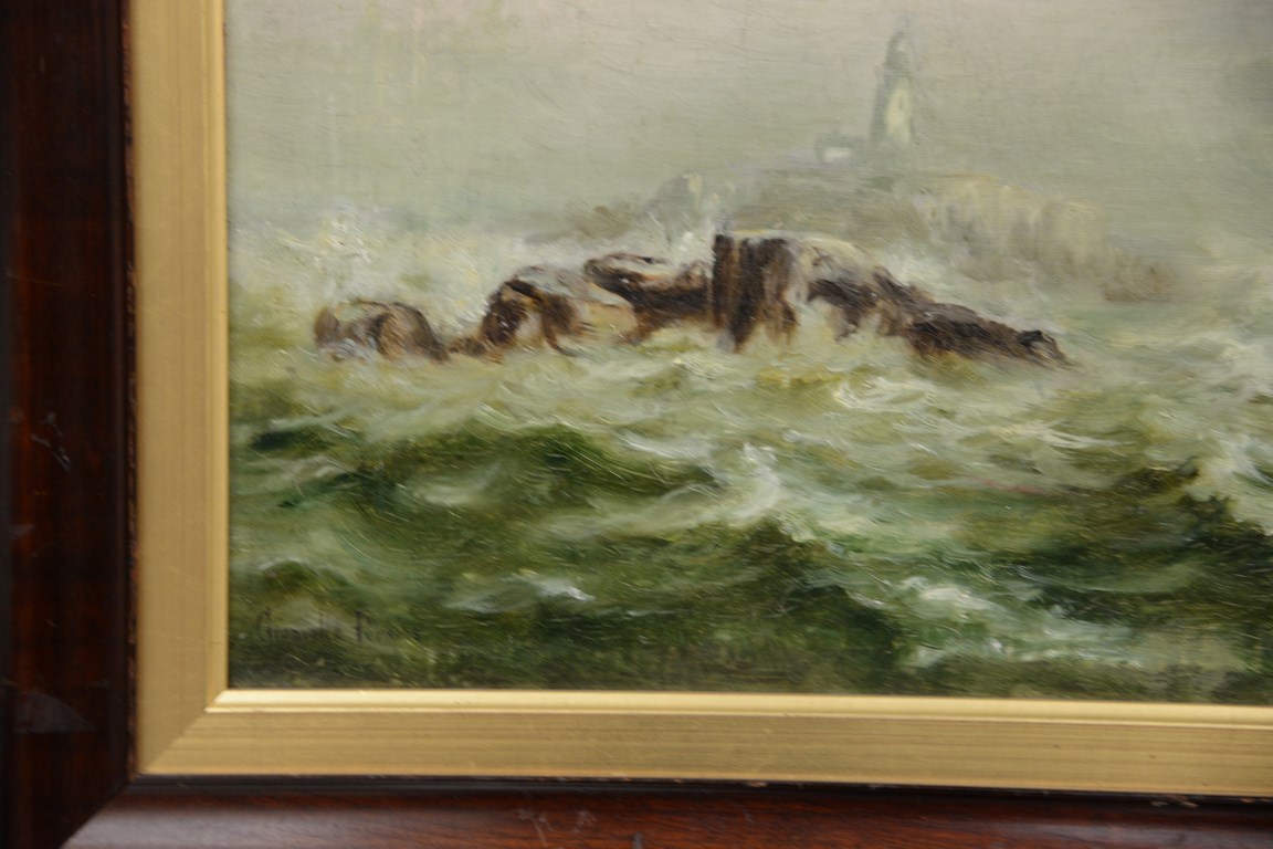 Lot 96: Granville Perkins 1830-1895 oil on canvas of skiff off rocky coast in rough seas, signed lower left Granville Perkins, restretched…