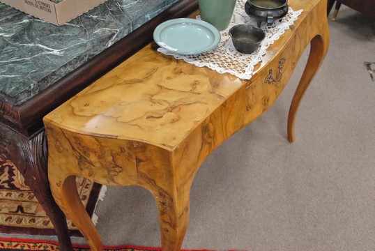 Italian burled olive wood console table. ht. 29in., wd. 46in., dp. 13in.