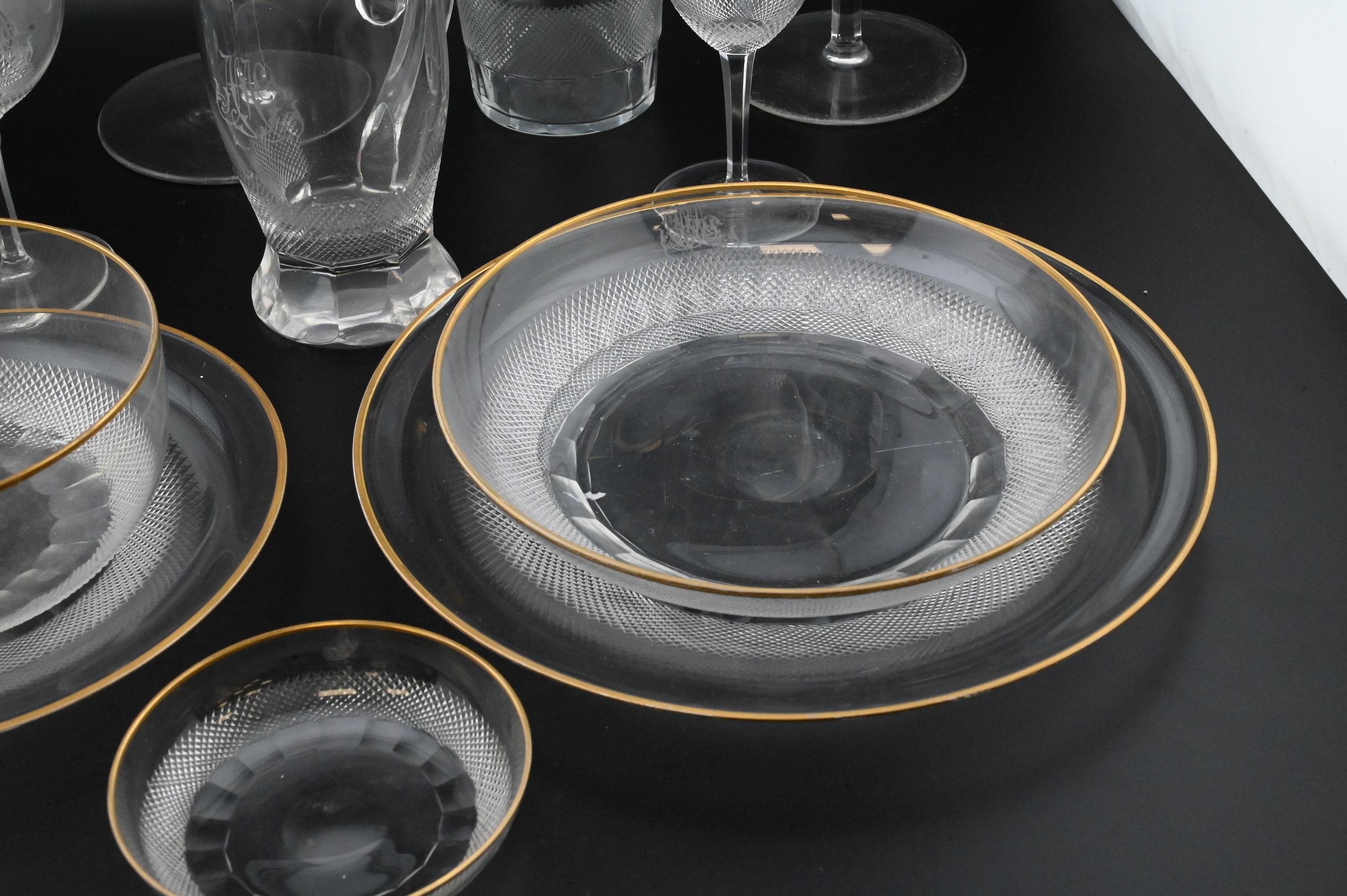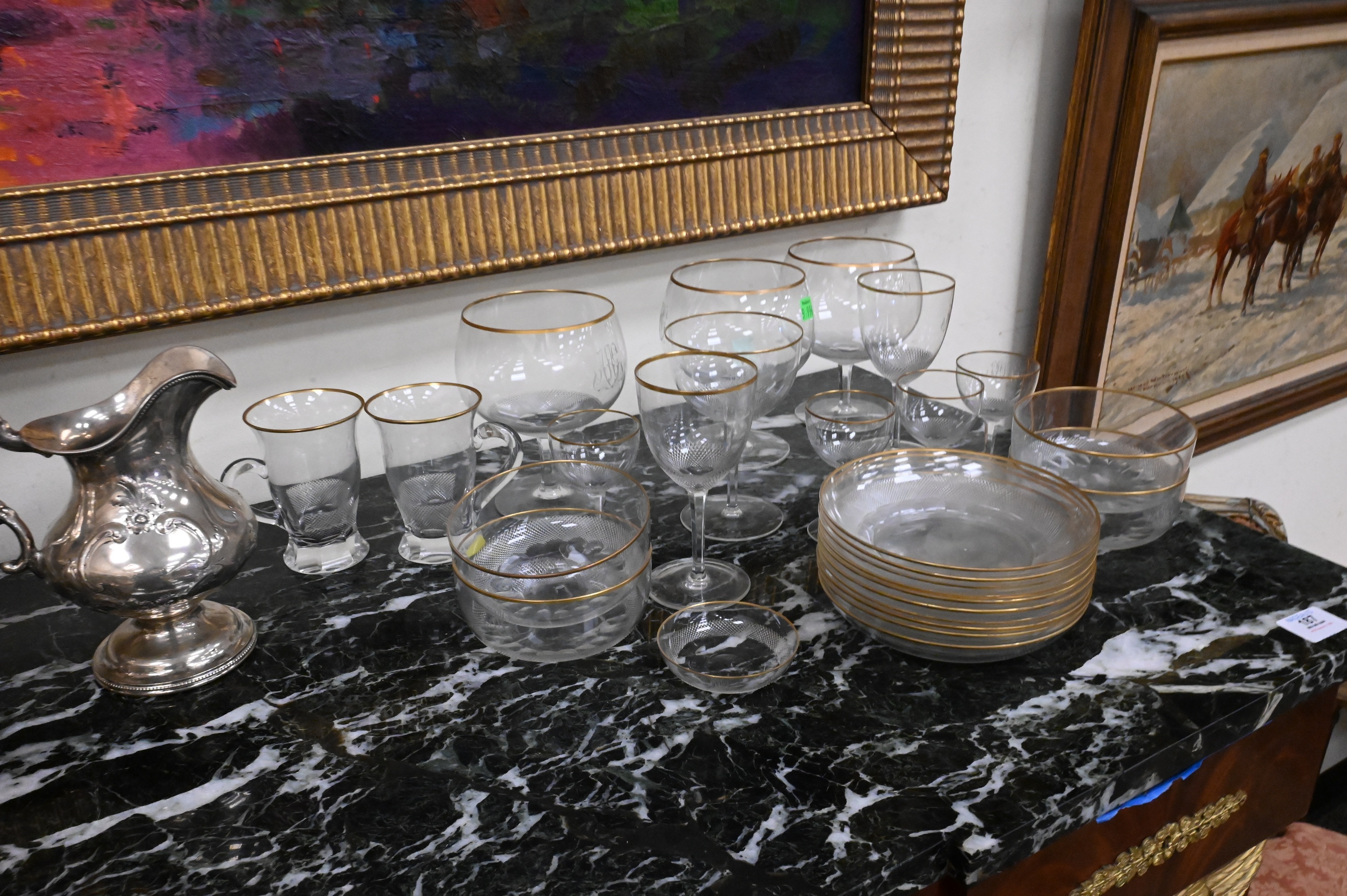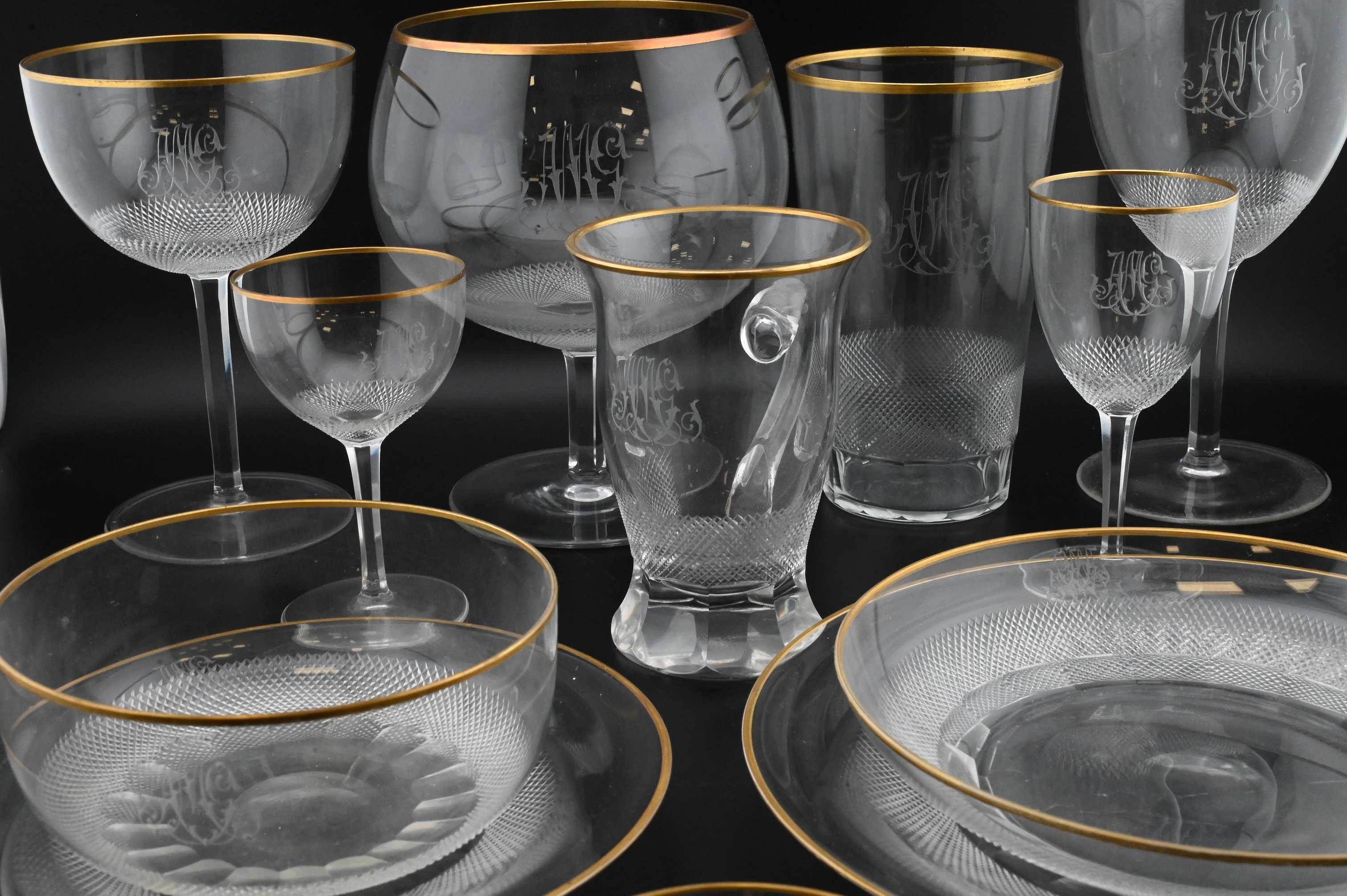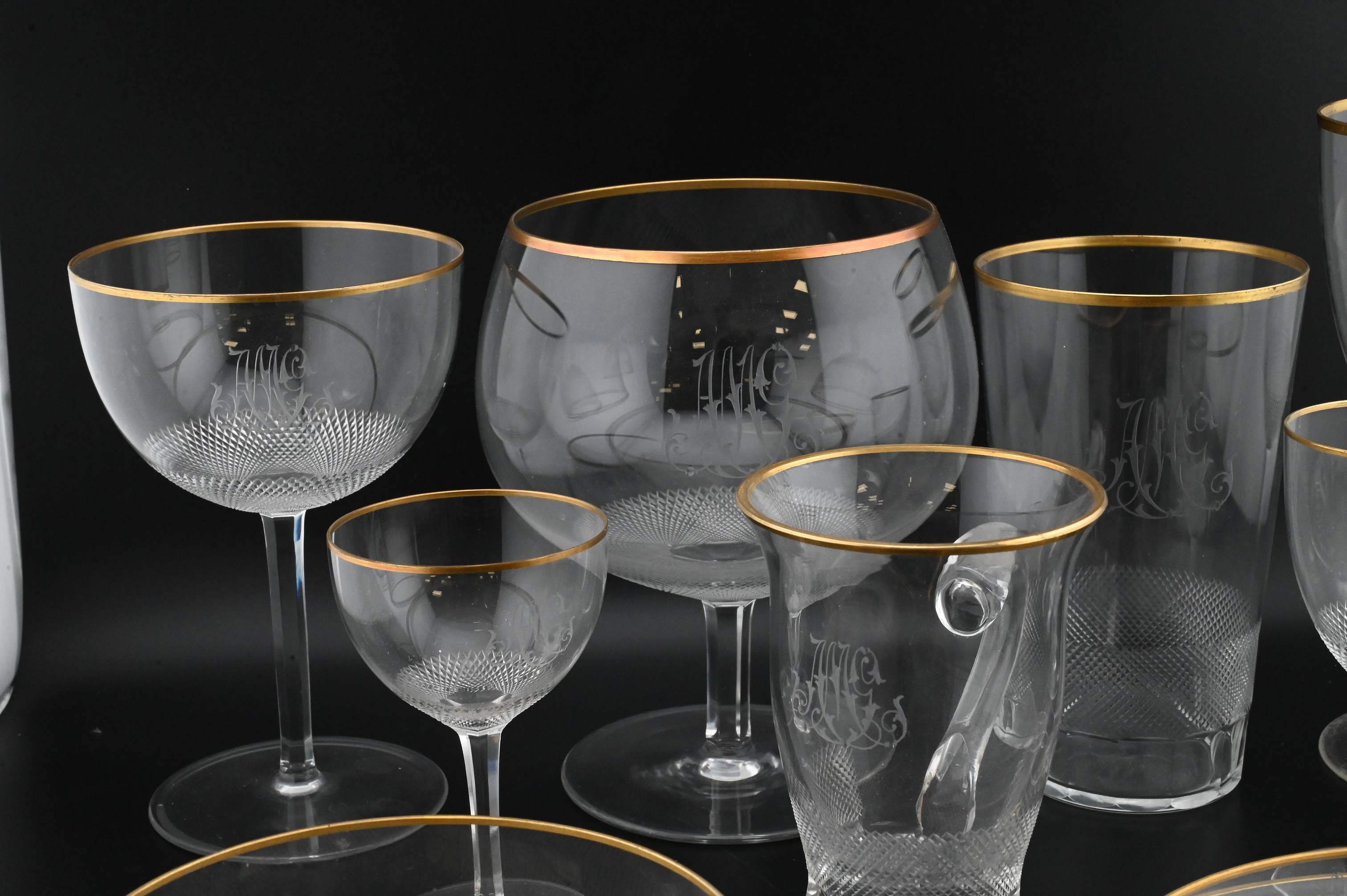 extensive and elegant clear glass service, each piece monogrammed and decorated with a finely cut cross-hatched (diamond) band and finished with a gilt rim, service includes a full selection of stemware and table glasses, including 12 large water goblets, 10 red wine glasses with rounded bowls, 3 smaller white wine glasses, 15 cordial/after-dinner stems, 11 sherry stems, 10 brandy snifters, and 6 tumblers, 18 berry bowls, 12 finger bowls, 17 matching under plates, and 10 Irish coffee–form handled glasses, 9 small bowls, 1 water pitcher, all executed in the same engraved and gilt pattern