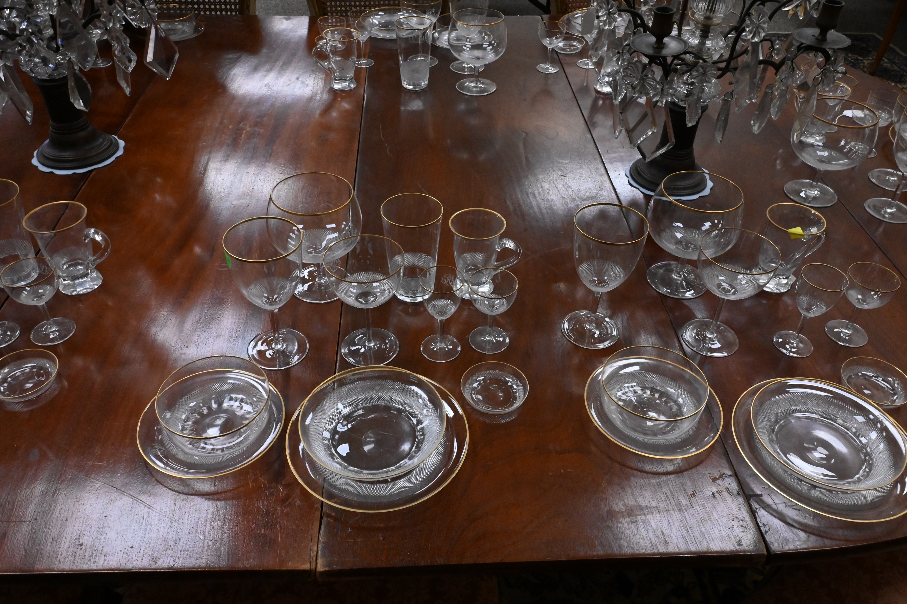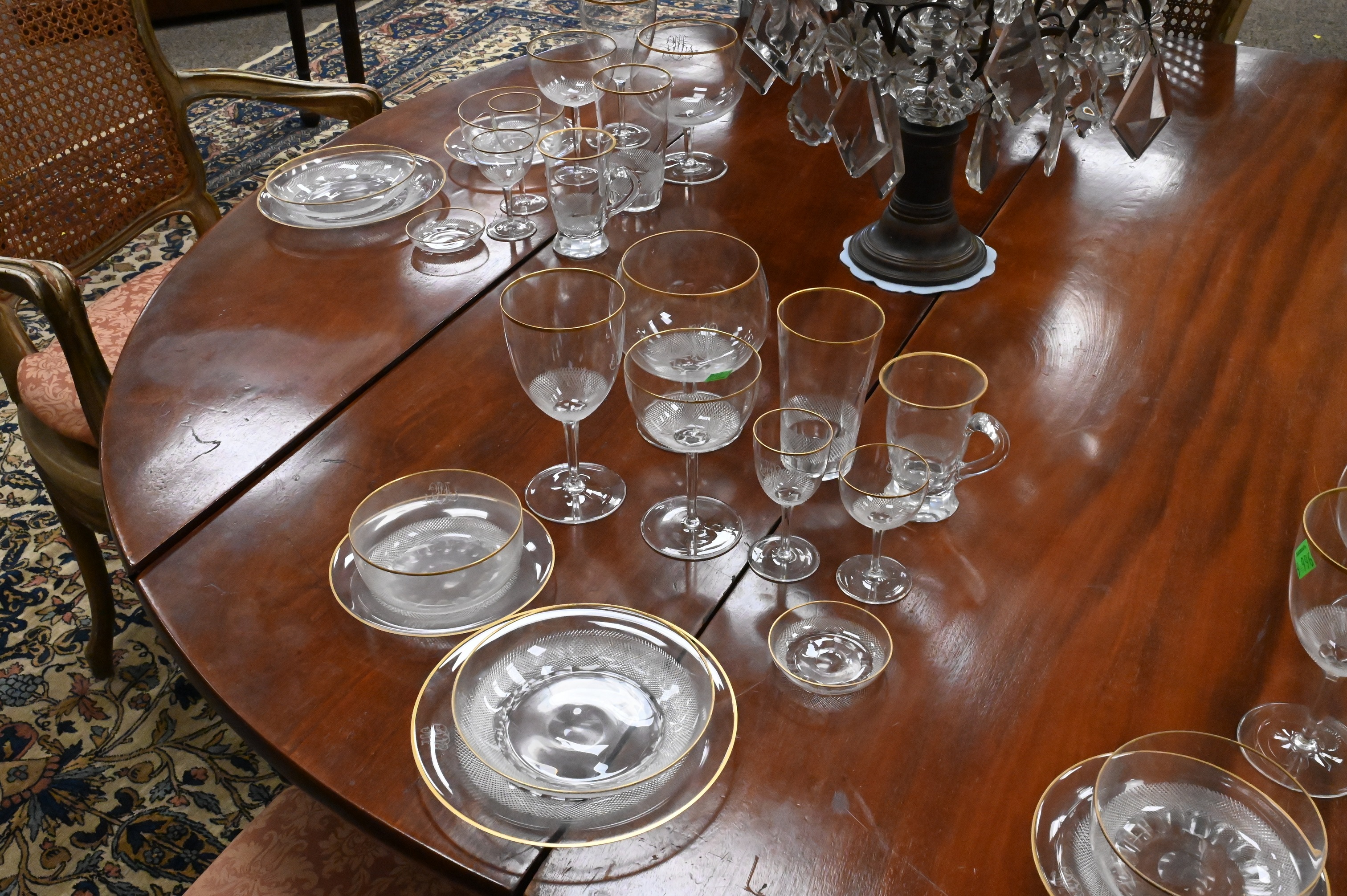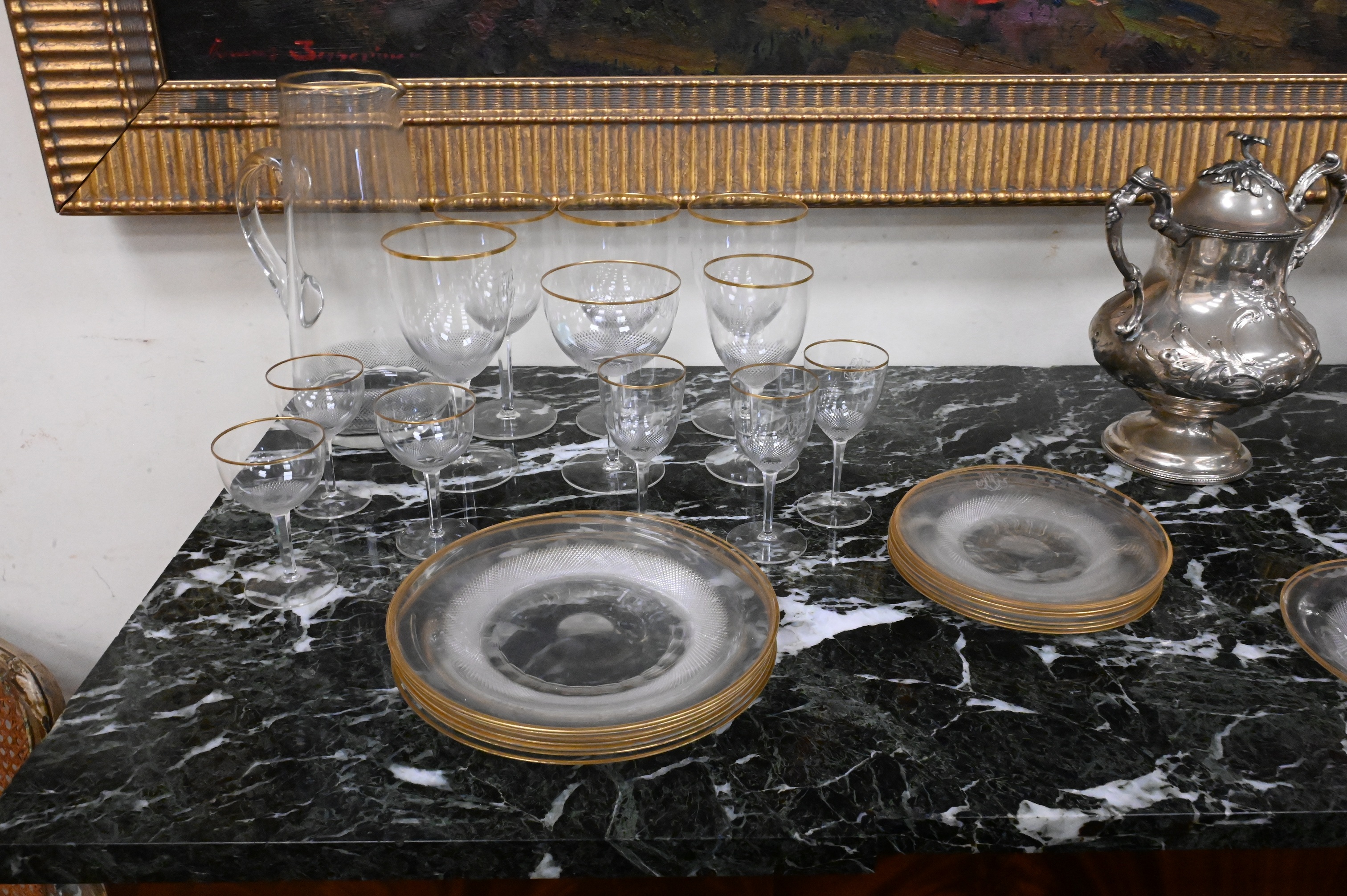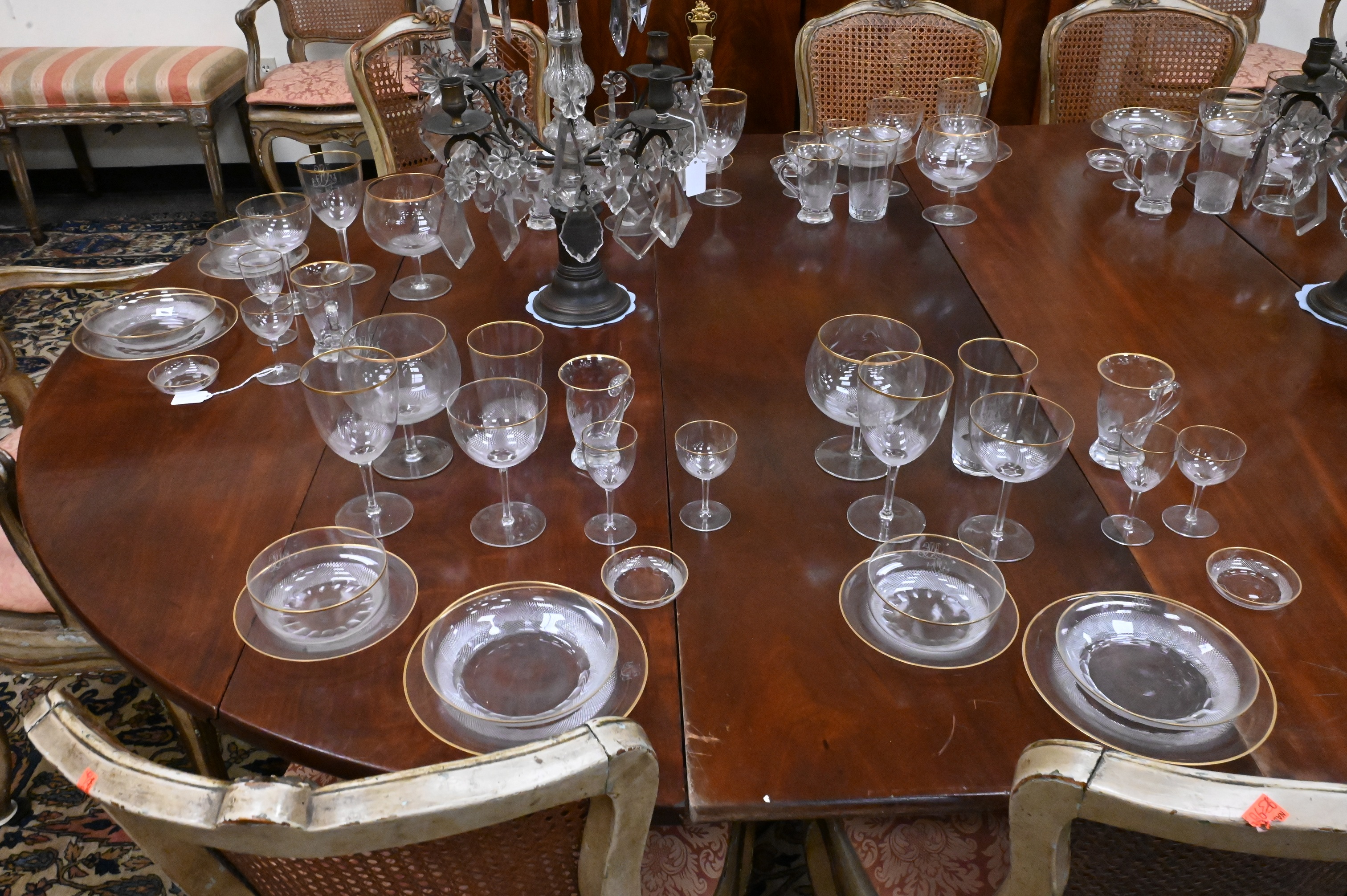 extensive and elegant clear glass service, each piece monogrammed and decorated with a finely cut cross-hatched (diamond) band and finished with a gilt rim, service includes a full selection of stemware and table glasses, including 12 large water goblets, 10 red wine glasses with rounded bowls, 3 smaller white wine glasses, 15 cordial/after-dinner stems, 11 sherry stems, 10 brandy snifters, and 6 tumblers, 18 berry bowls, 12 finger bowls, 17 matching under plates, and 10 Irish coffee–form handled glasses, 9 small bowls, 1 water pitcher, all executed in the same engraved and gilt pattern