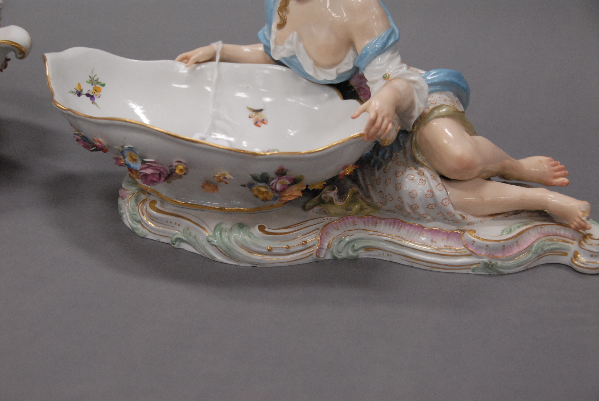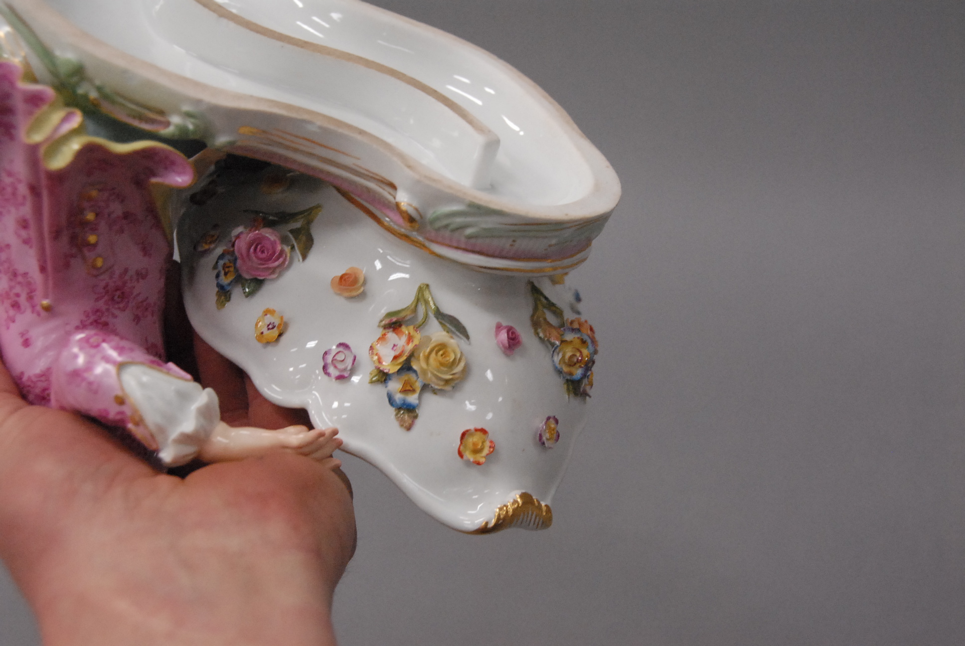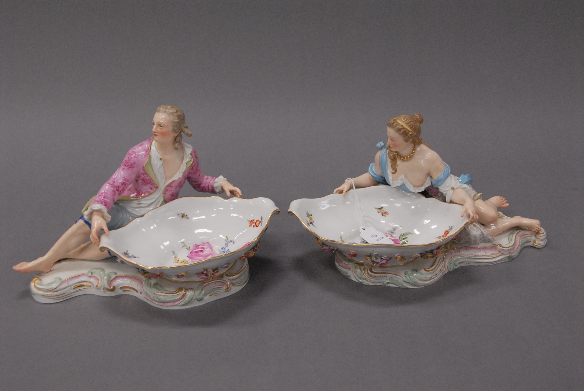 Lot 96: Pair of Meissen dishes on bases, each mounted with figures male and female and three dimensional flowers. ht. 6 1/2in. lg. 13in.