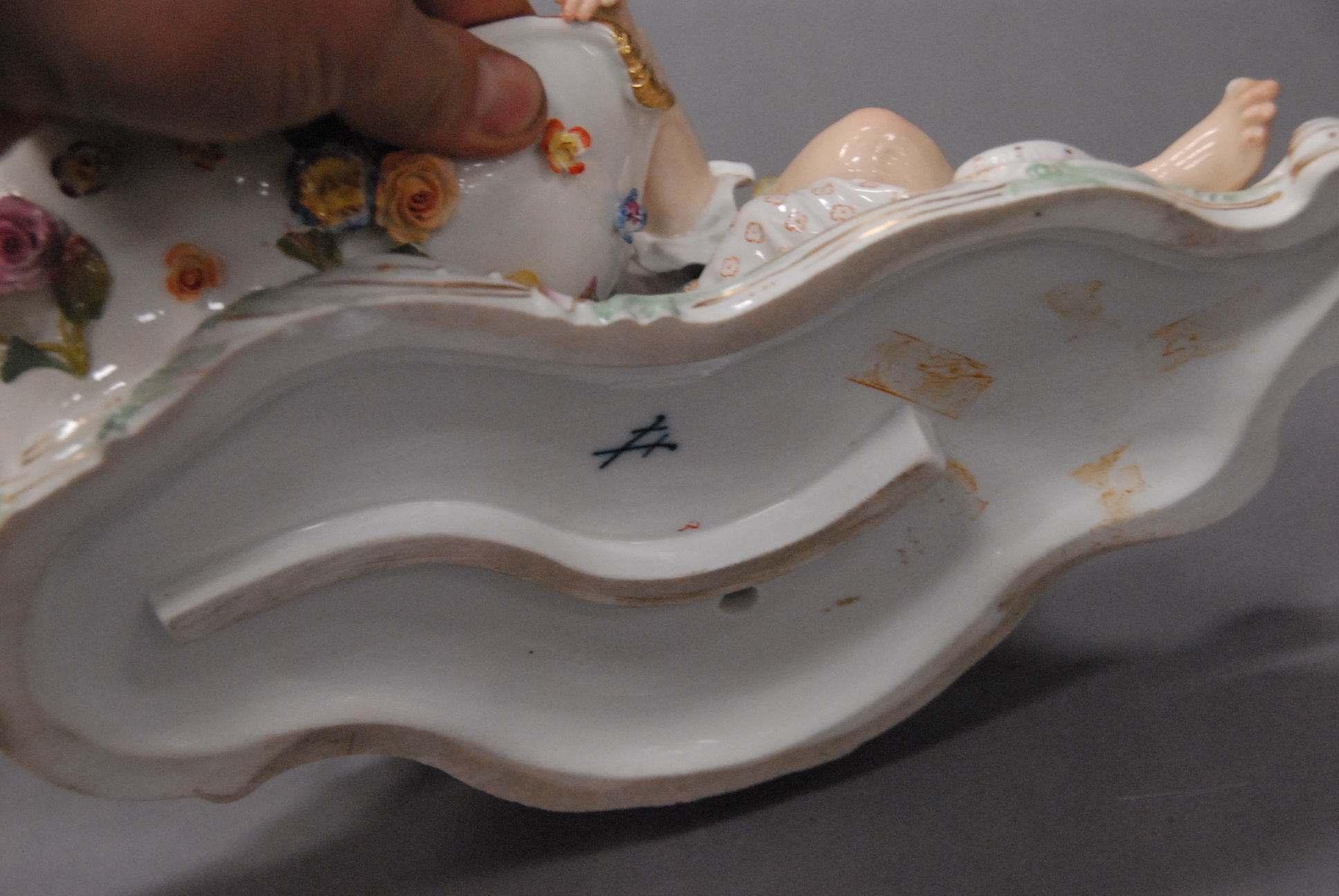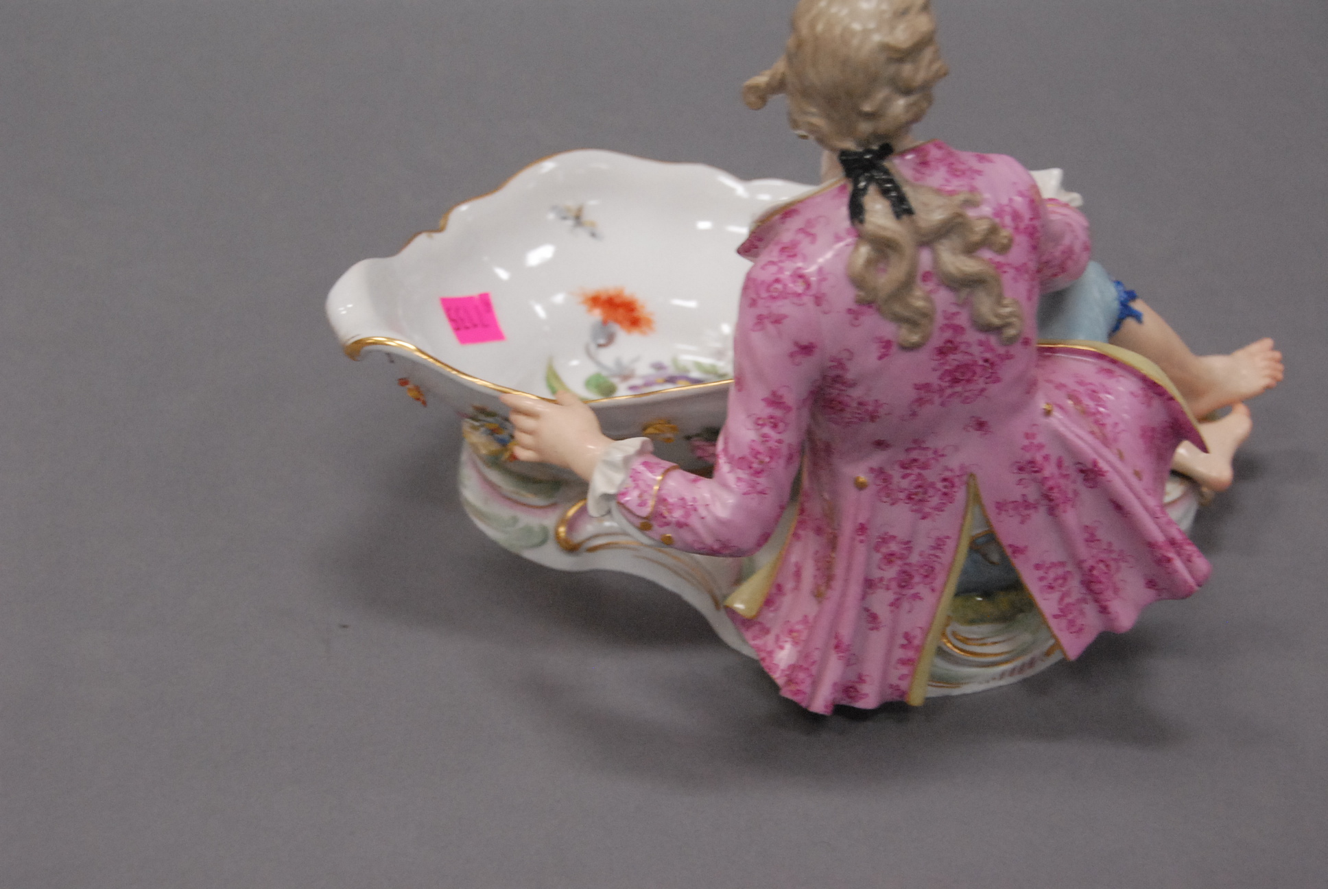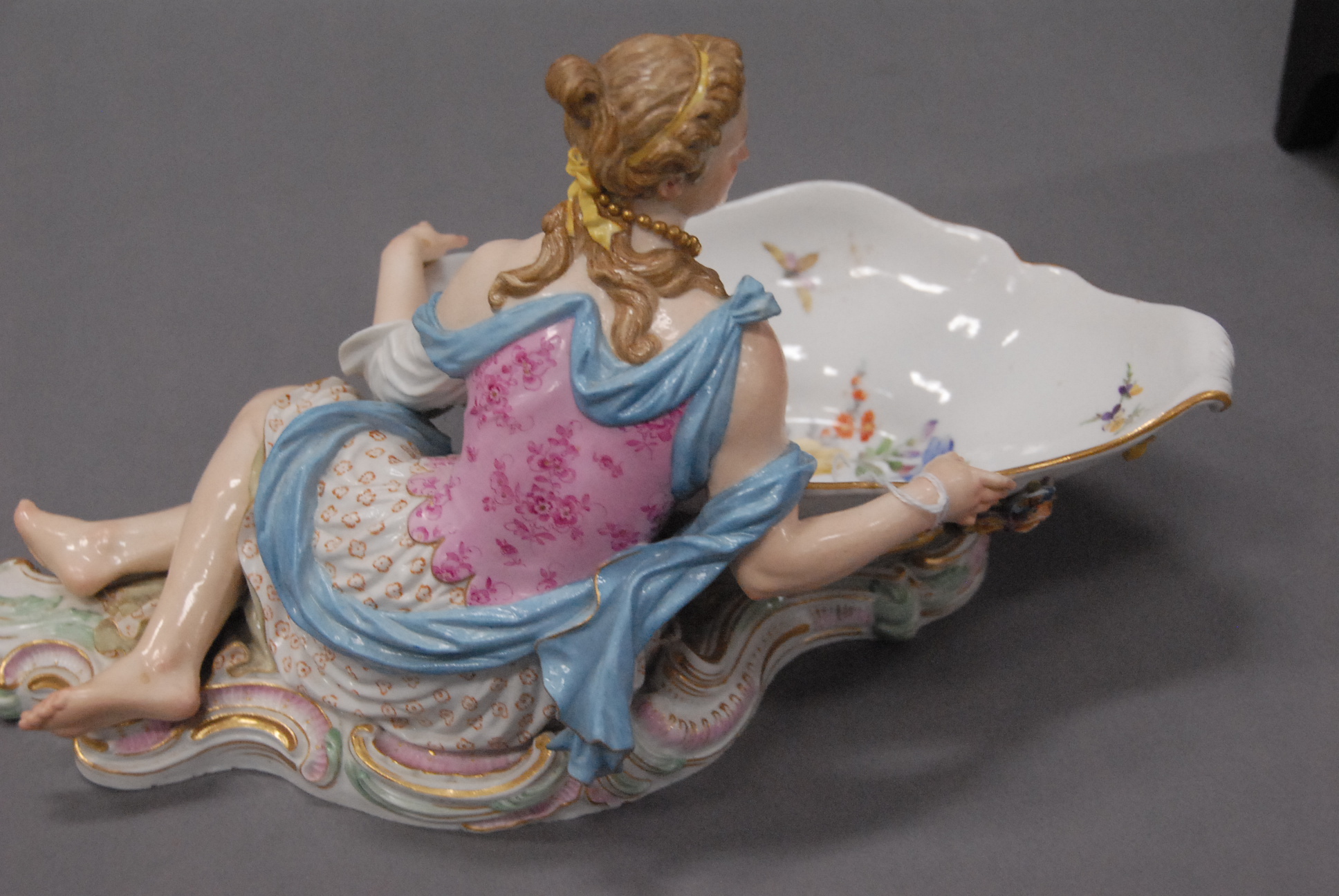 Lot 96: Pair of Meissen dishes on bases, each mounted with figures male and female and three dimensional flowers. ht. 6 1/2in. lg. 13in.