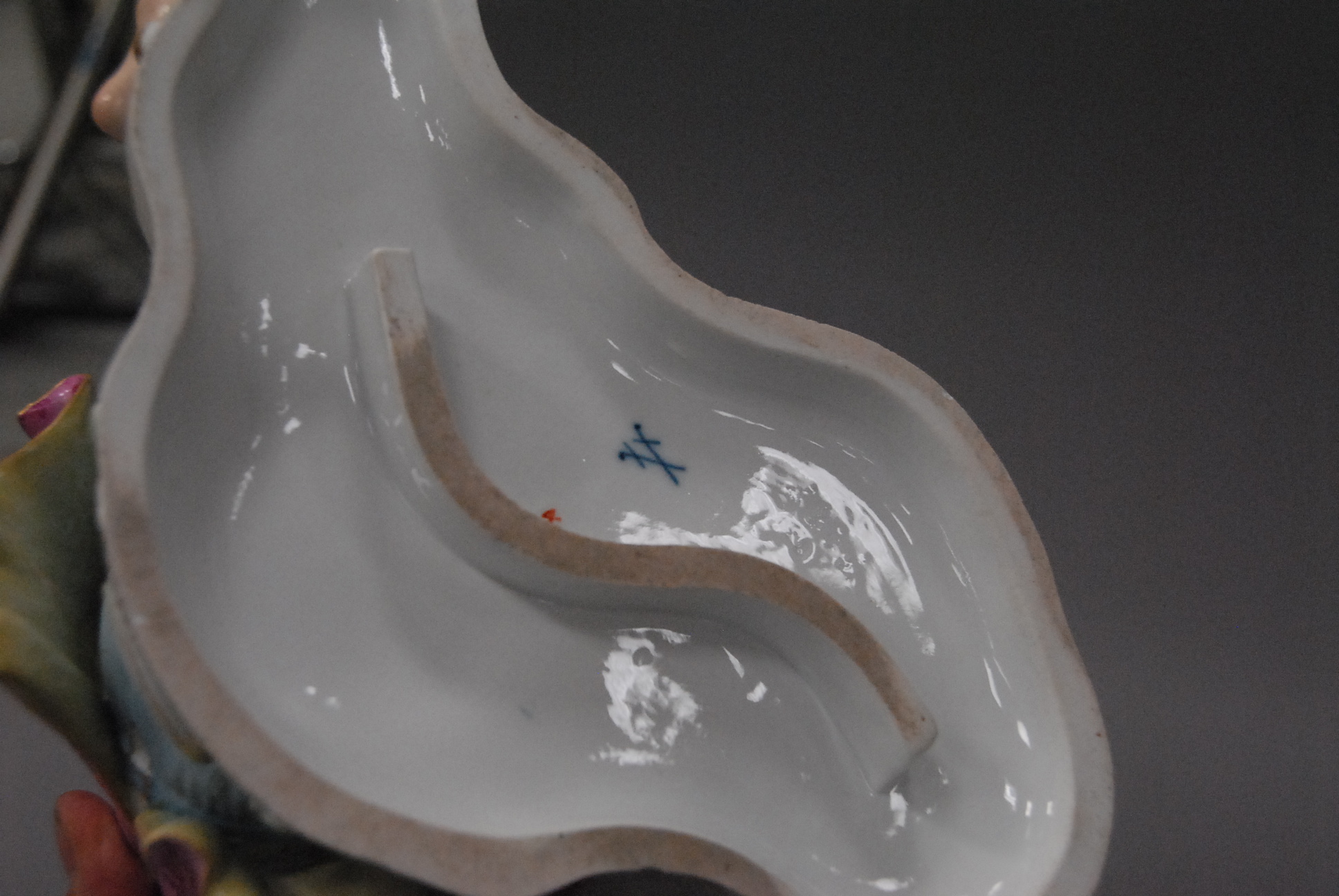 Pair of Meissen dishes on bases, each mounted with figures male and female and three dimensional flowers. ht. 6 1/2in. lg. 13in.