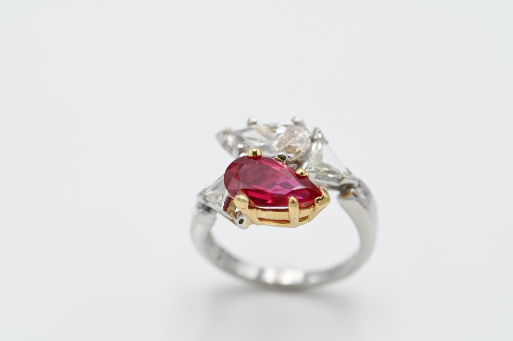 Lot 96: Platinum Ring, set with diamonds and ruby, pear shaped diamond, 1.54 carats; two trillion cut diamonds, .85 carats; lab created ruby…