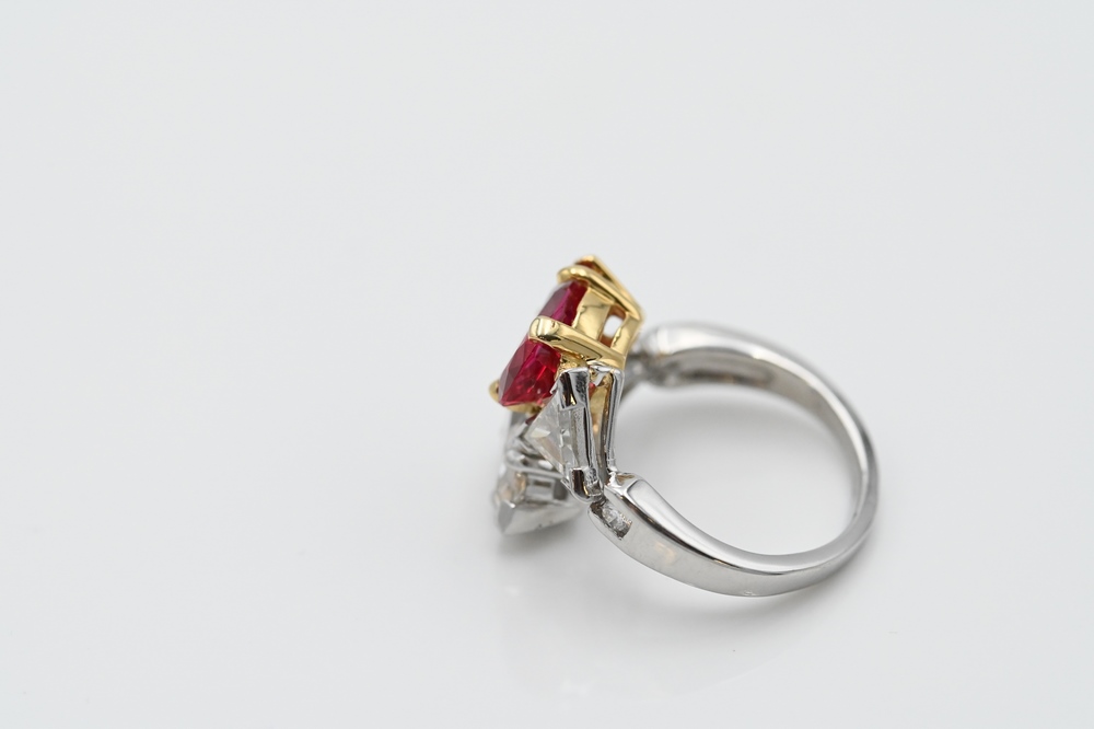 Platinum Ring, set with diamonds and ruby, pear shaped diamond, 1.54 carats; two trillion cut diamonds, .85 carats; lab created ruby, 2.26 carats; along with an appraisal, size 5 3/4.