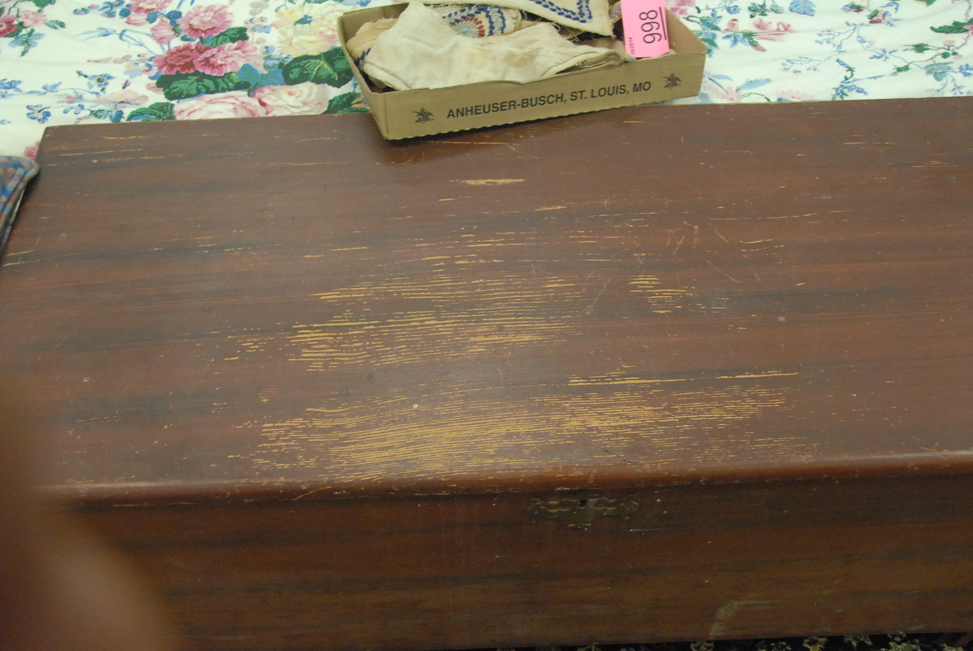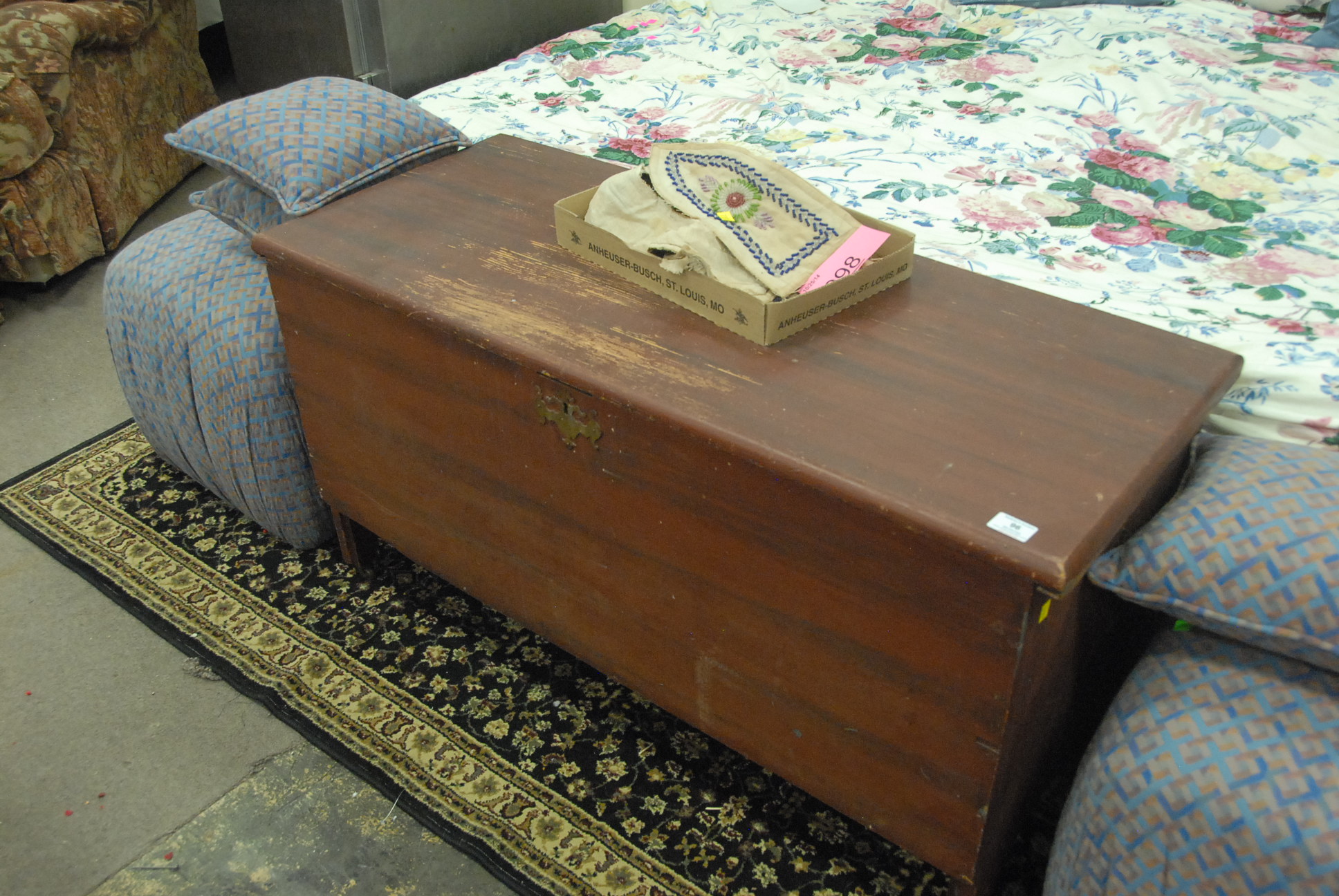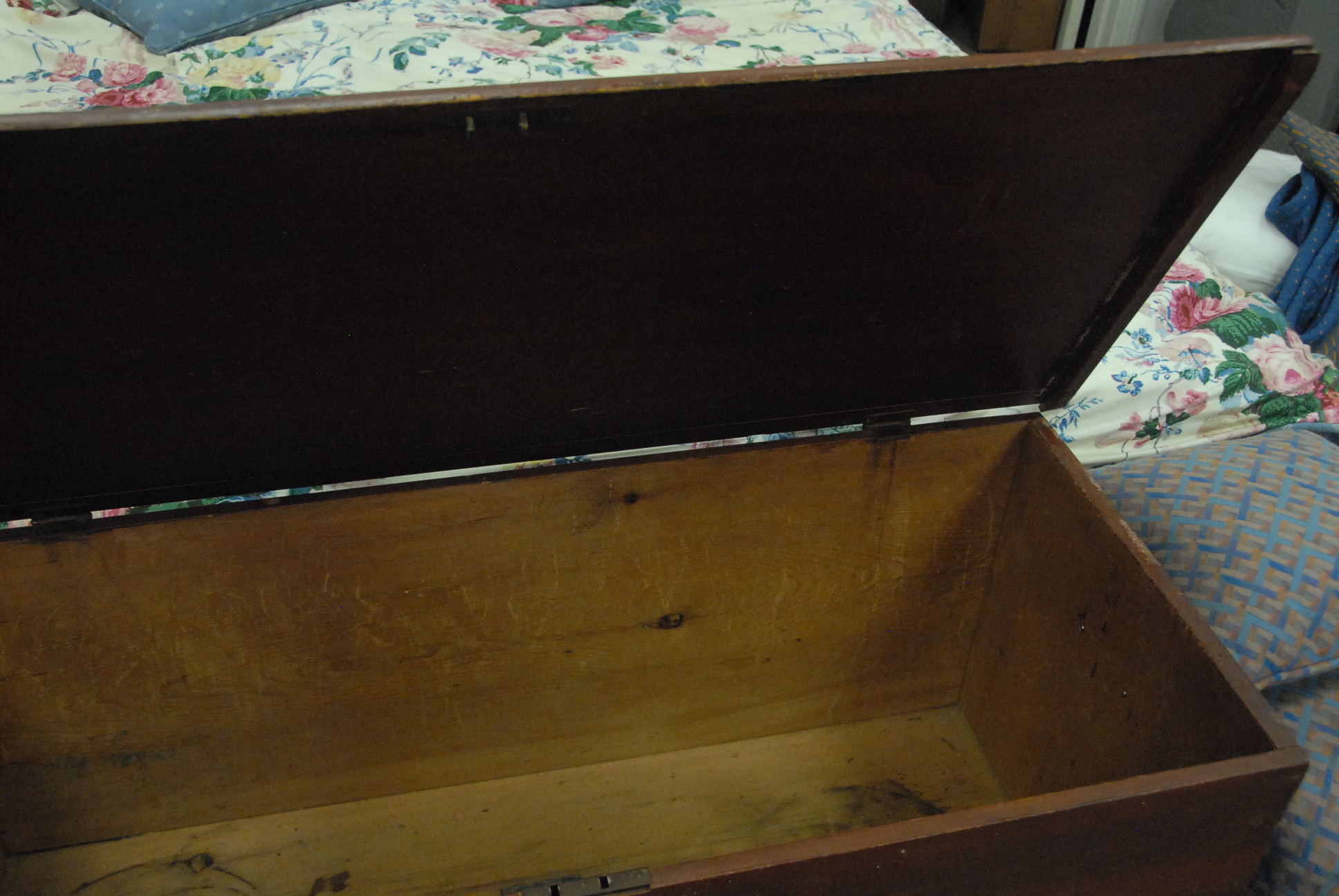 Primitive lift top blanket chest in green paint.ht. 24 in. wd. 45 in.