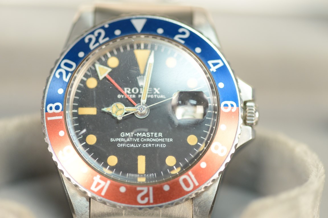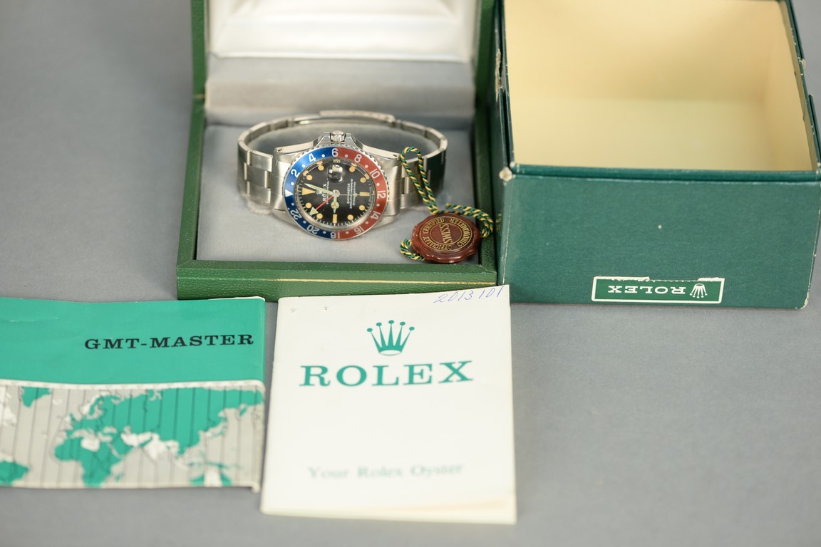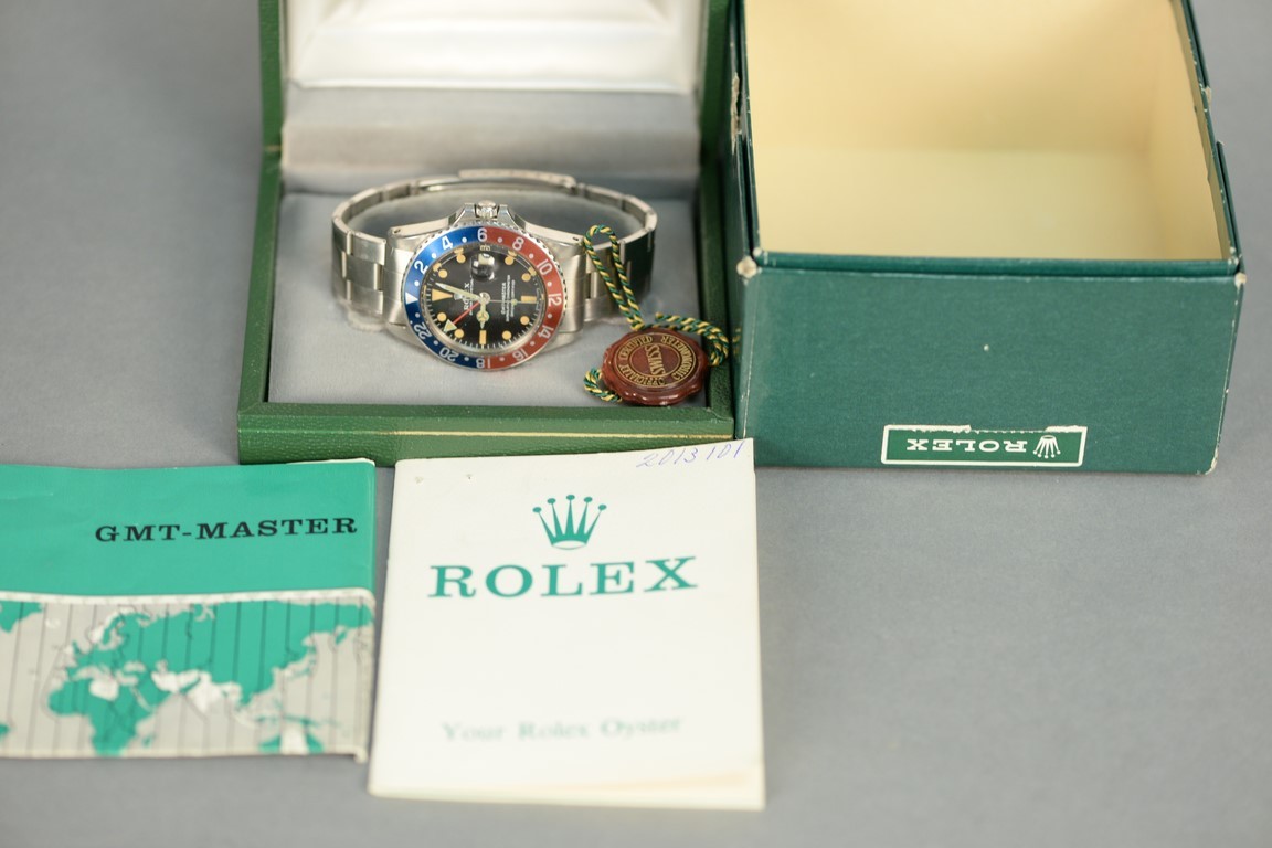 Lot 96: Rolex stainless steel wristwatch GMT Master model 1675, sn-2013101 with original box and papers.